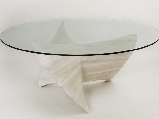 This approach is especially evident in works such as the Erode Console and the N3 Dining Table, where complex sculptural bases are formed through labor-intensive processes that combine craftsmanship with engineering logic. In these pieces, layered wood elements are assembled and carved to produce fluid, rhythmic structures that appear simultaneously architectural and organic. Glass tops often hover above these bases, allowing the sculptural composition beneath to remain visible and visually light.
