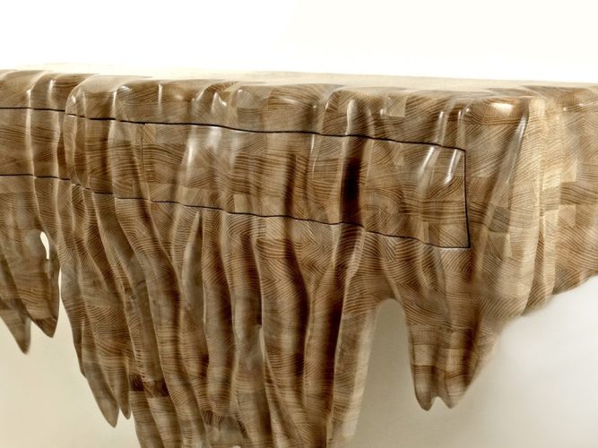 Furniture by Aaron Scott often begins with an investigation into material behavior and structural logic. Wood, metal, and glass are explored not only for their aesthetic qualities but also for their ability to express movement, weight, and tension. Through processes such as stacked lamination, carving, casting, and sculpting, Scott transforms raw materials into forms that reveal layers of geometry and negative space. His designs frequently appear as though they have evolved organically—objects shaped by invisible forces of gravity, erosion, and time.