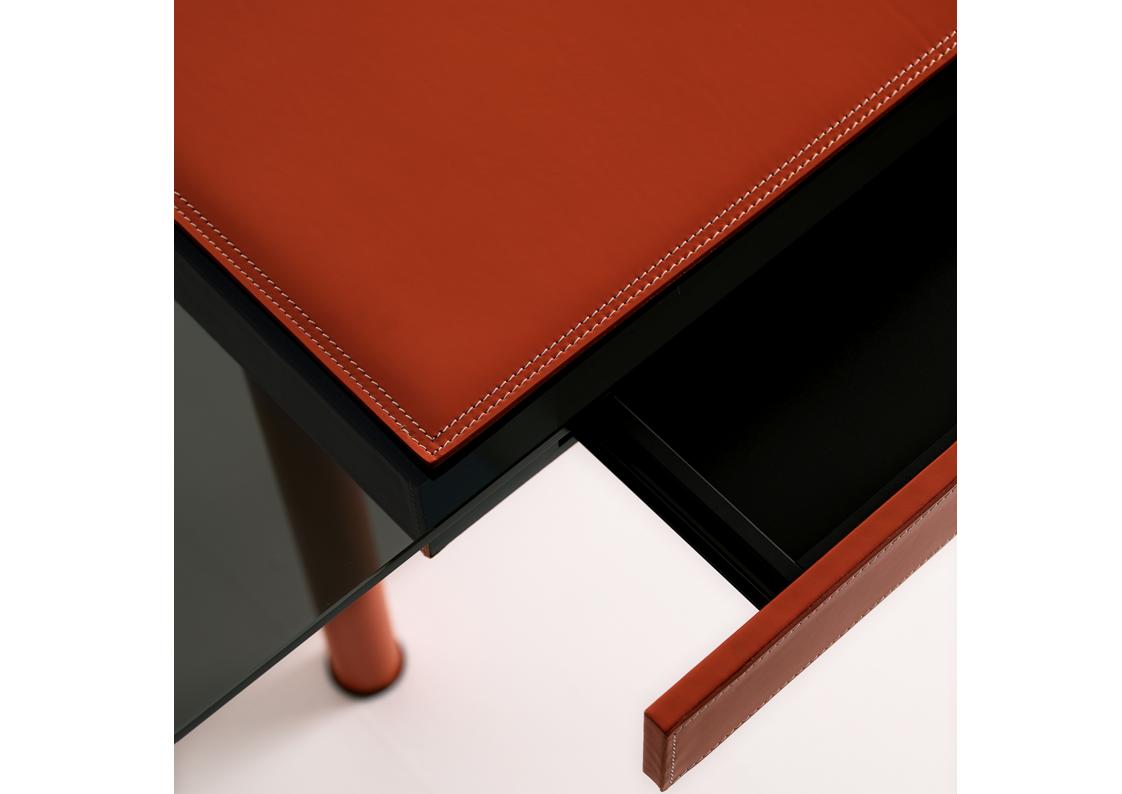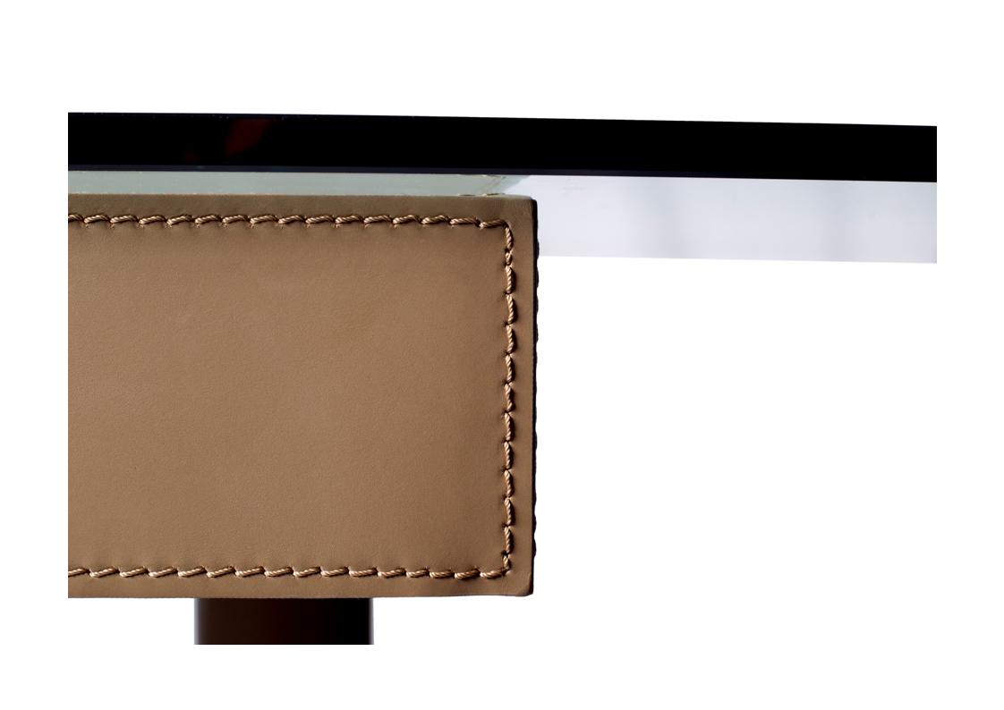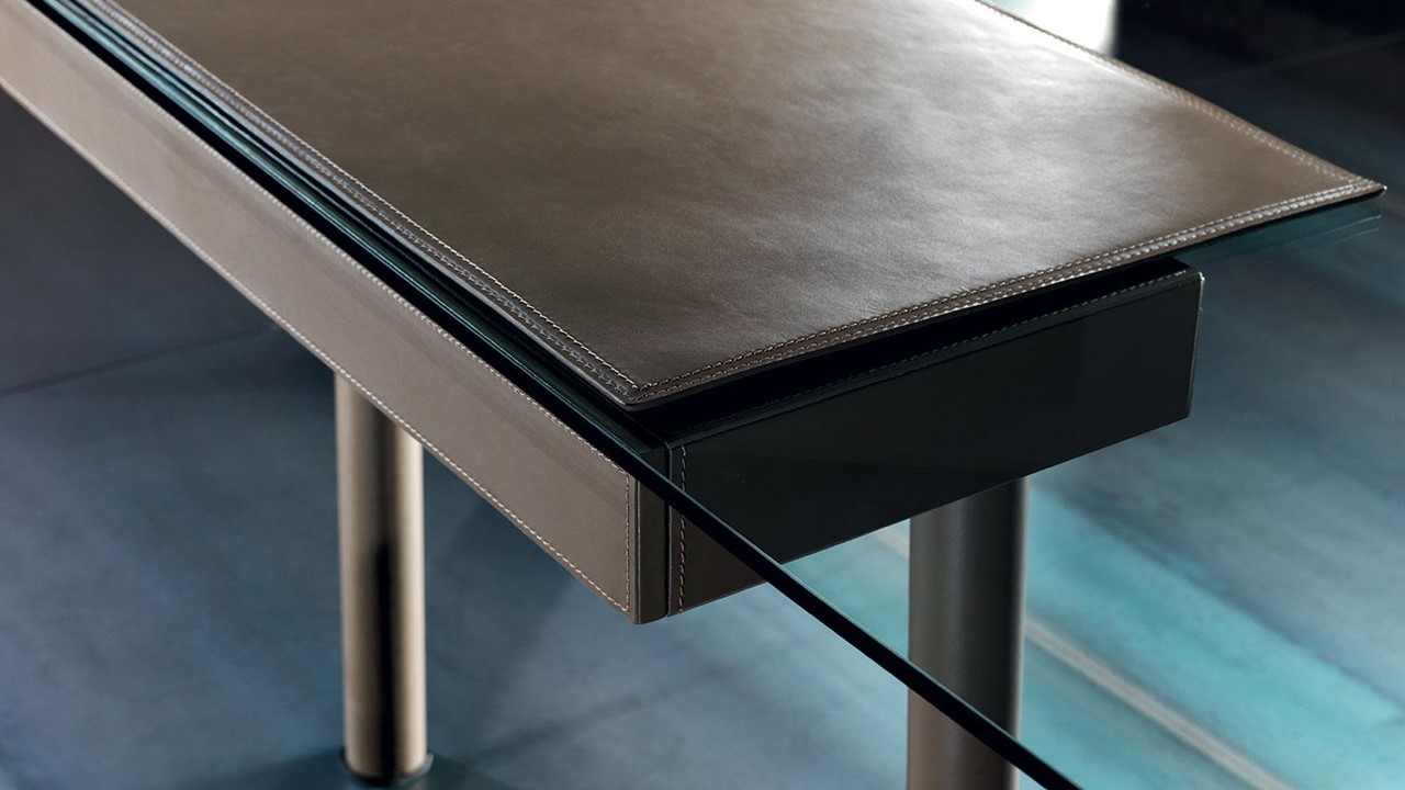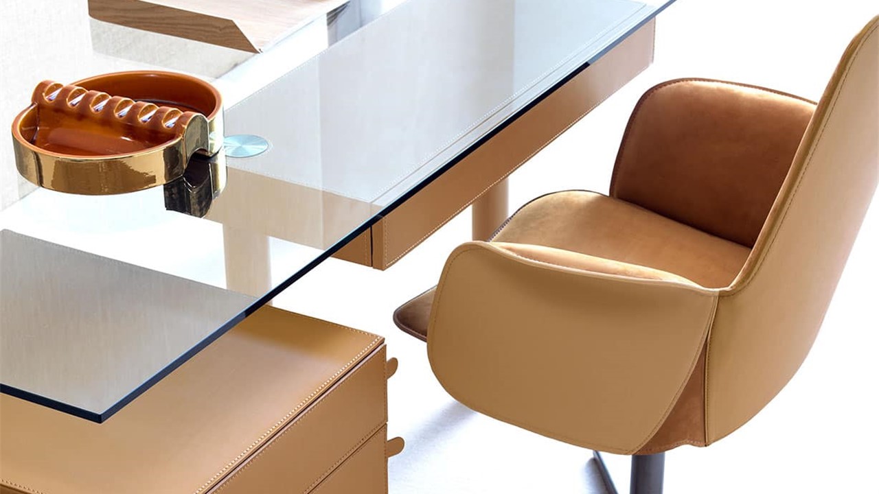 The Abe Saddle Leather Desk is a study in balance and refinement, where Italian craftsmanship meets contemporary sophistication. Its structure pairs front legs in polished stainless steel with back legs elegantly wrapped in full-grain leather, creating a striking contrast of materials and textures. A tempered glass top adds visual lightness, while the leather-clad drawer and desk pad introduce warmth, tactility, and comfort. Each detail reflects meticulous attention to proportion and finish, resulting in a desk that embodies understated power and modern luxury.