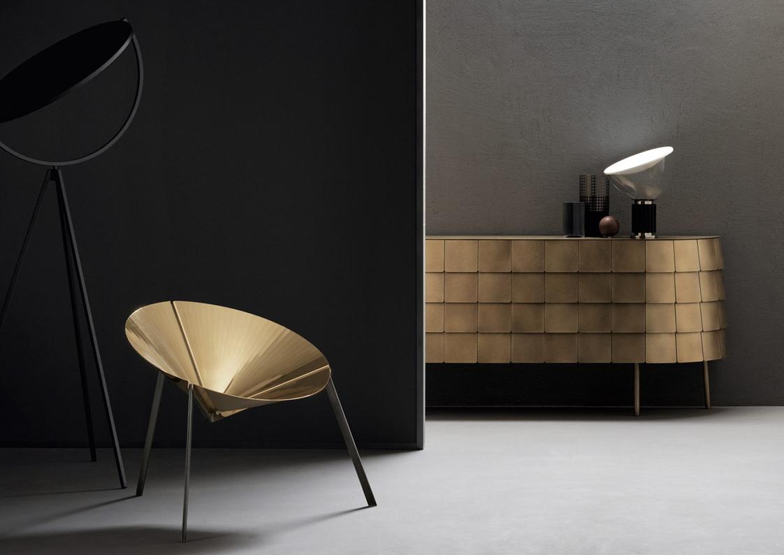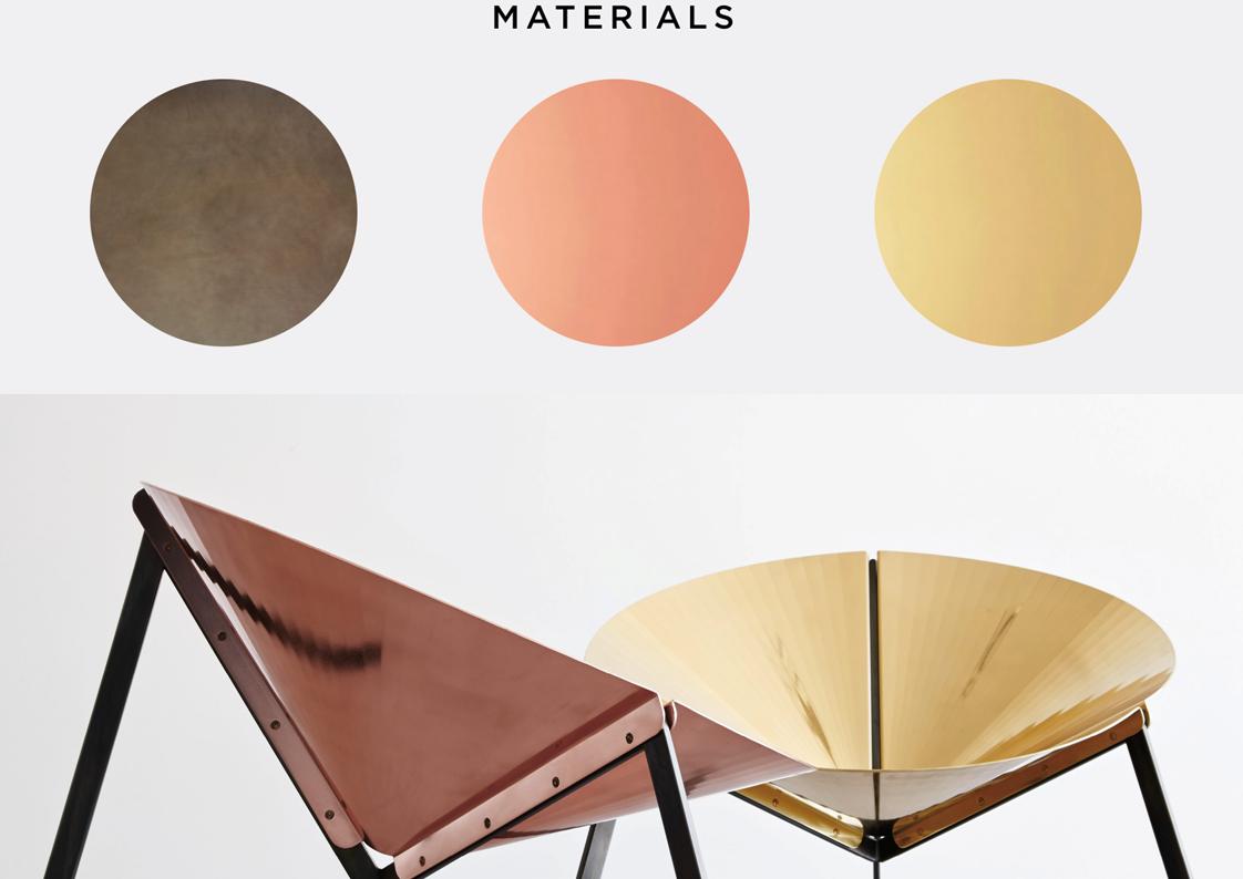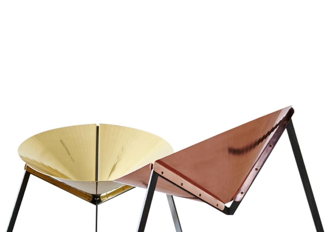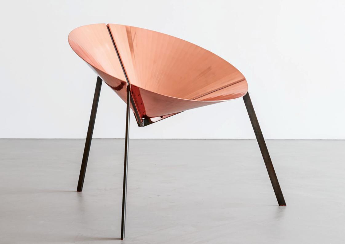 Acapulco (Thinking of Acapulco) is a tribute to the iconic Acapulco Chair of the Fifties. It gives shape to a new understanding of what a chair is, starting from sheet metal shaped entirely by hand, fold after fold. Three iron legs support the seat, formed by three sections in shiny copper, steel, or brass, enlivened by the refraction of light on each facet sculpted on its surface. The product is an execution of craftsmanship, expertise, and virtuosity, this chair challenges durable metal to become welcoming, even transforming iron into the most flexible of materials. by private commission only – please inquire.