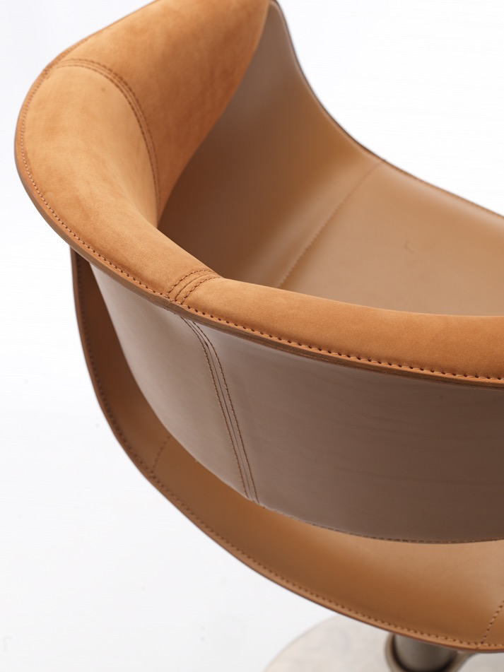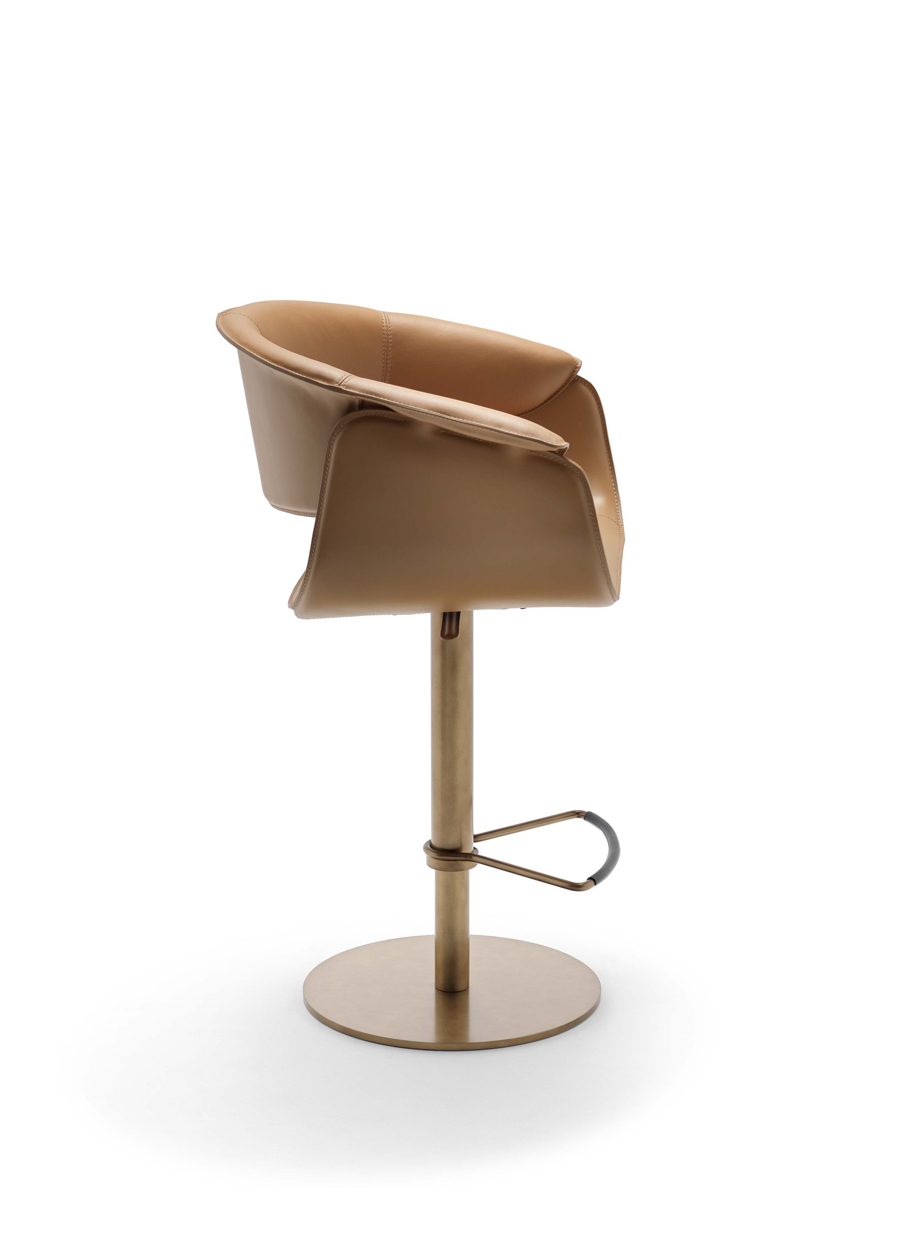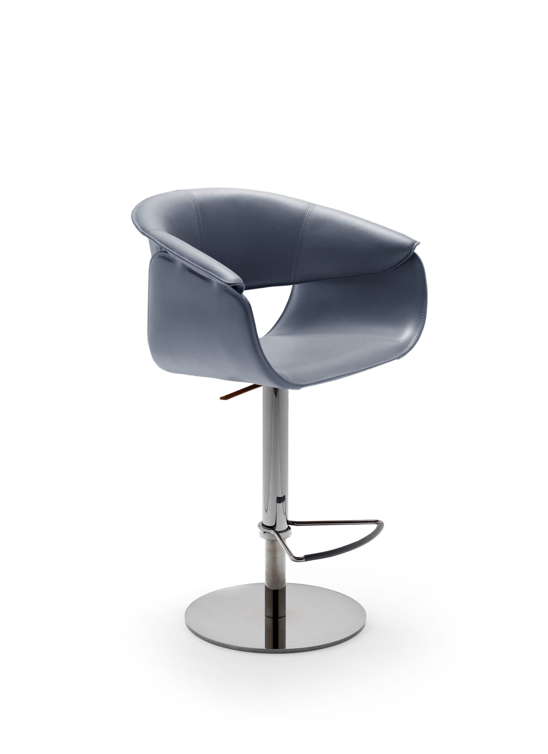 The Air Barstool is a stylish swivel barstool featuring a sturdy steel frame, a leather-upholstered seat, and a padded leather back for added comfort. It is designed with a steel disc base that includes a footrest and offers gas height adjustment, making it suitable for various heights. The barstool is available in either a powder-coated or galvanized finish.