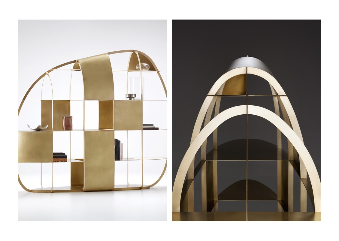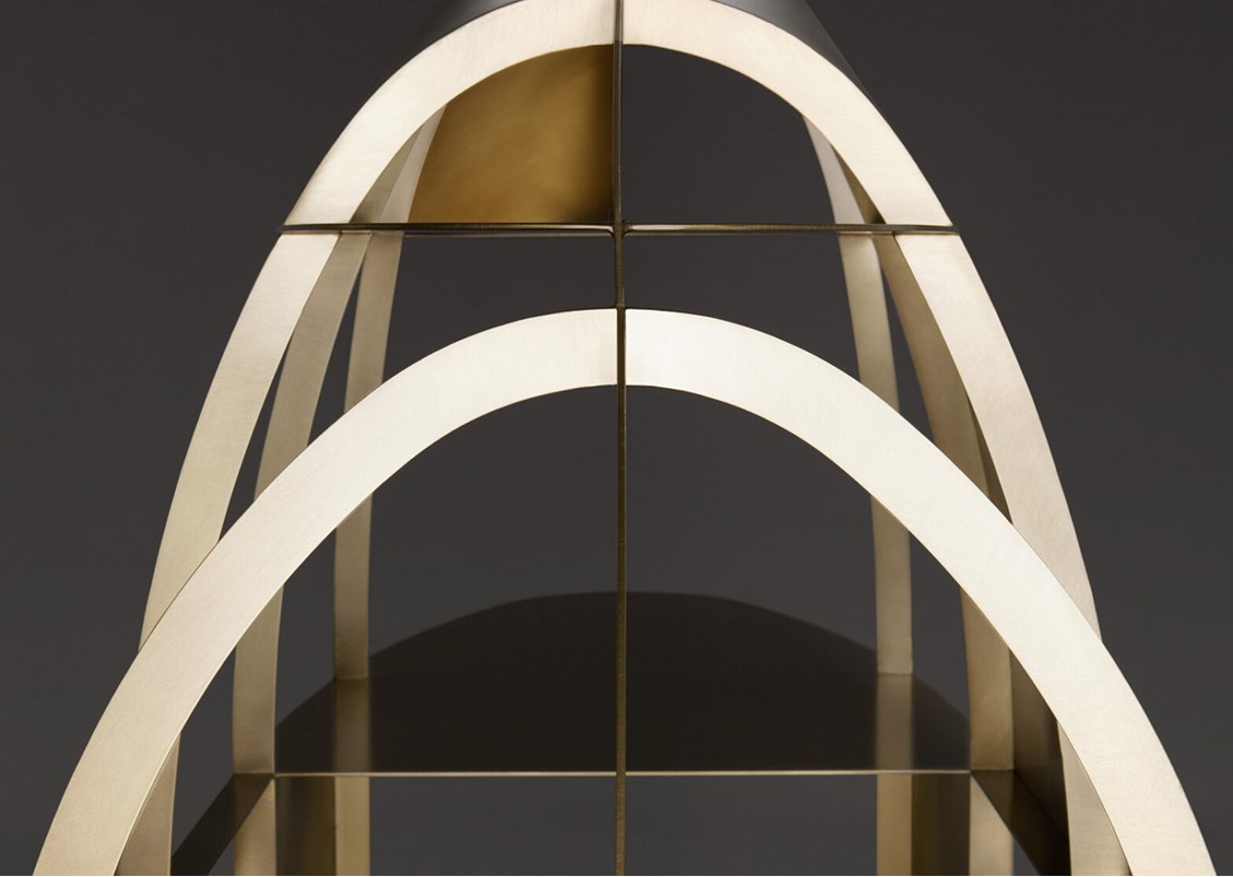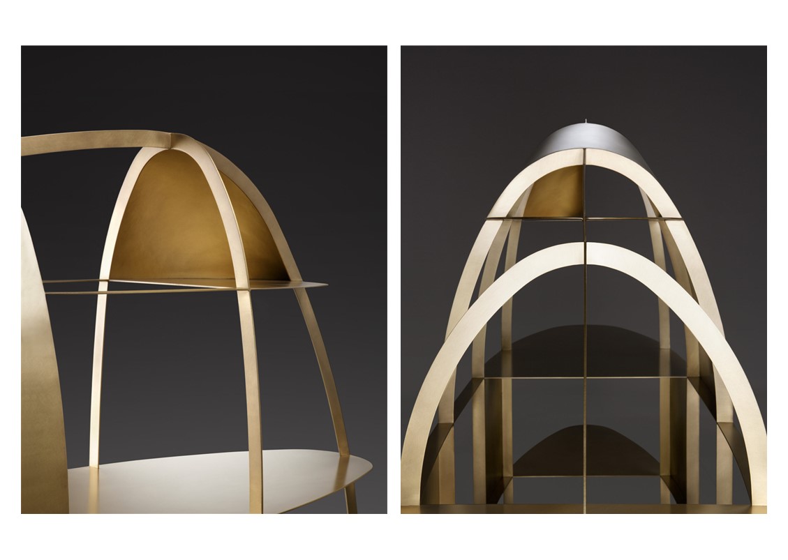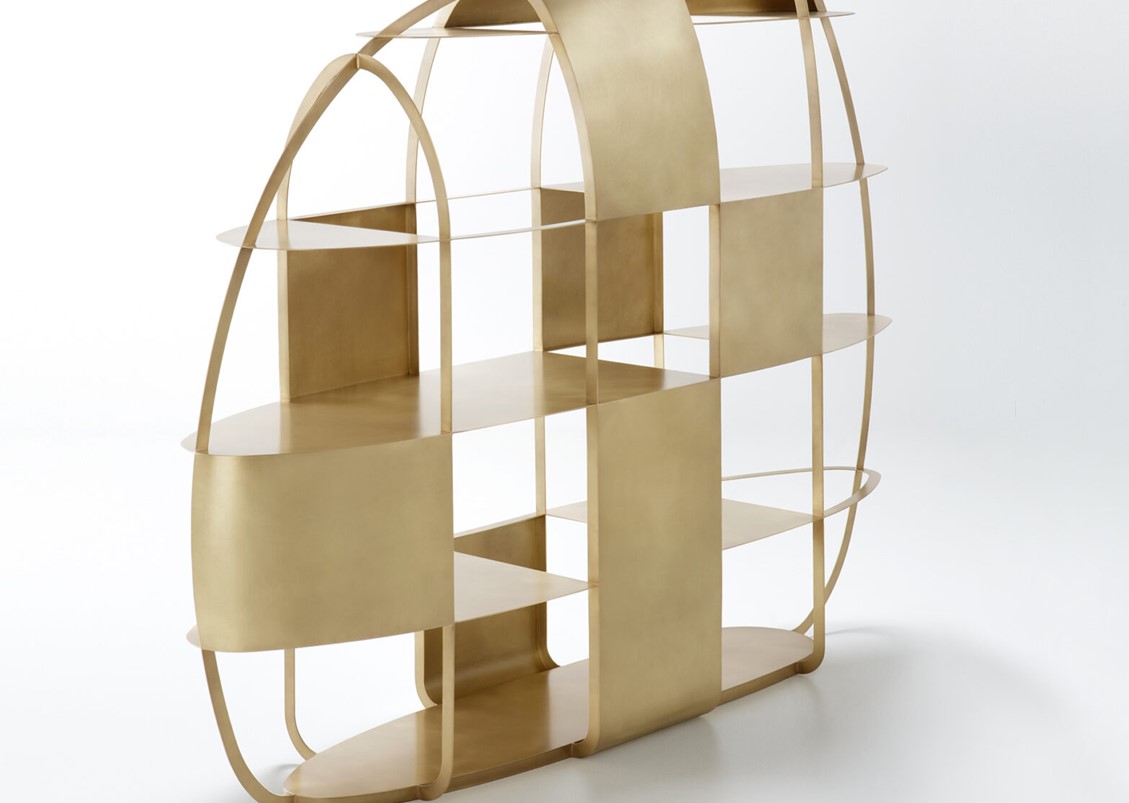 The Airframe Bookcase celebrates the art of hammered metal, highlighting the savoir-faire and artisan virtuosity that epitomizes innovative, cutting-edge design. Its aerodynamic shape outlines a fine metal structure made of asymmetrical elliptical loops, supporting four discontinuous horizontal shelves. The outer shell is composed of a partial covering that has been expertly shaped to the structure. Micro architecture makes any space more refined, adding a dramatic element to interiors. Available in brushed brass