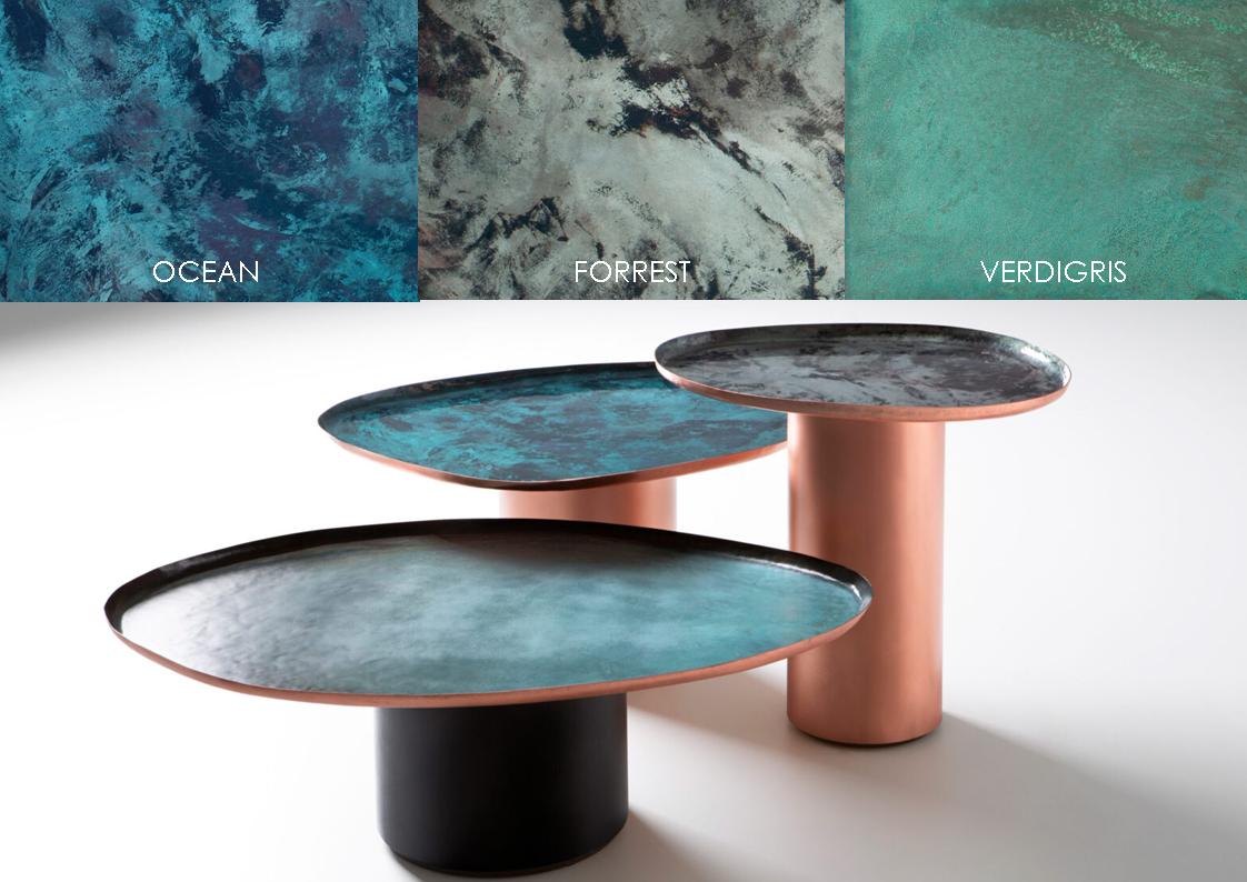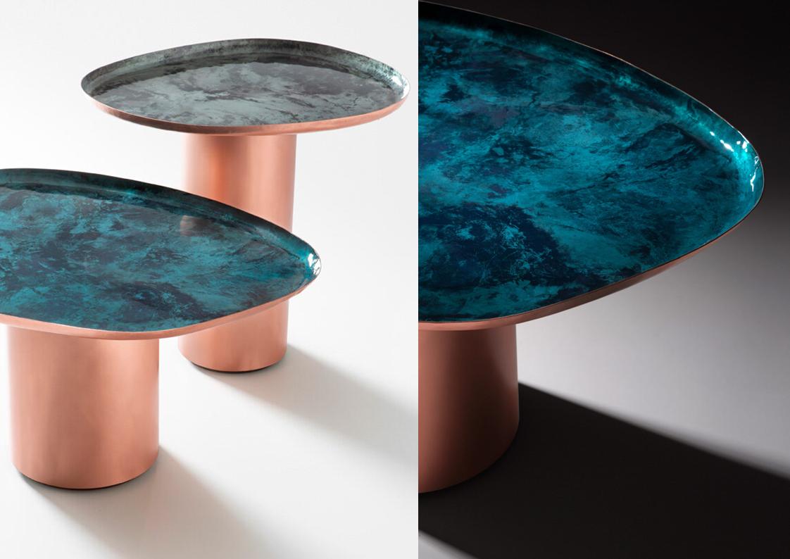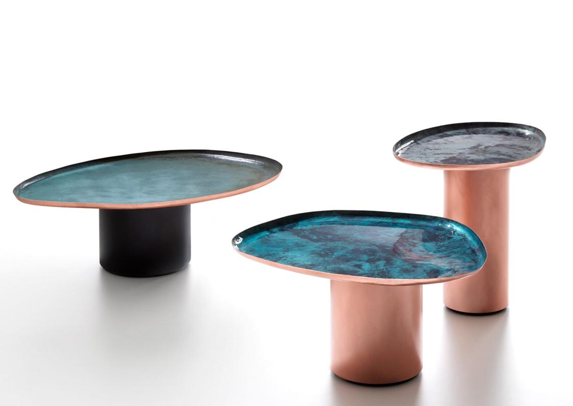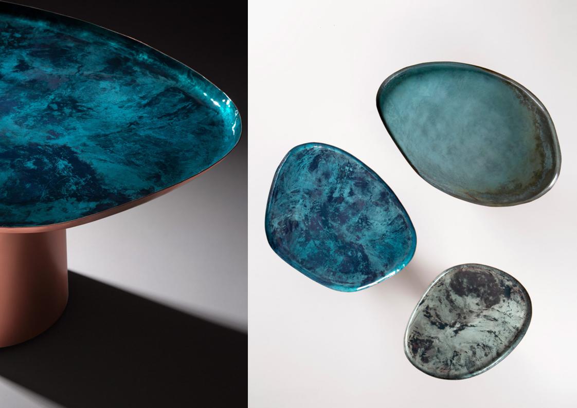 Aqua Drops is a family of coffee tables in three different sizes, inspired by the unexpected, irregular shapes of water droplets on a surface. Their soft, familiar lines embody the skilled craftsmanship and artisan know-how that has revived the traditional technique of manually hammering and shaping copper. The tables are thus a nod to a tradition that, given a contemporary interpretation, is manifested in products that harmoniously integrate with everyday settings. The unique + innovative finishes further enhance the copper tops, giving each piece an organic, natural look through the combination of fire, oxidation + pigments. by private commission only – please inquire.