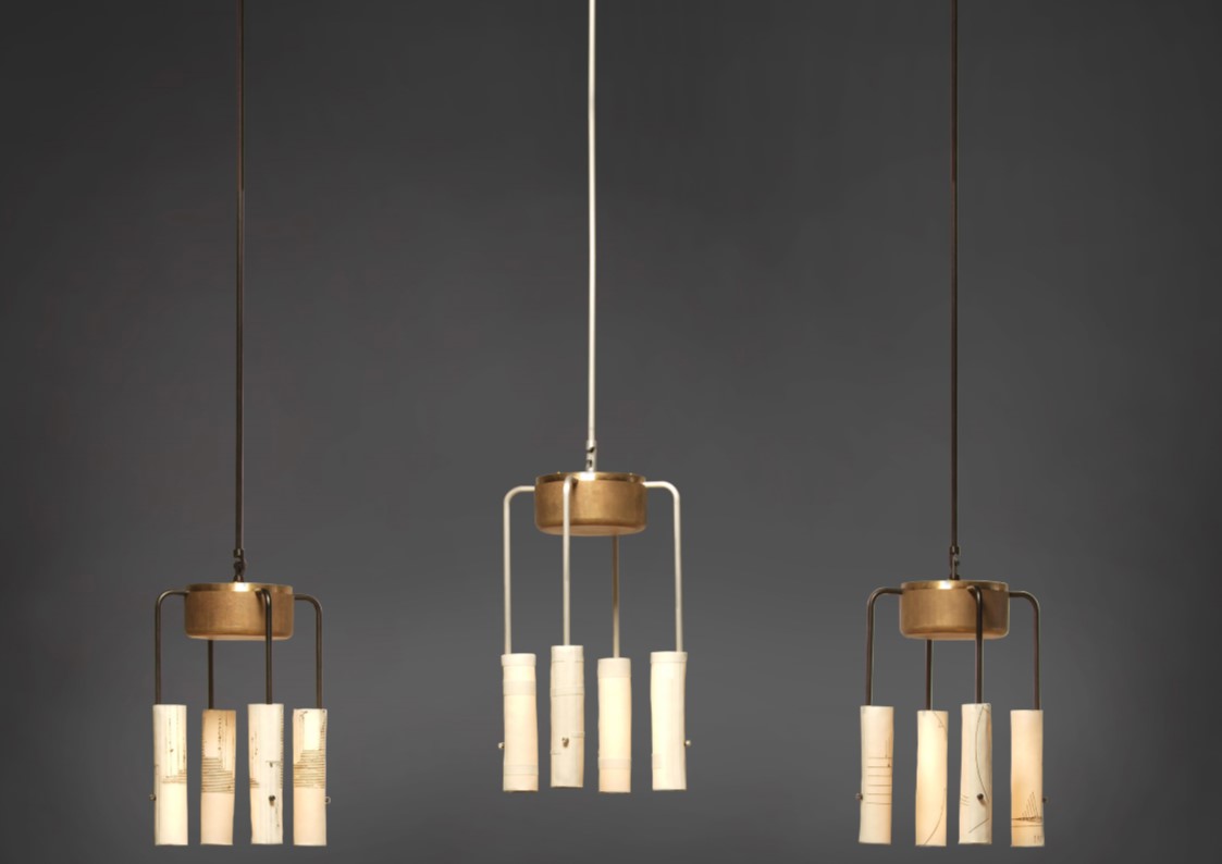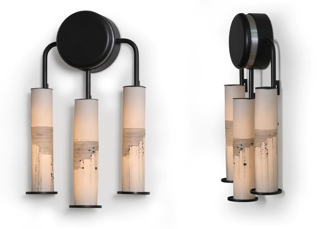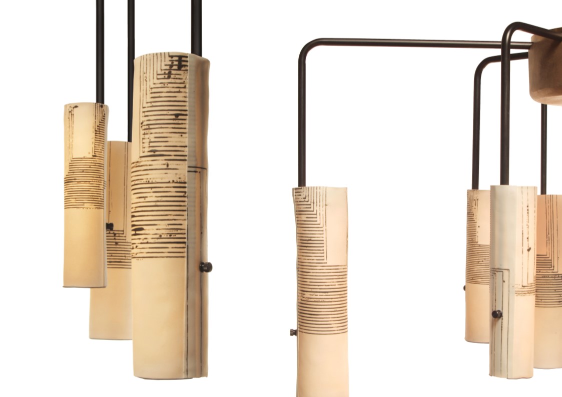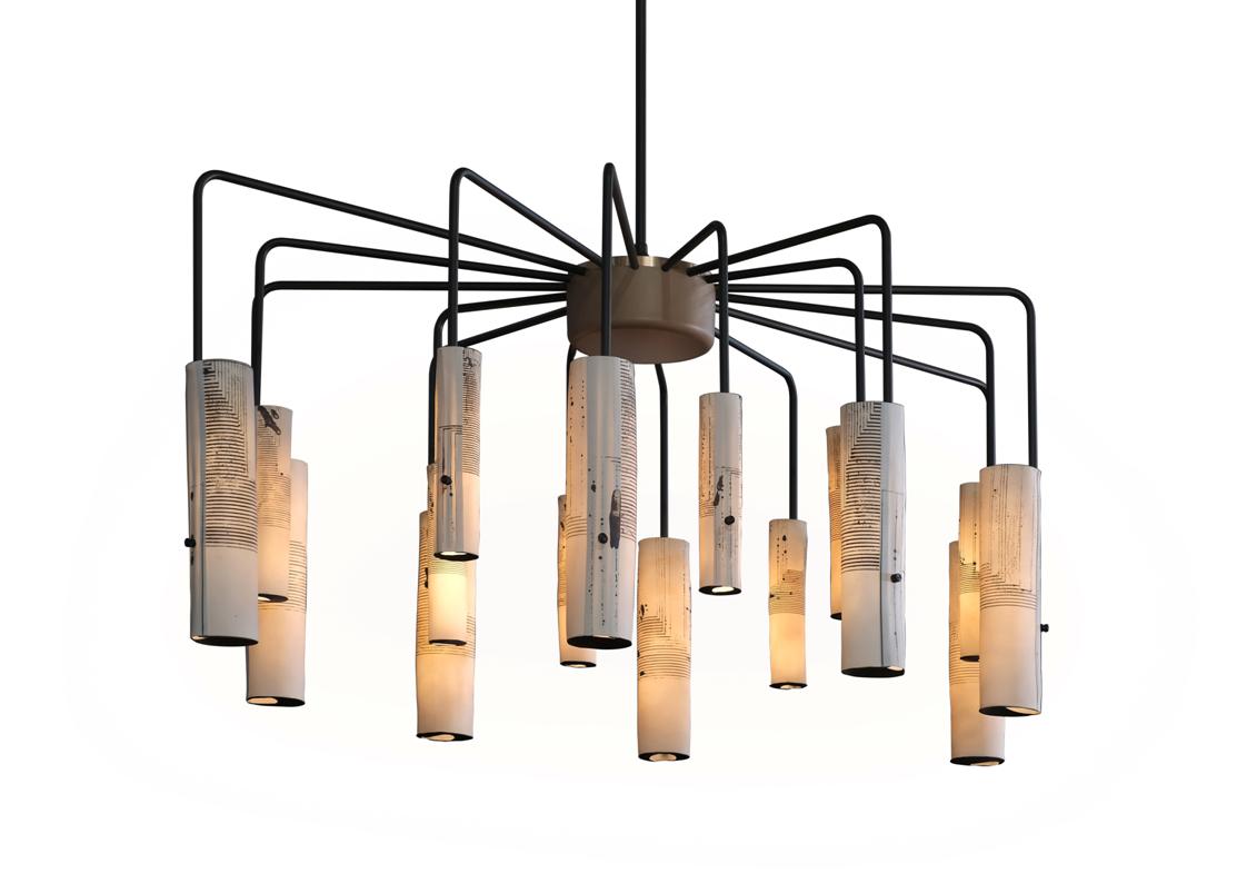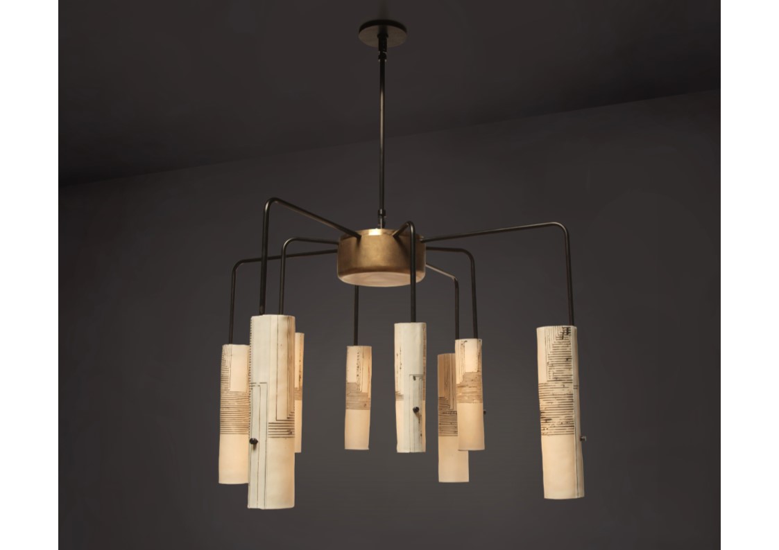 Jacob Marks teamed up with American porcelain artist, Mimi Logothetis, in the development of Skram’s Arak Lighting Series. The translucent, beautifully inconsistent quality of Logothetis’ hand-forming techniques, along with the artist’s application of distinctive surface treatments and graphics, was the focus of the exploration. In the final products, Logothetis’ perfectly imperfect cylindrical forms glow–delicate and graceful–upon Marks’ thoughtfully designed, carefully proportioned bronze and aluminum armature to striking effect. Individually hand-formed, translucent porcelain diffusers with four decorative options: graphics, patches, naked, textured. machined aluminum arms in blackened or clear finish. Available in chandelier, pendant and floor-lamp styles.
