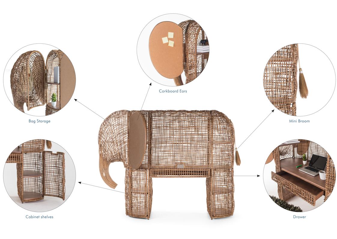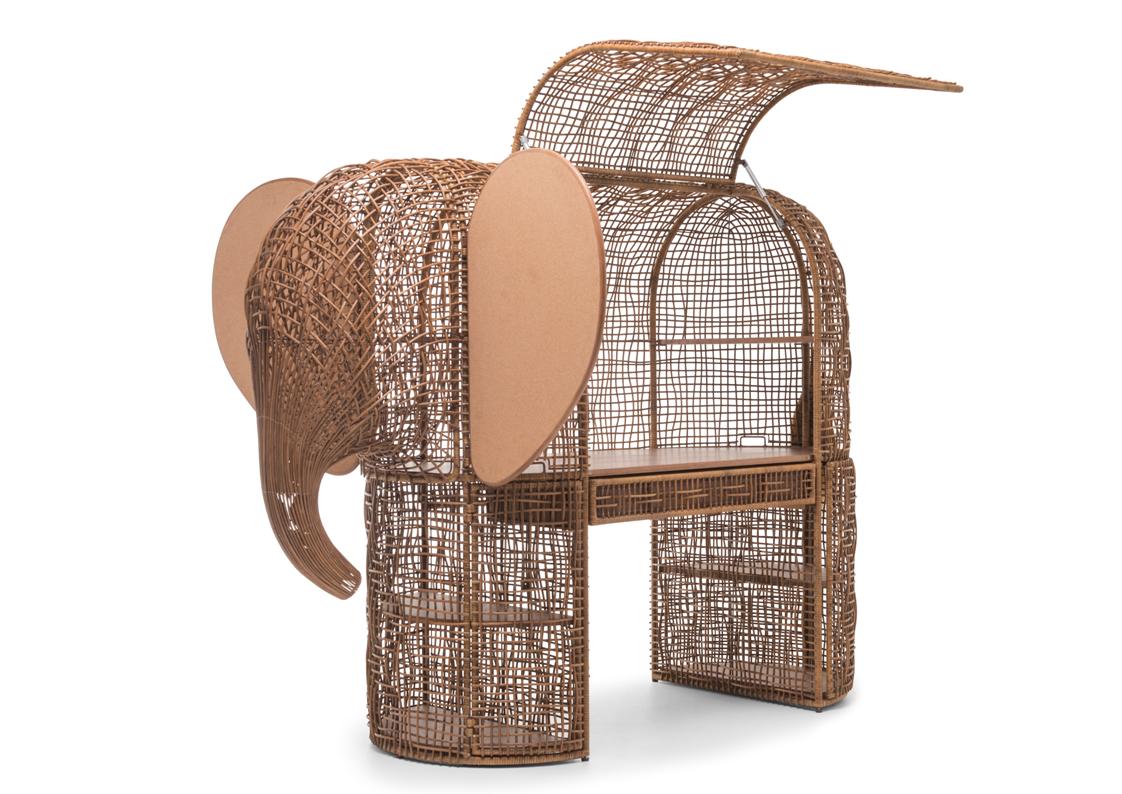 The Babar Children’s Workstation is part cabinet and part study. The majestic frame of Babar is wrapped with a unique weaving pattern inspired by the rough texture of elephant skin. This piece evolves into a working desk with a drawer and several compartments for all of your work station essentials and treasures.