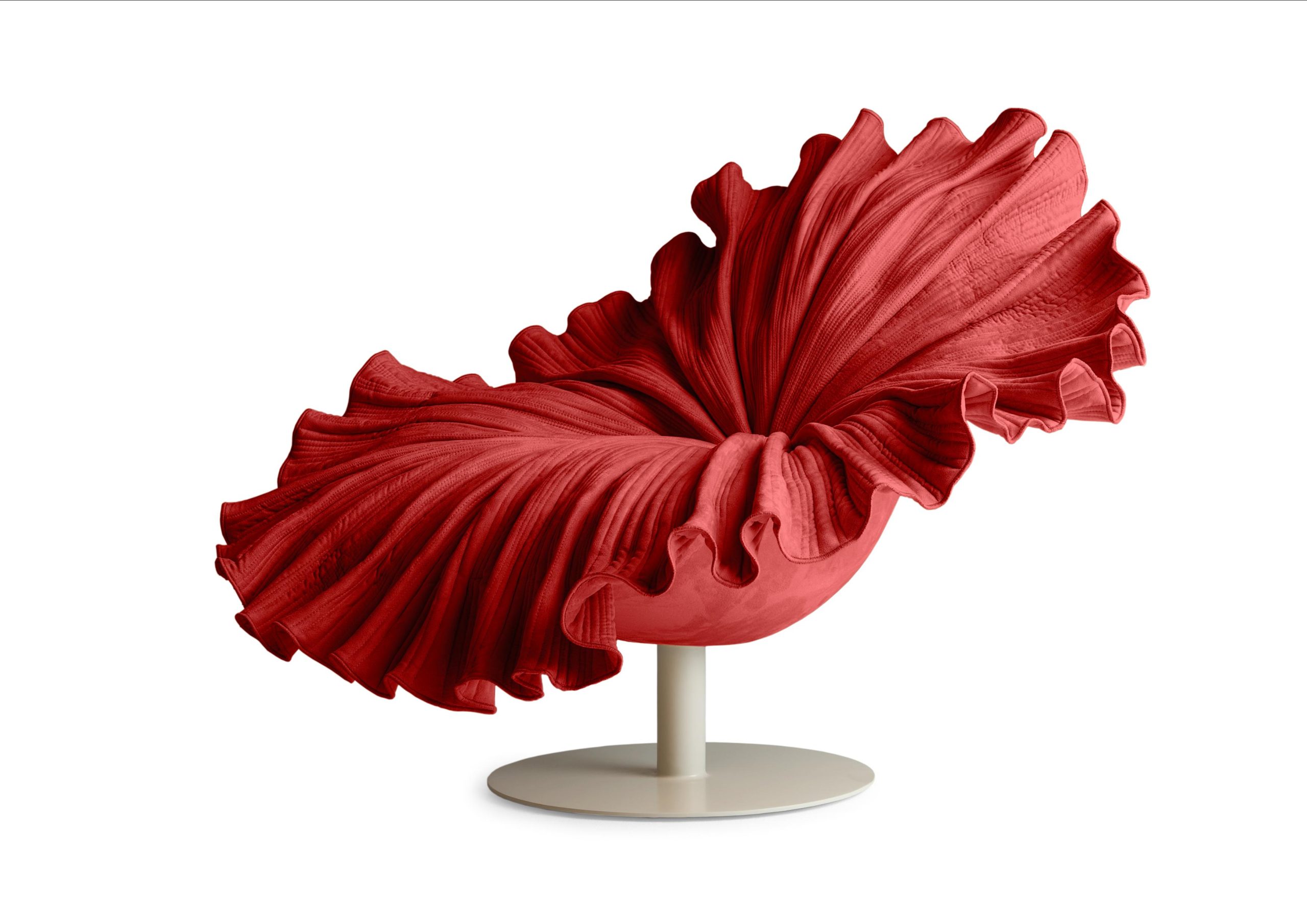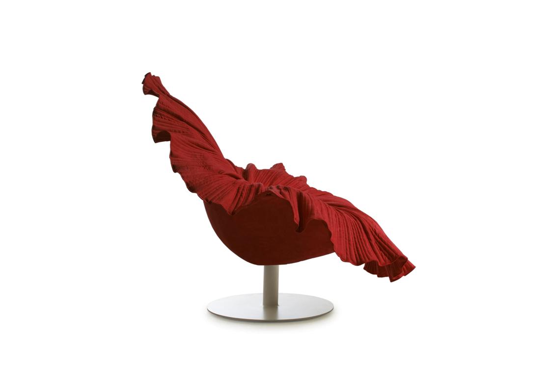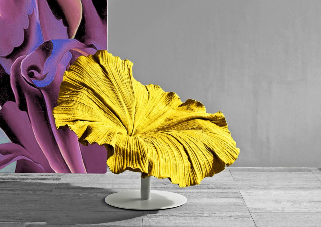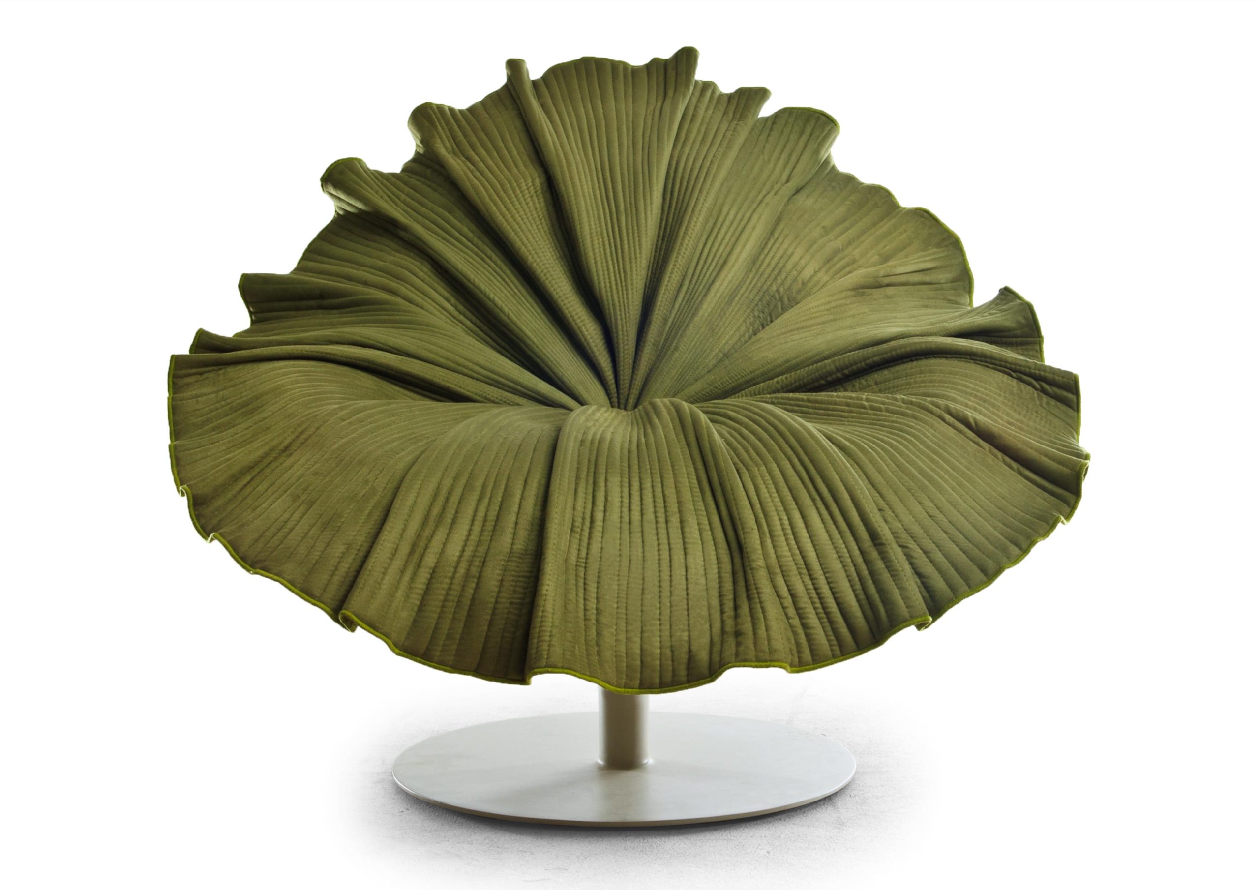 The Bloom Lounge Chair by Kenneth Cobonpue welcomes the organic beauty of the garden indoors. Inspired by a delicate blossom, the Bloom is composed of hundreds of fine running stitches that radiate from the center of the seat. Handmade in microfiber stitched over a fiberglass reinforced top, Bloom sprouts from a base made of steel.