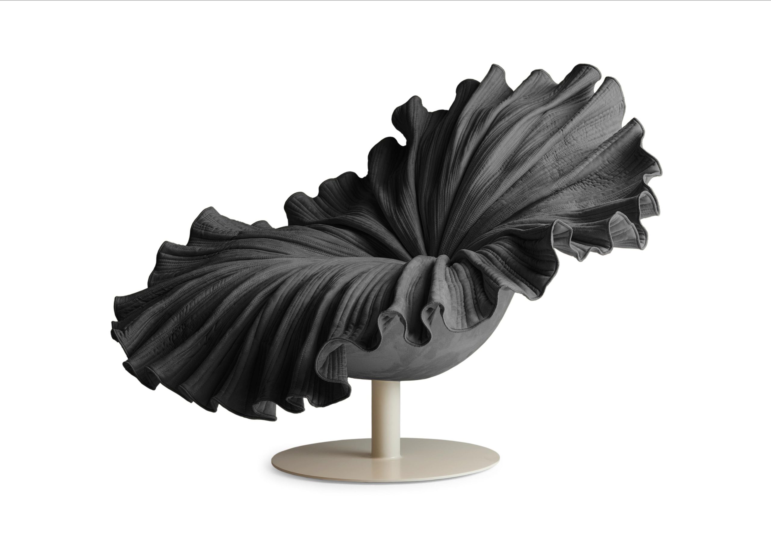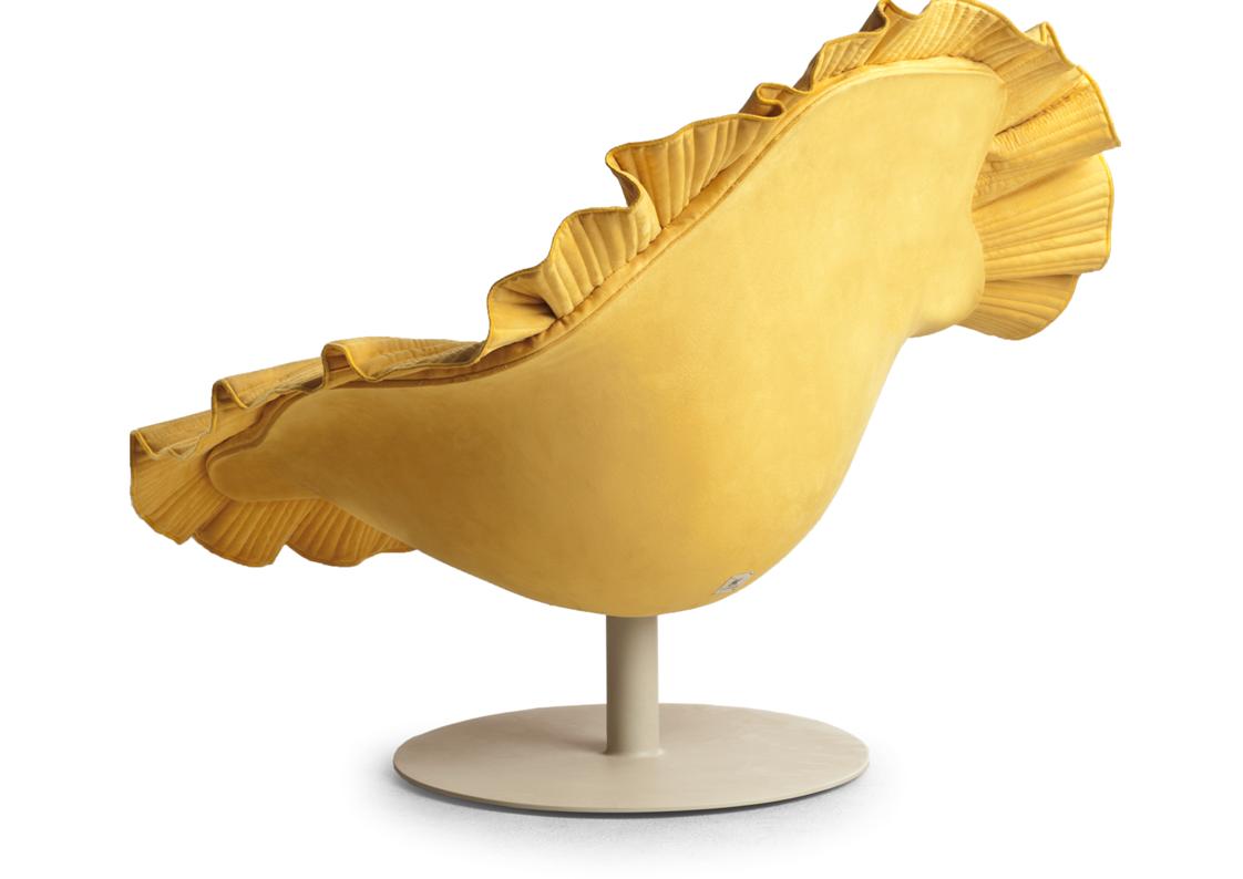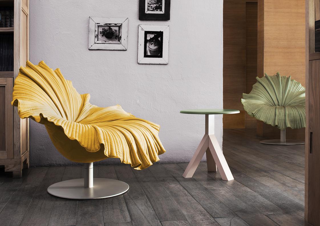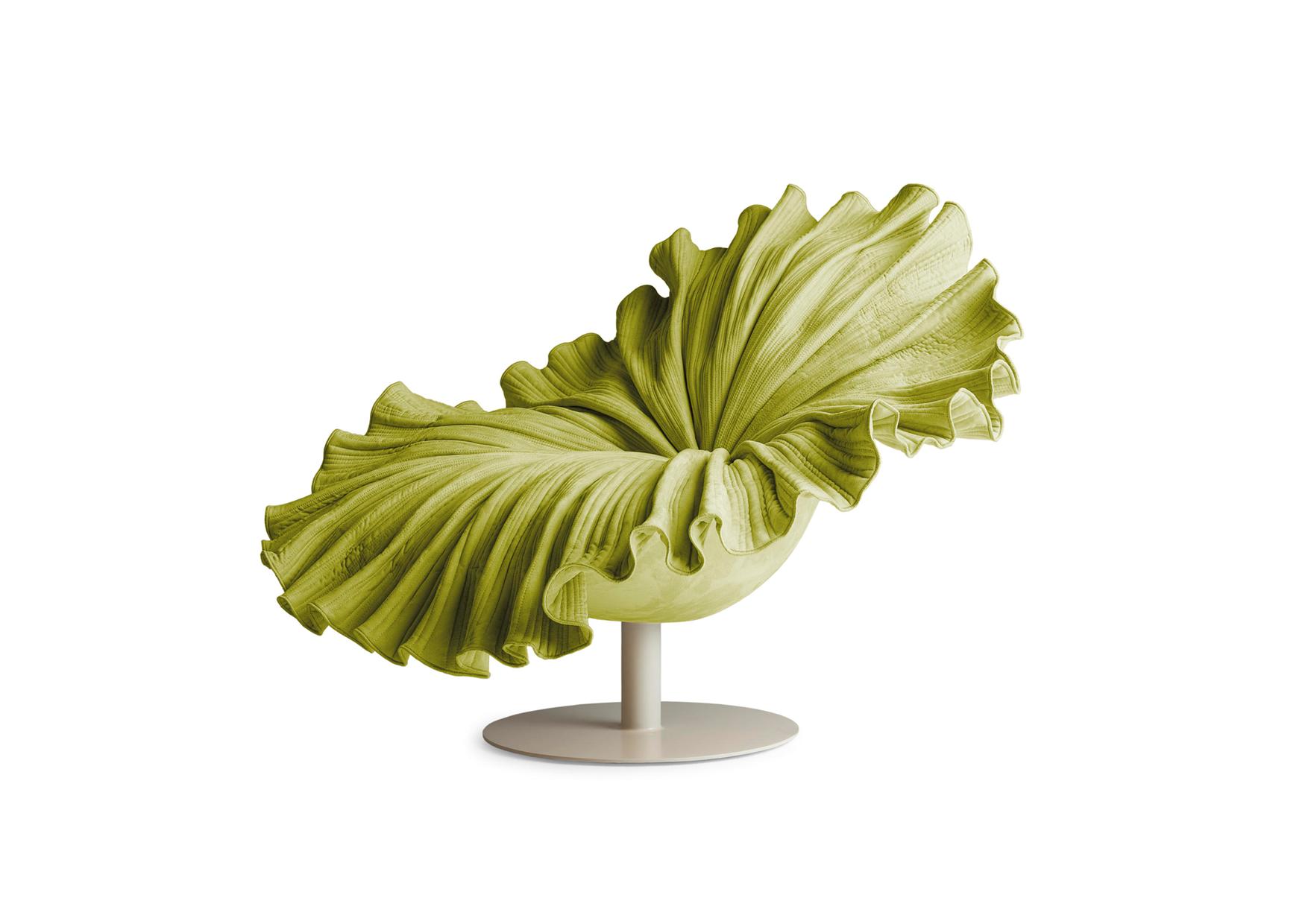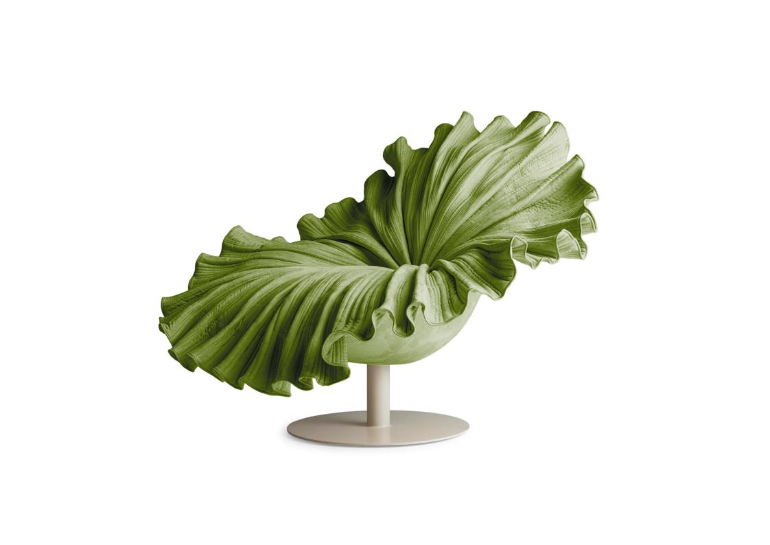 The Bloom Lounge Chair by Kenneth Cobonpue welcomes the organic beauty of the garden indoors. Inspired by a delicate blossom, the Bloom is composed of hundreds of fine running stitches that radiate from the center of the seat. Handmade in microfiber stitched over a fiberglass reinforced top, Bloom sprouts from a base made of steel.