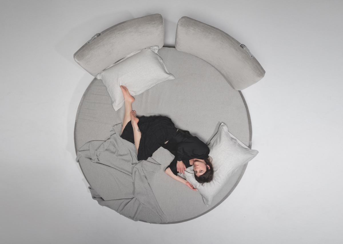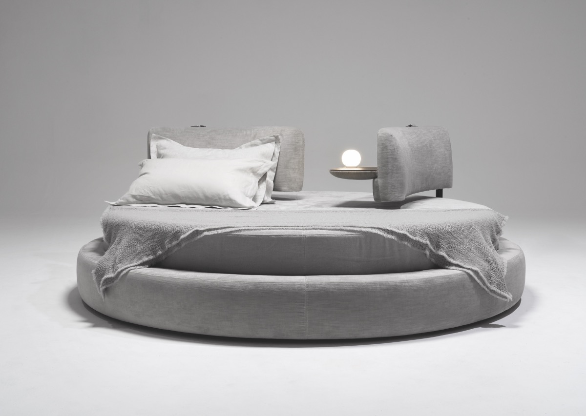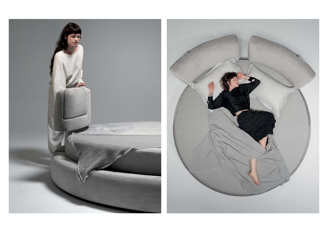 The Bordone Bed is an oasis that offers relaxation at all times of the day. Ideal for furnishing metropolitan lofts and studios, it brings together the function of the bed, sofa, chaise longue + home office. Mattress + sheets available (please inquire). Headboard is adjustable in four positions with a locking mechanism and is covered in polyurethane and polyester fiber. The two headboards are equipped with leather handles in the color coordinated to the covering and allow the displacement of the headboard. Mattress support top with perforated wooden shelves for correct ventilation.