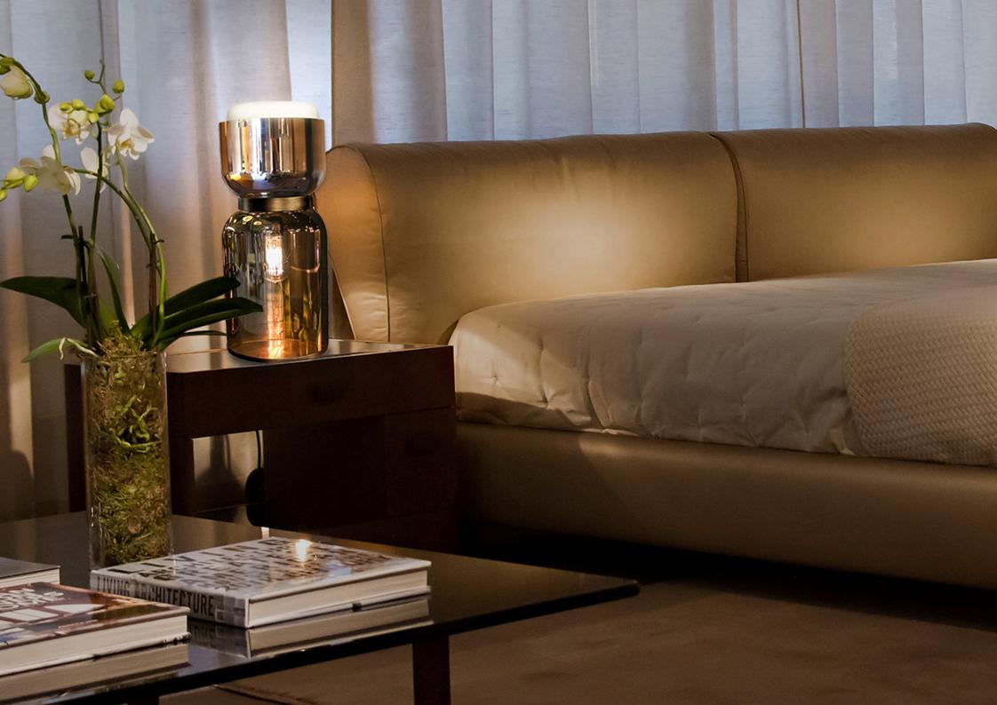The Clessidra Table Lamp Series is available in two sizes – the body finish is available in a chrome or light satin bronze with a diffusing lower glass section in your choice of polished chrome, black chrome or bronze. The Clessidra simultaneously filters and contains the light through the use of mirrored glasses – double on-off switch for a dual effect: light and emotions.
