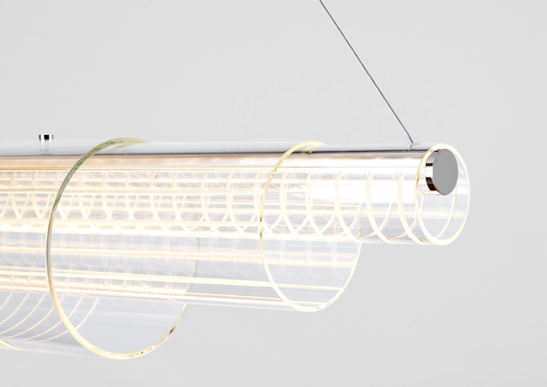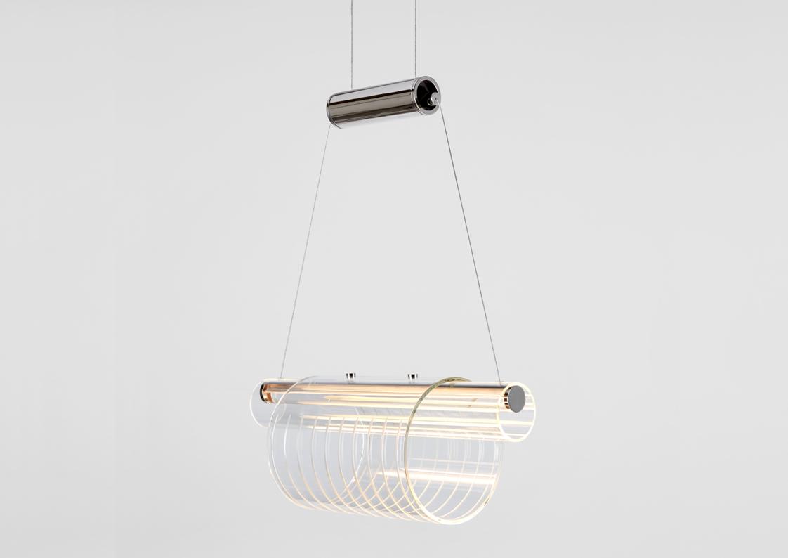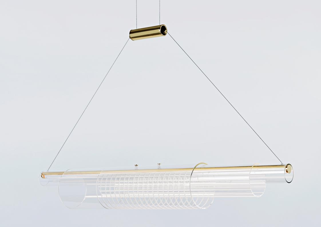 Coax is a coalescence of metal, glass, and light. The materials hang serenely, appearing weightless against each other. Cylindrical echoes of transparent glass surround a tube of light suspended in air.