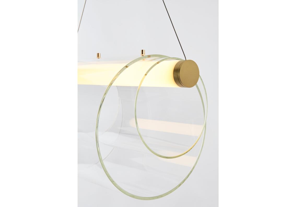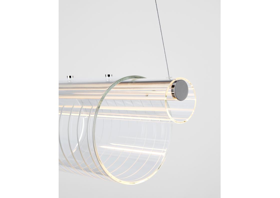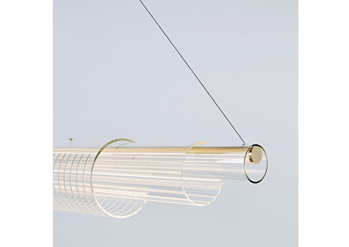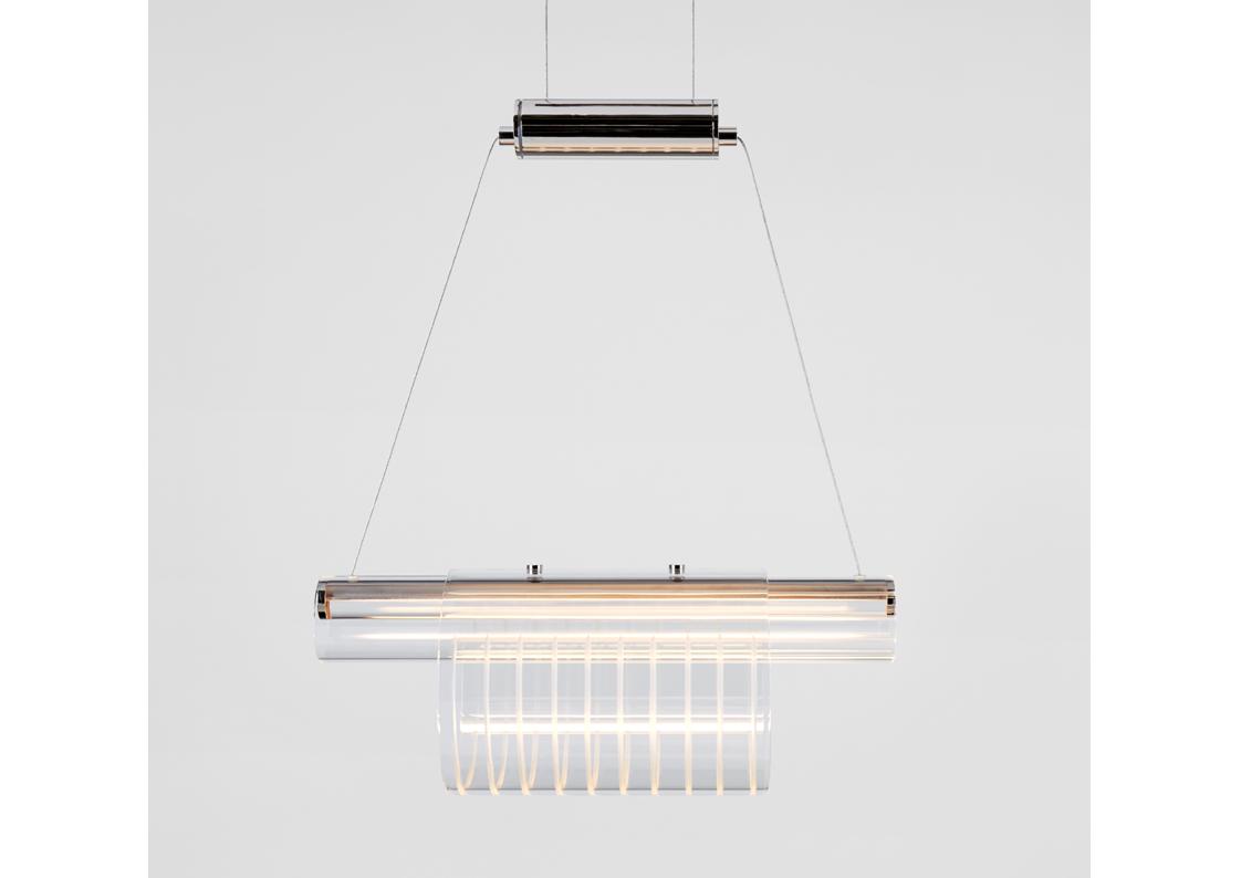 Coax is a coalescence of metal, glass, and light. The materials hang serenely, appearing weightless against each other. Cylindrical echoes of transparent glass surround a tube of light suspended in air.