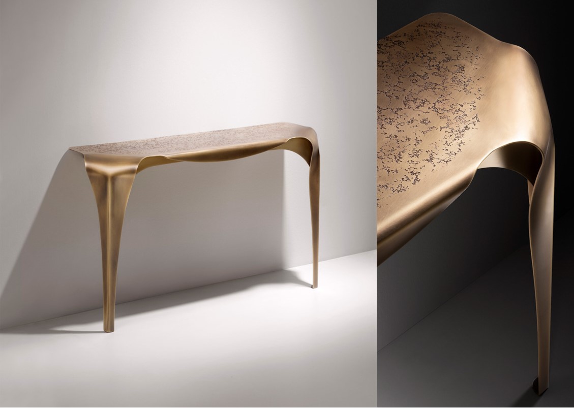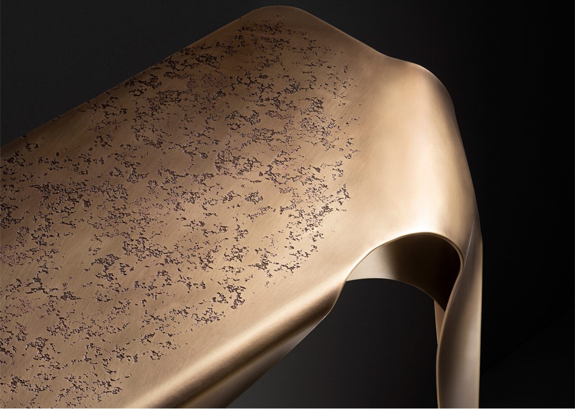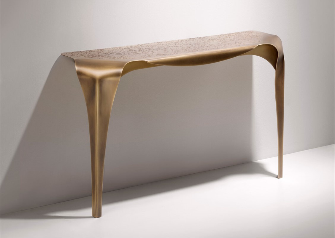Inspired by the table of the same name, the Convivium console leans against the wall with a curvy and graceful attitude. Entirely made of brass, this piece stands out for the DeErosion finishing of the top and the flowing movement of its curved legs.