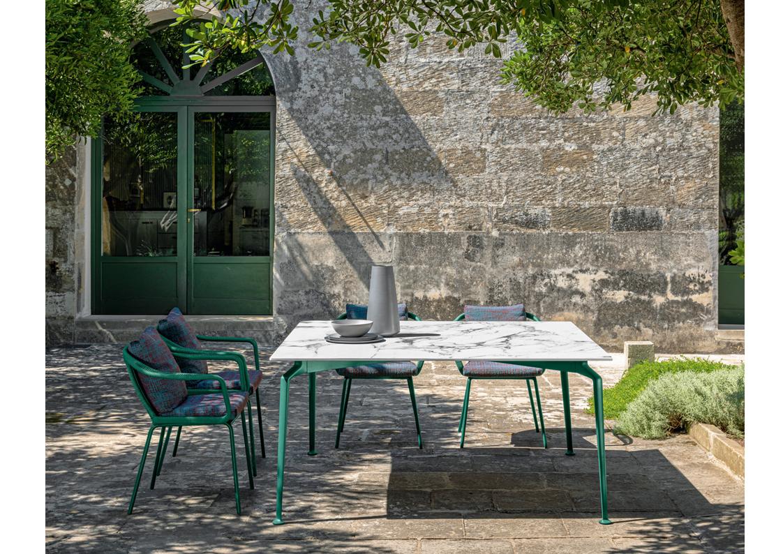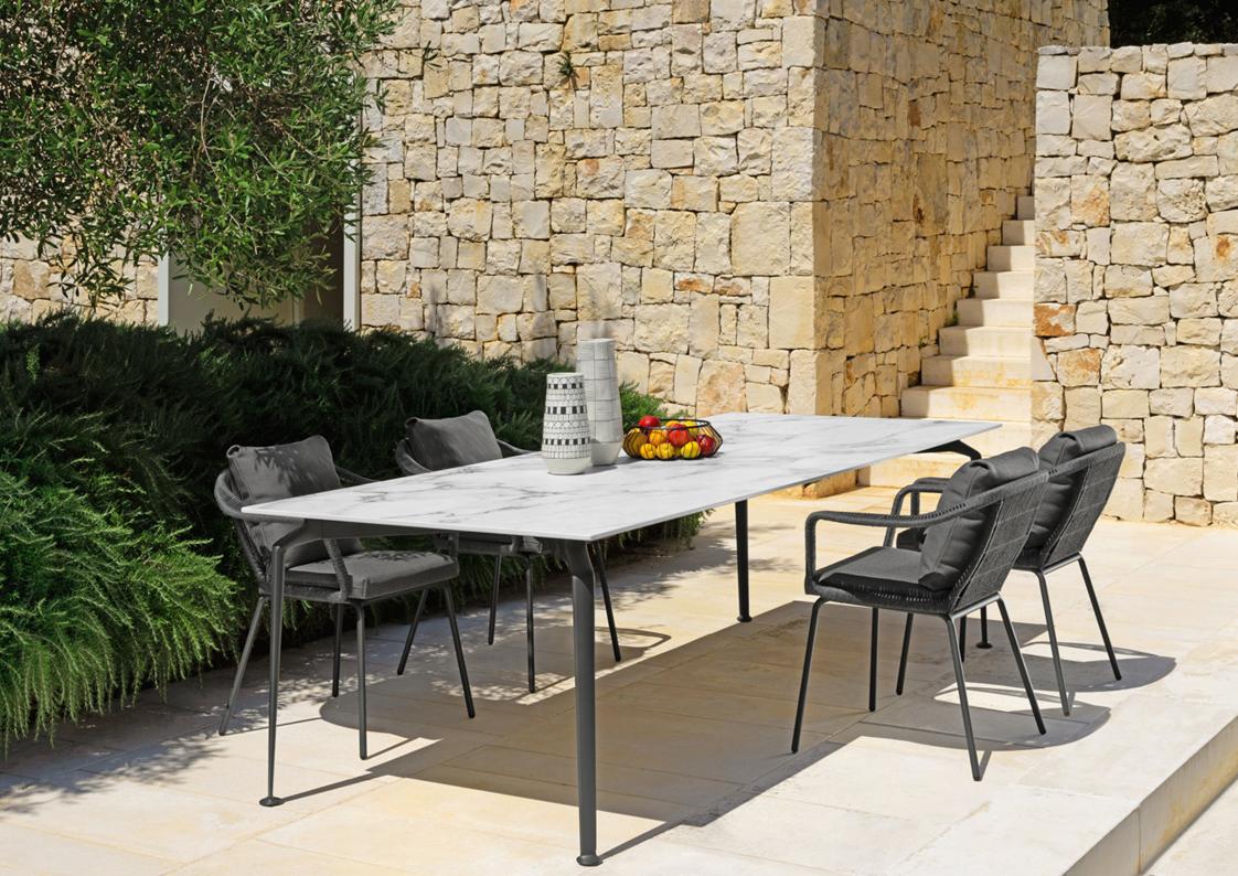 The elegance and sophisticated appeal of the Cruise Teak collection combined with the contemporary aluminum of the structures give life to the Cruise Aluminum Series. The collection features an aluminum base with die-cast feet. The die-casting technique has made it possible to design the foot in detail, which becomes a distinctive element of the collection, giving the padding and tables a greater aesthetic impact.