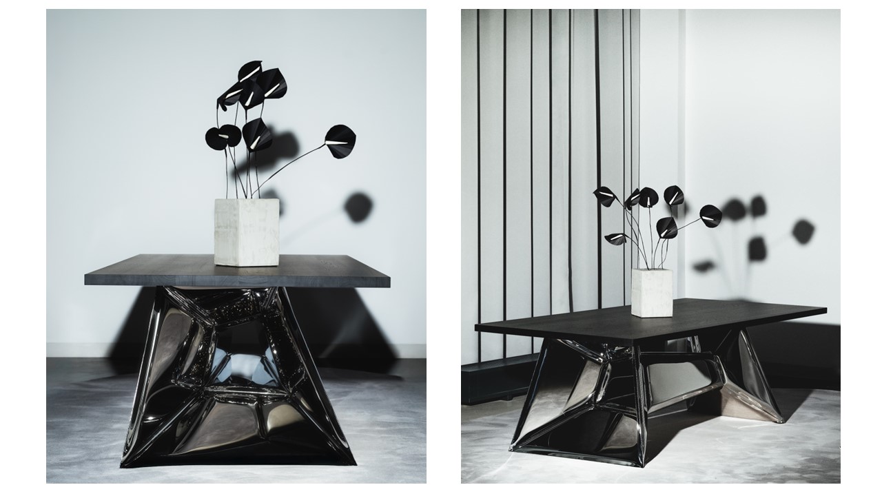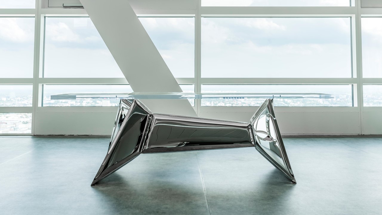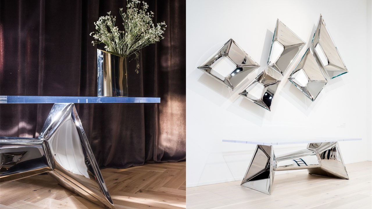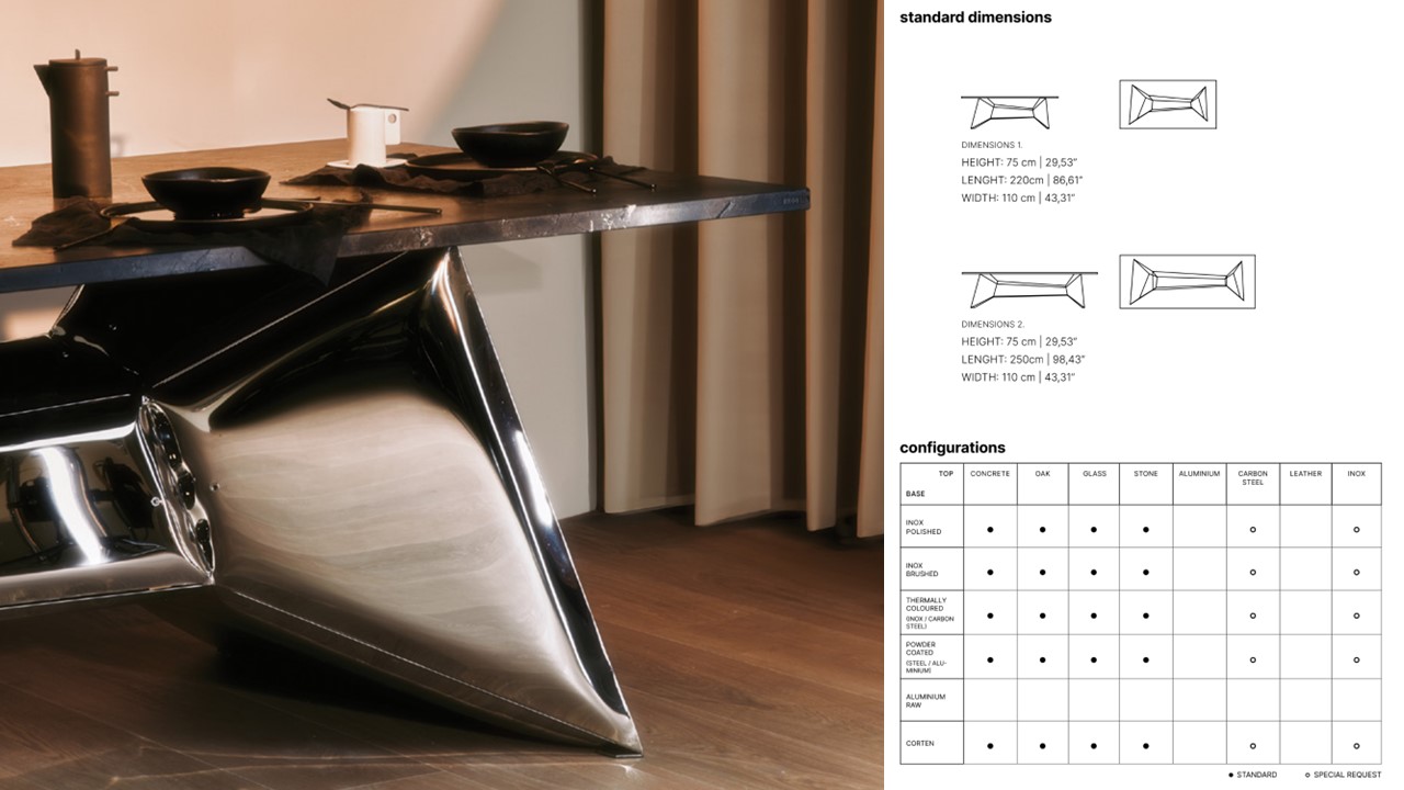 The Crystals Dining Table is functional sculptural art—an architectural statement that transforms any space. Inspired by the facets of a diamond, its reflective metal base multiplies light and form, creating a mesmerizing play of symmetry and depth. Both table and art piece, it frames the room with kaleidoscopic impressions, where surfaces echo one another and geometry becomes performance. Available in multiple top and base options, the Crystals Dining Table turns dining into an immersive visual experience.