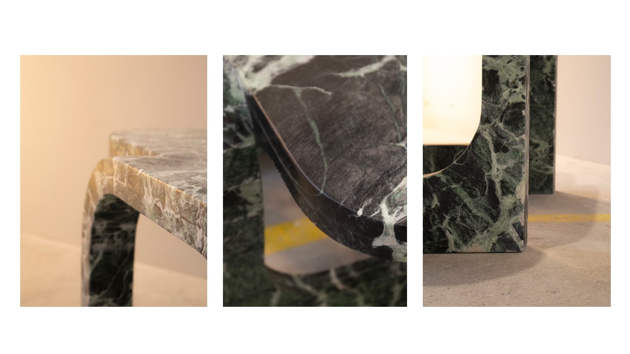 The Cut & Fold Marble Coffee Table, explores a radical idea—how to make the rigid appear fluid, and the immovable feel dynamic. Rooted in the simple acts of cutting and folding, the piece transforms a solid block of marble into a form that appears to bend, shift, and evolve. Beginning as a single slab, the stone is precisely cut to define new geometries, then sculpted to suggest an impossible motion—an imagined fold within a material that cannot physically bend. The result is a composition of striking sinuosity and lightness, where surfaces flow seamlessly into one another while remaining structurally grounded. Planes remain connected, edges extend and return, and the overall form carries a sense of continuous movement—capturing a moment of transformation suspended in time. Crafted through a combination of advanced robotic milling and refined hand-finishing, the piece balances technological precision with artisanal sensitivity—allowing the natural depth, veining, and character of the marble to remain fully present.