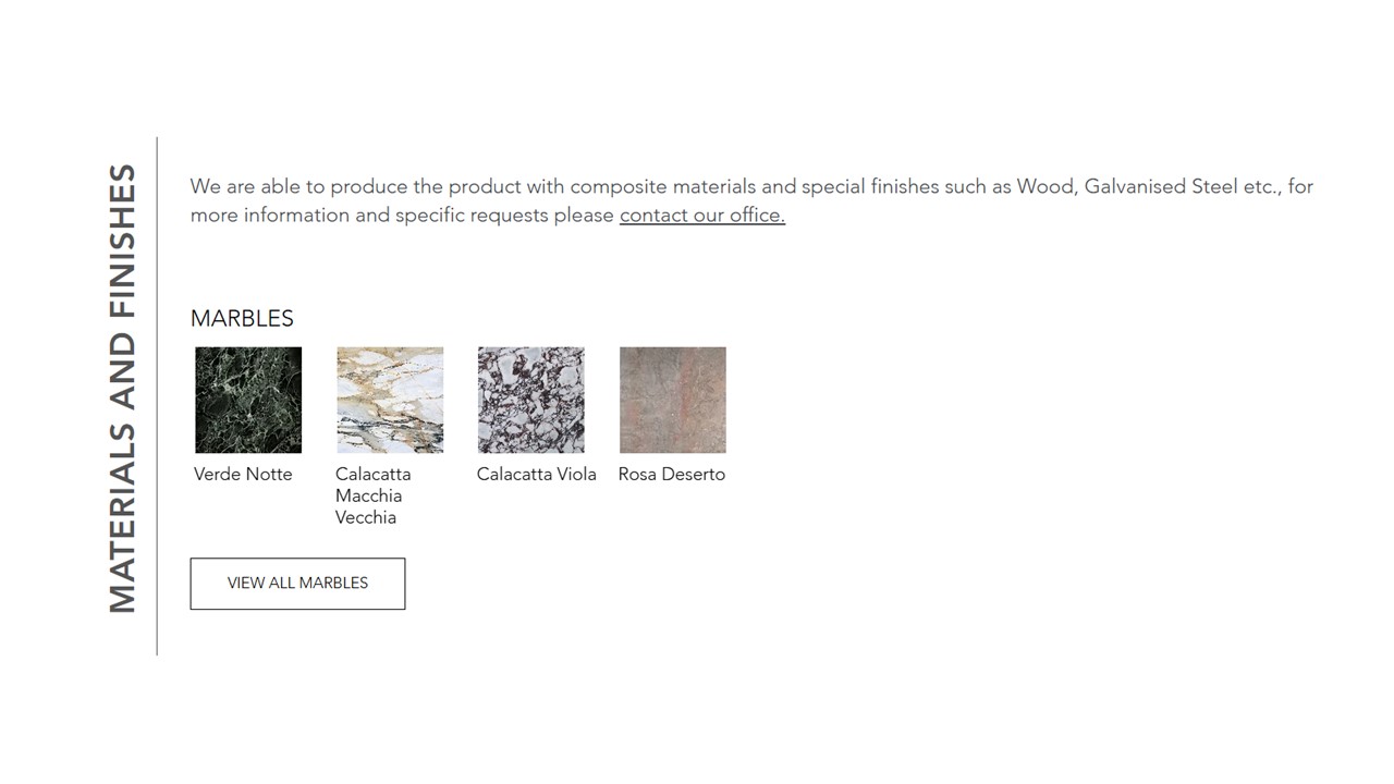 alternate stone finishes: travertina rossso, bianco perlino, Carrara, ebano, grigio carnicov, pietra lavica nera, picasso green, salome, verde notte, arabescato grigio orobico, emperador brown, sahara noir, nero marquinia