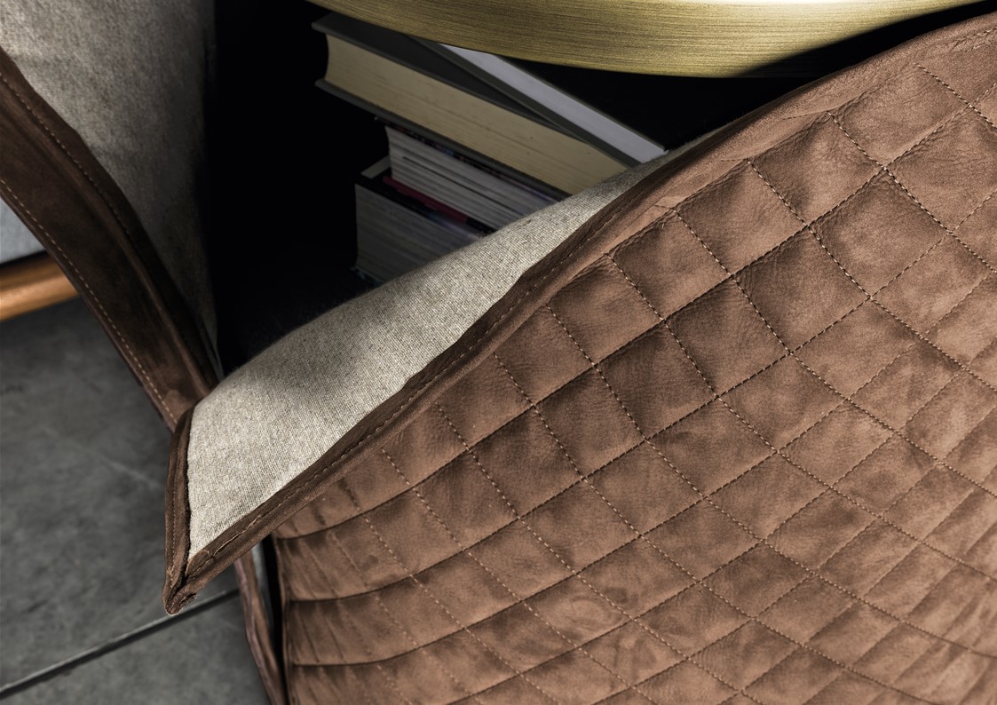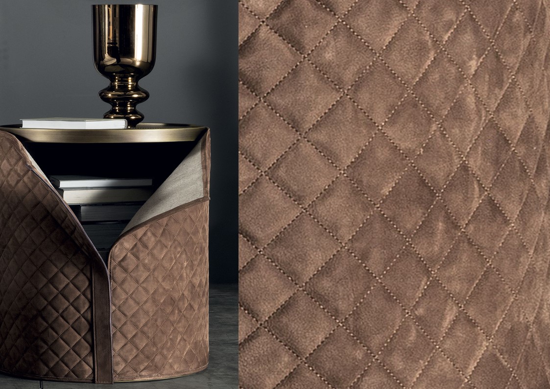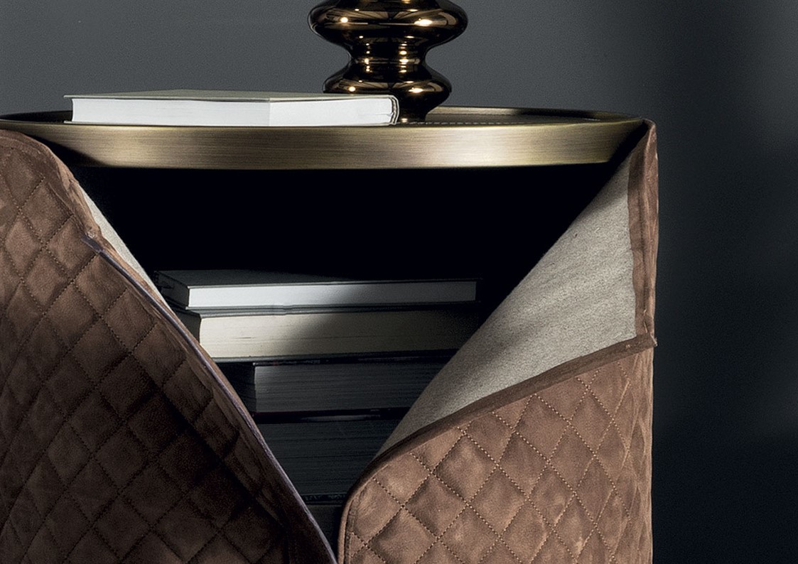 Part of the DUSK Series, the originality of Don Rodrigo begins with its unexpected cylindrical shape and continues with the elegant quilted leather cover. Open it totally or partially to show its sparkling metal structure with shelves lined in fabric. A sophisticated and clever hideaway for your personal items – available in several Italian leathers with your choice of mirror, saddle leather or marble top – please inquire.