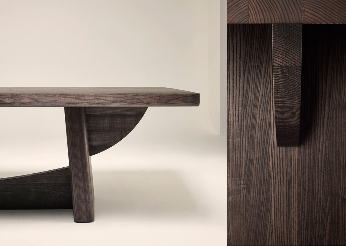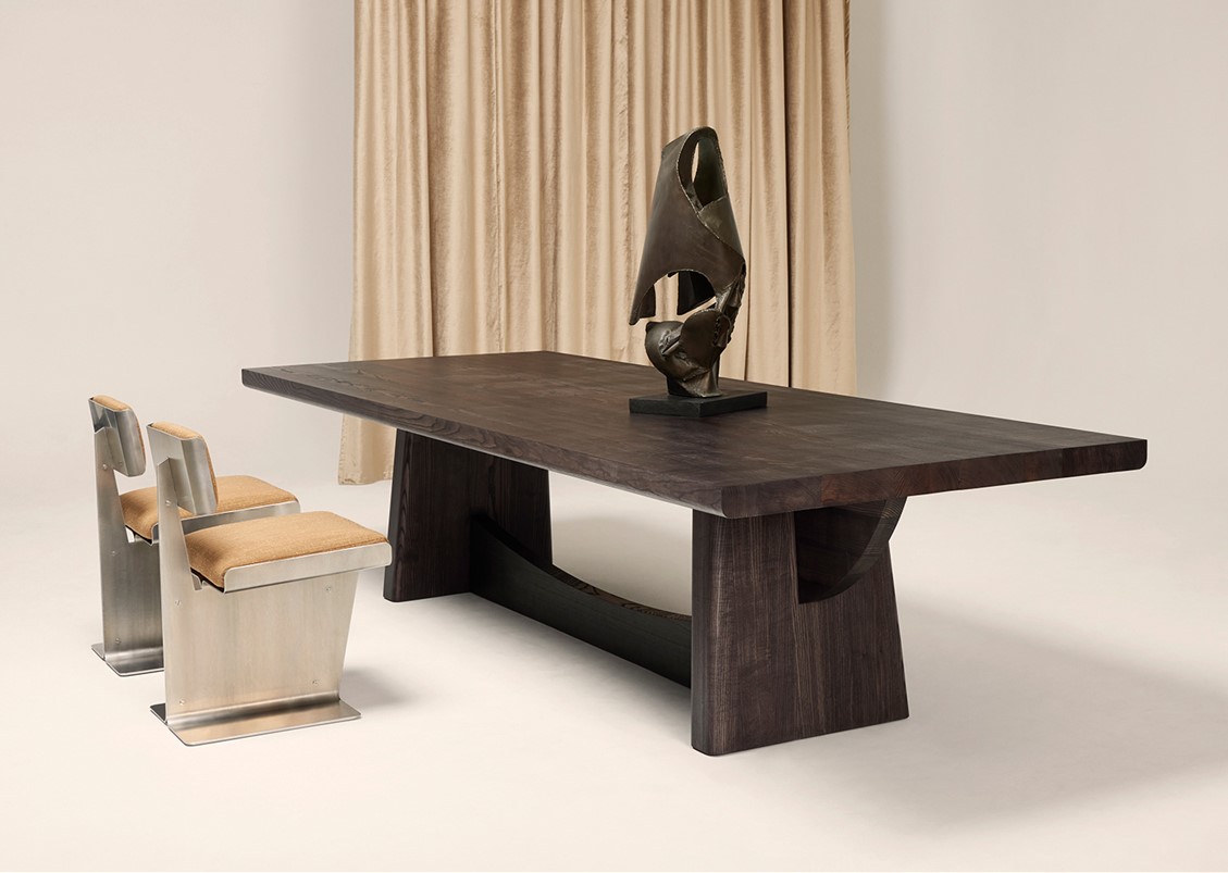 The Eclipse dining table draws inspiration from Eduardo Chillida’s philosophical explorations of form and emptiness, particularly his sculpture “Eulogy of the Horizon” (1990), which serves as both a boundary and an invitation. Similar to Chillida’s work, the Eclipse table features an interplay of solids and voids, creating a subtle choreography between presence and absence. Its structure outlines an implicit ellipse, a shape that emerges from the interaction of wood, void, and shadow, evoking the celestial phenomenon that names the table. This “eclipse” is not a solid form but rather a suggestion made visible by the lines and surfaces that surround it. The Eclipse table is a masterful creation that combines monumental scale with poetic simplicity, where the inherent strength of solid wood becomes a canvas for contemplation and craftsmanship. With impressive legs measuring 9 cm thick and a top that is 8 cm thick, the Eclipse table presents a powerful silhouette—an imposing statement of materiality that is as bold as it is refined. Each table is unique, crafted from large planks of carefully selected wood, embracing the lineage of its origin in homage to the tree from which it came.