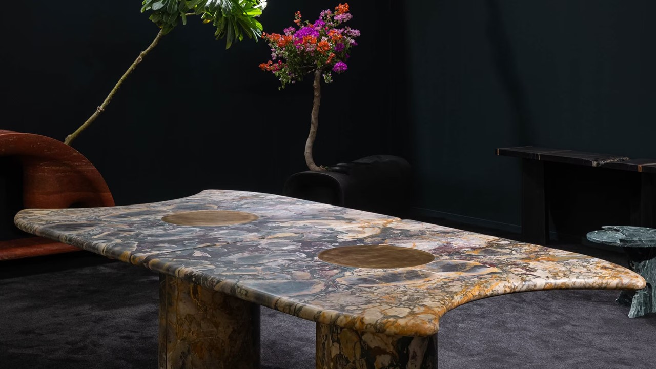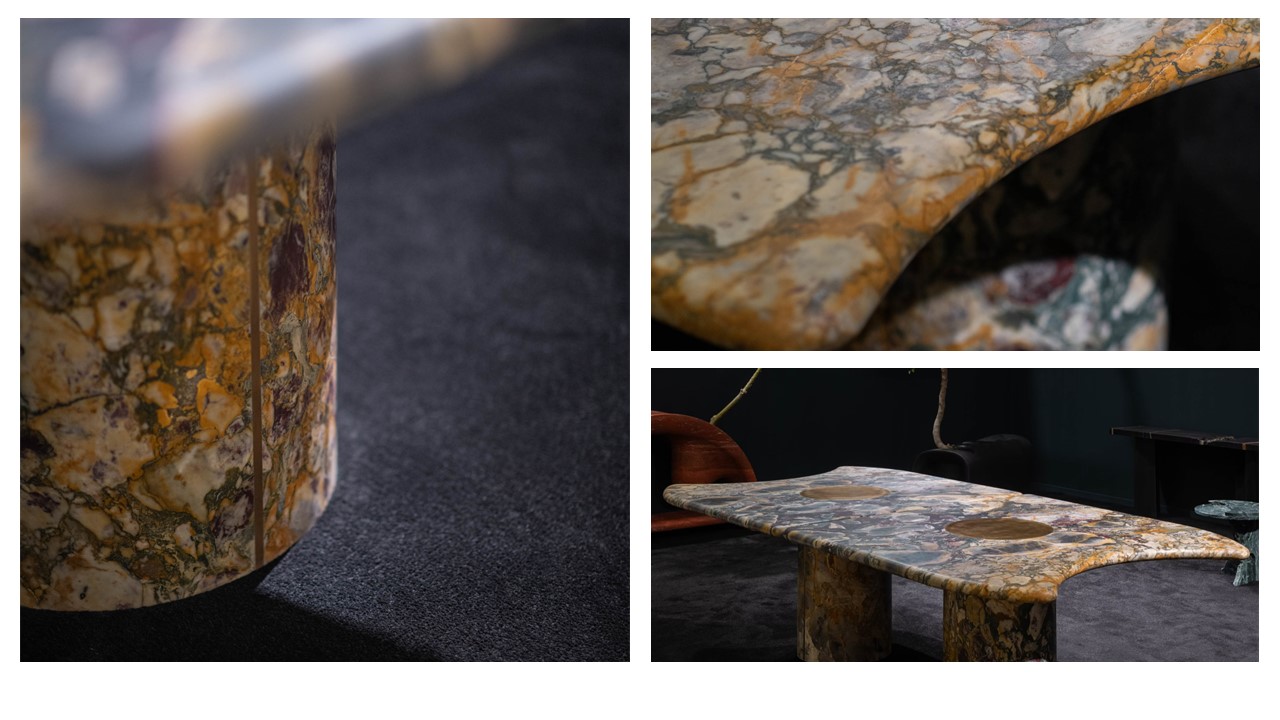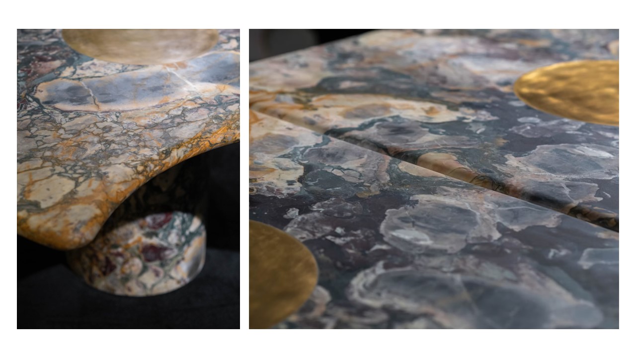 The Eclipse Marble Table, designed by Arthur Vallin, is conceived as a meeting point between light and matter—where stone becomes atmospheric, and form becomes spatial experience. Carved from rare Cosmos de Pierre marble, the surface reveals a depth of veining and tonal variation reminiscent of constellations suspended in space—transforming the table into a living composition of movement and light. Its silhouette is fluid and organic, rejecting rigid geometry in favor of a more natural, evolving form. Beneath, subtle brass detailing introduces warmth and reflection—creating a quiet dialogue between the density of stone and the luminosity of metal. A defining feature of Eclipse is its modular construction: two mirrored elements that can exist as a singular, monumental table or separate into independent forms—maintaining visual continuity while offering spatial flexibility. At dining scale, the experience becomes immersive. The table does not simply host gathering—it shapes it, anchoring the room with presence, depth, and a sense of quiet gravity. More than a dining table, Eclipse exists as a sculptural environment—an object where architecture, material, and light converge into a timeless statement.