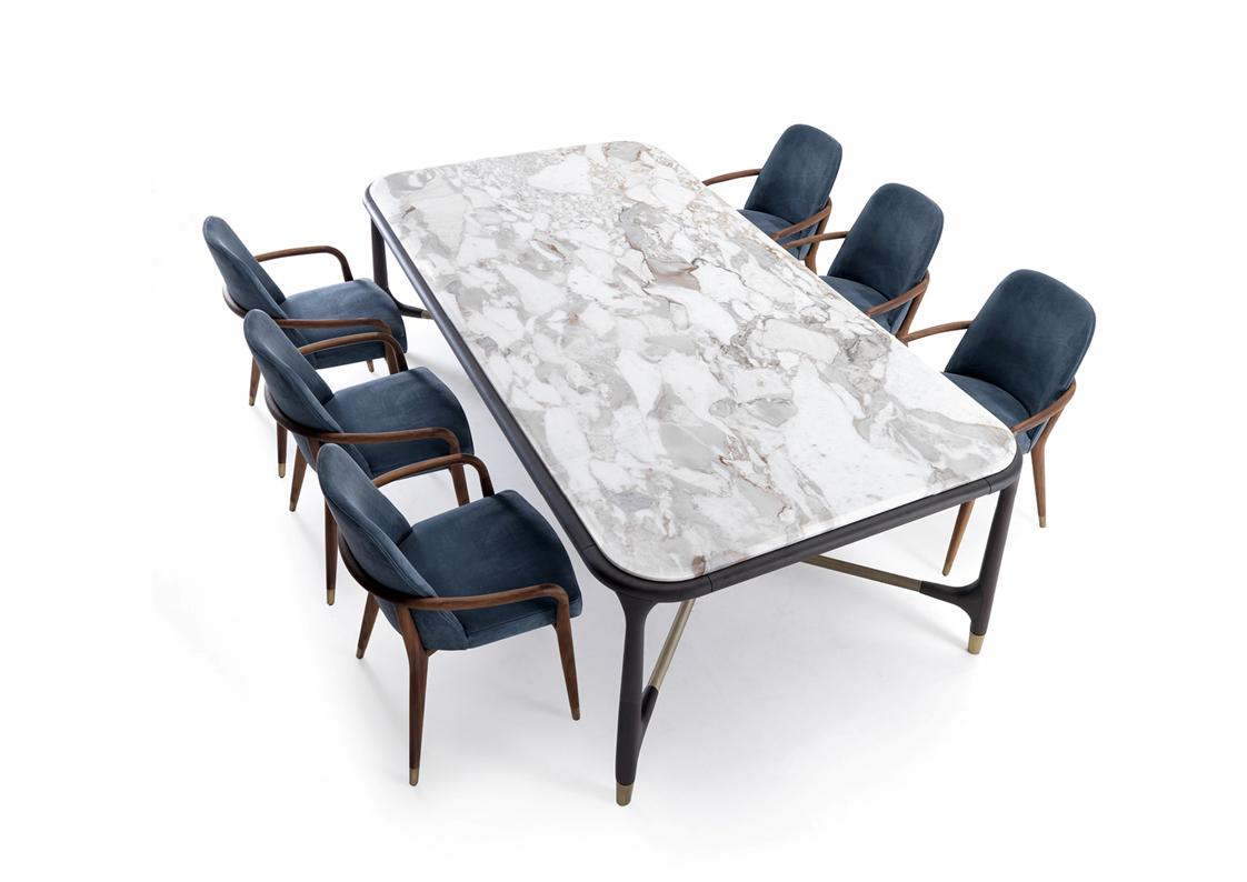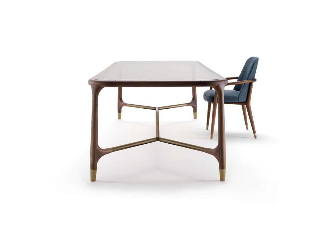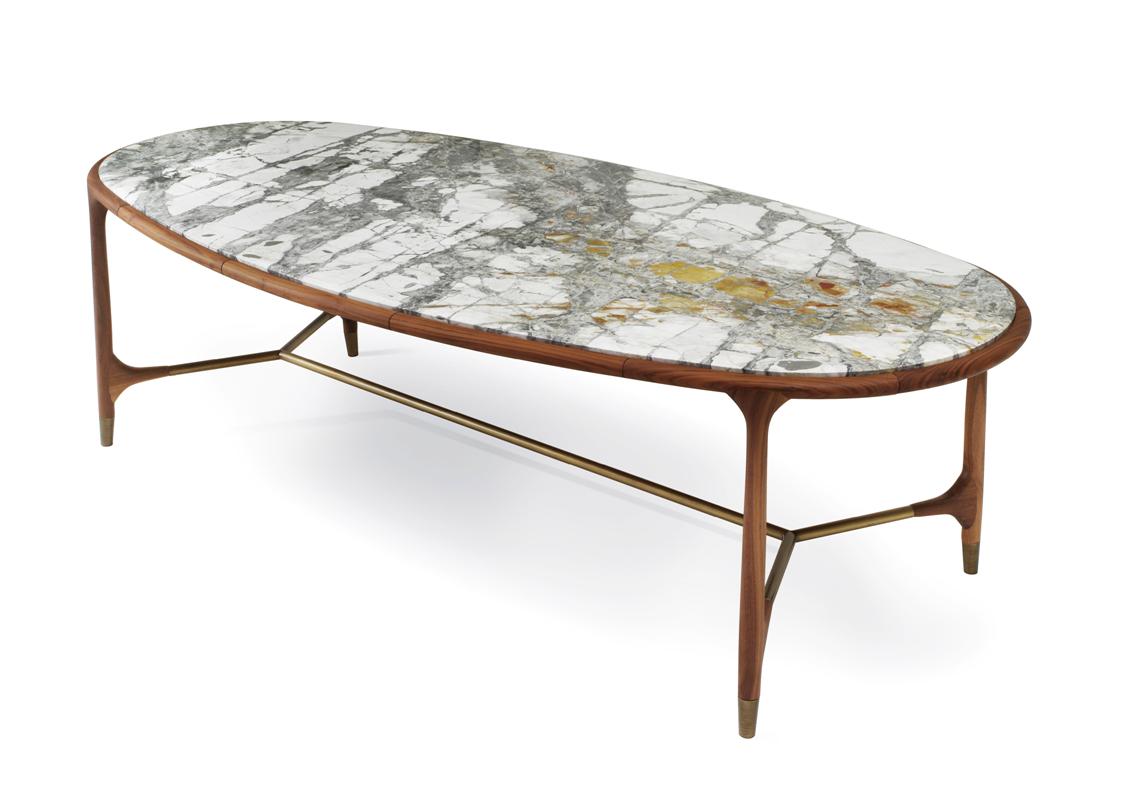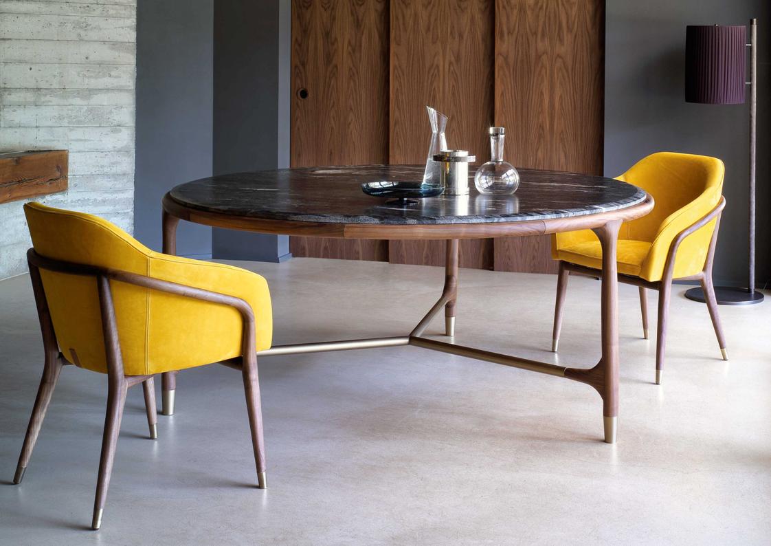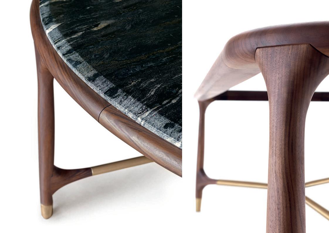 Elisee is a prominent dining table with a structure of solid American walnut combined with metal bars and end caps in brass or bronze. The tops come in several luxury marbles, wood or glass if you prefer to highlight the purity and elegant design of the base. Available in oval, rectangle or round