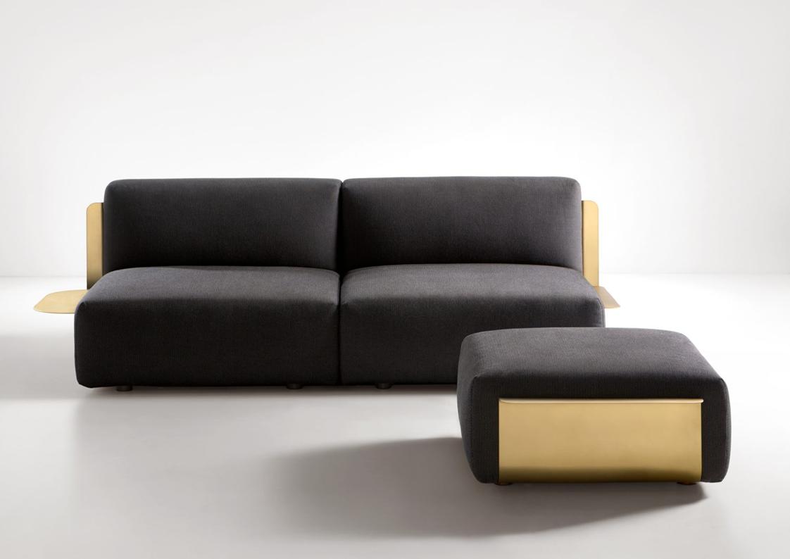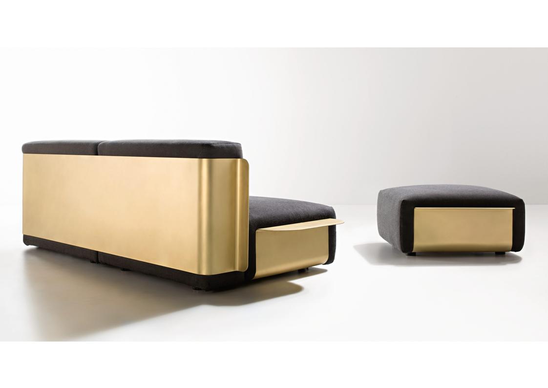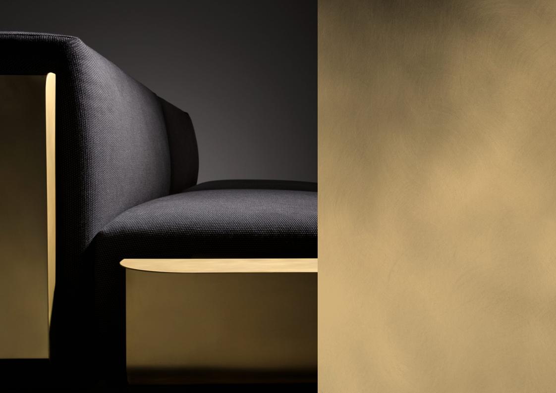 The Embrace series challenges the apparent contradiction between the well-known hardness of metal and the comfortable softness of upholstery. Embrace makes the oxymoron its inspiration, pairing its welcoming upholstered shapes with a brass metal shell that tightens + defines their shape. The metal remains the protagonist while respecting all the comfort of the generous seat, highlighting the supports that gently overlook the sides. Available with brushed stainless or brass metal shell and several fine Italian fabric or leathers. Limited customization may be possible – please inquire.