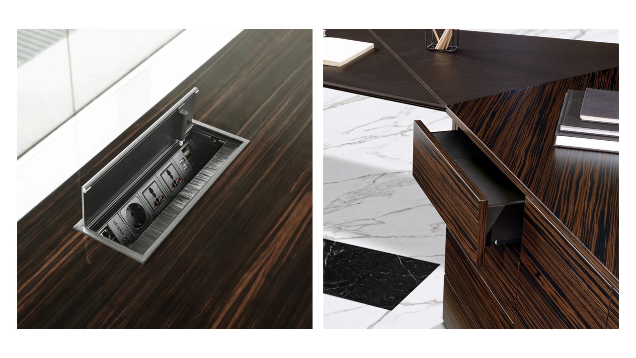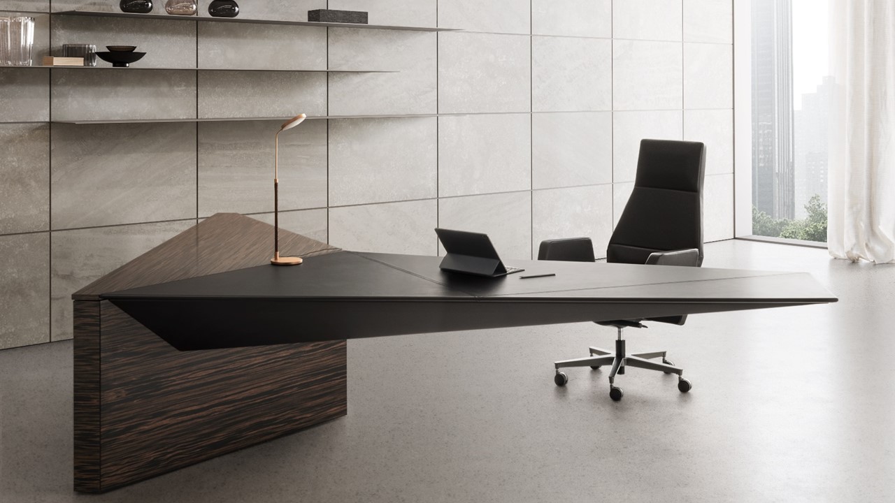 The Euclid Executive Desk is a functional piece of art – a sculpted cantilevered top projects from a wood sideboard counterpart with 4 drawers and 2 doors. The top is available in several saddle leather or wood options with matching or contrasting sideboard.