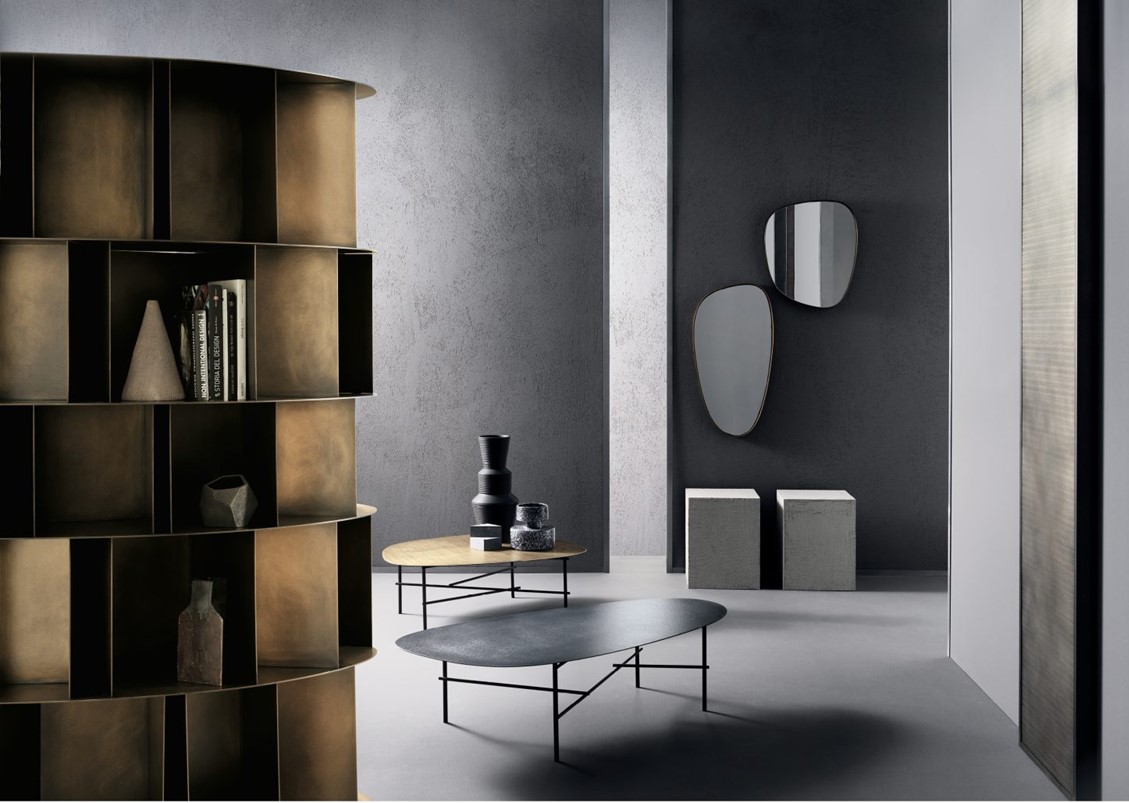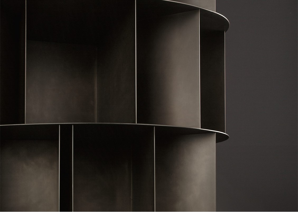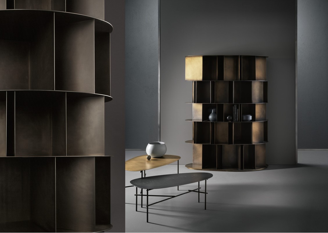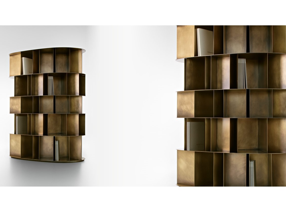 Why should bookcases always be straight, long, vertical, and right-angle planes to keep nothing but books perfectly straight and composed? And don’t we like to keep a few small objects, keepsakes, some useless artifacts from fundamental phases of our existence, among the books?” Available in free-standing and wall-mounted versions, Existence arose as an overlapping of small, varied boxes, like the experiences and keys to one’s life: a totem-bookshelf designed to contain books and objects in a single space, built around similar modules that repeat, though the same form never appears twice. Available in a deLabre steel or brass