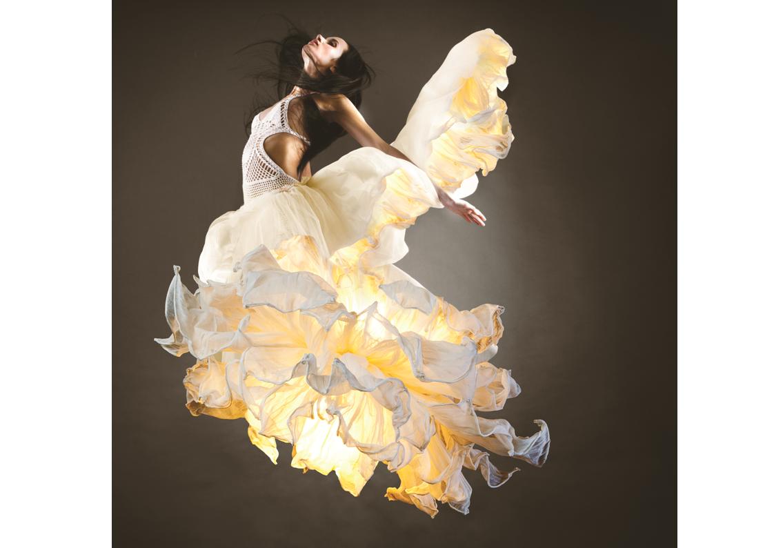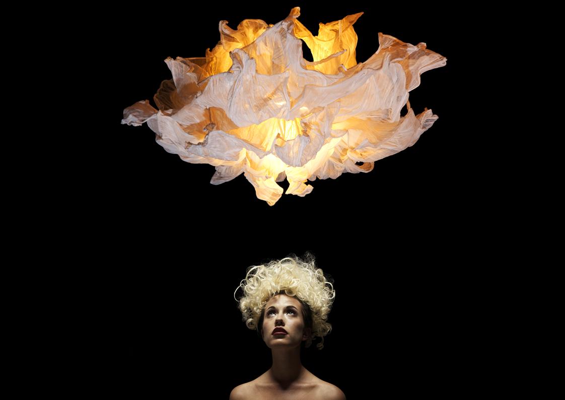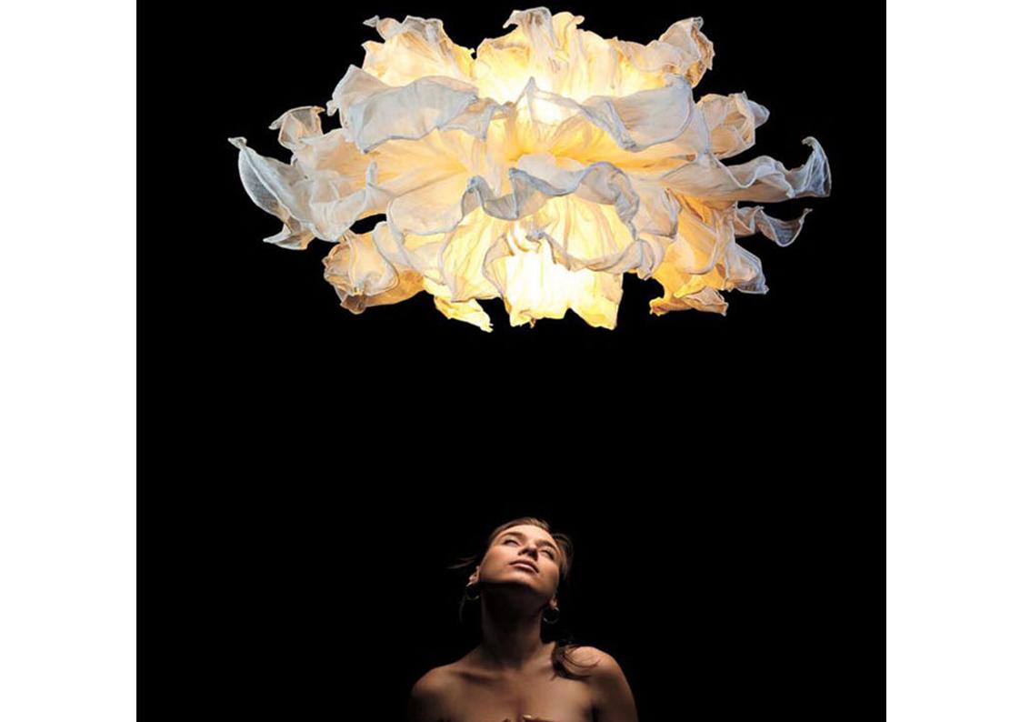 Theatrical in expression, the Fandango dances in mid-air with similar drama to a girl waving her dress. Several layers of petals made from muslin cotton cloth can be shaped and adjusted to desired wave. The piped-edge yet flowing feel gives a luxe touch.