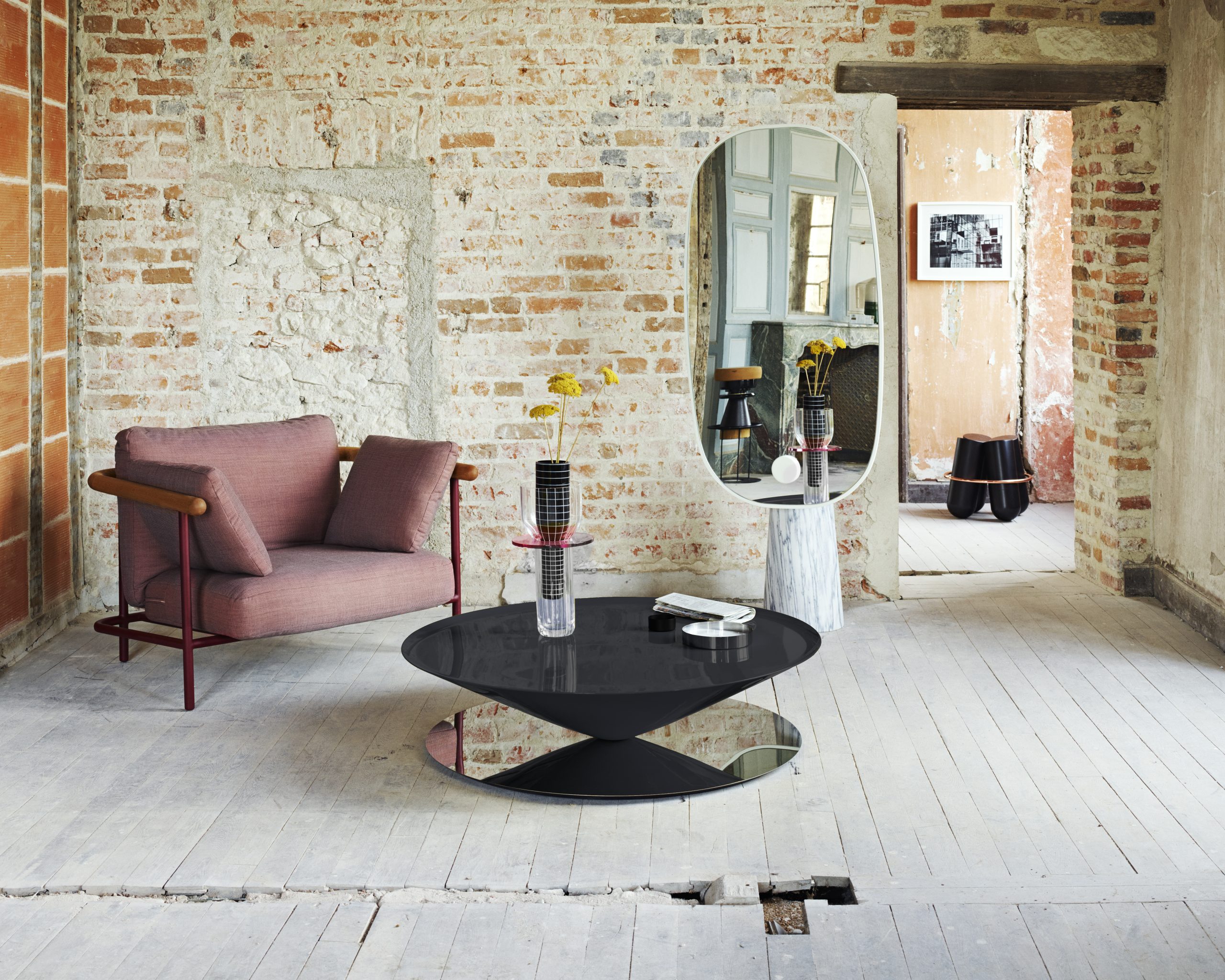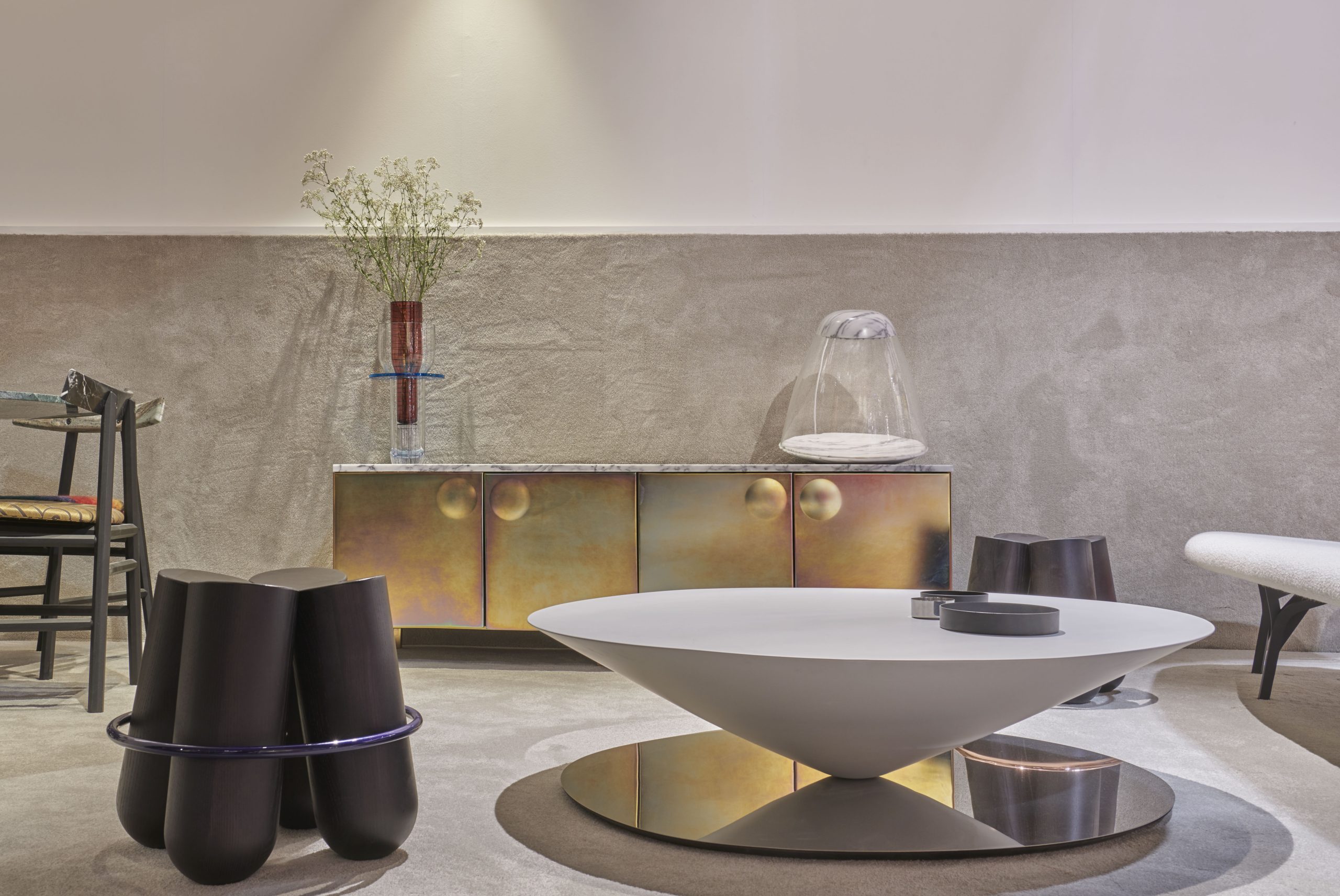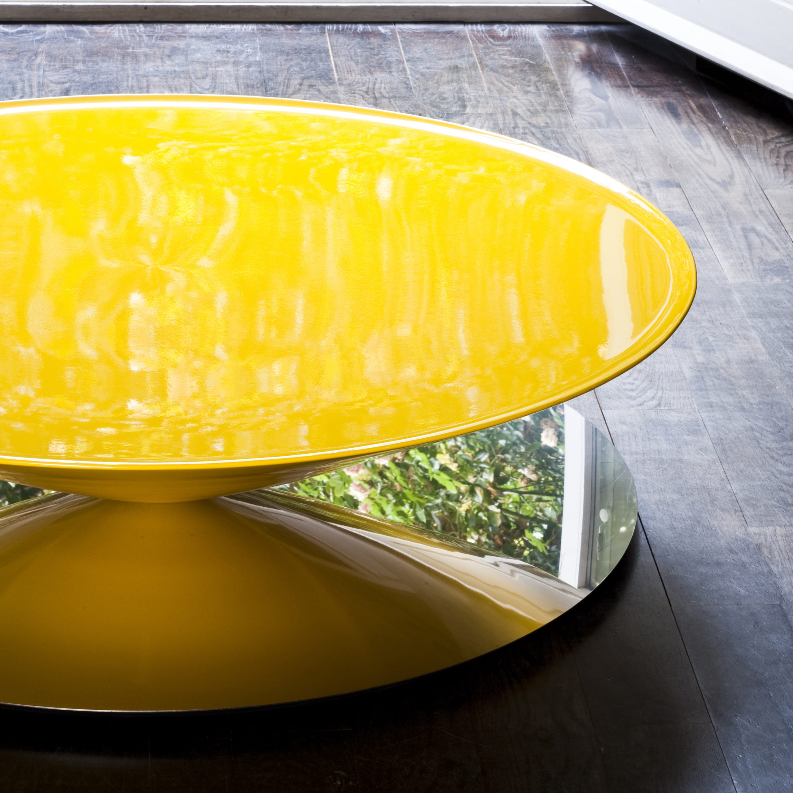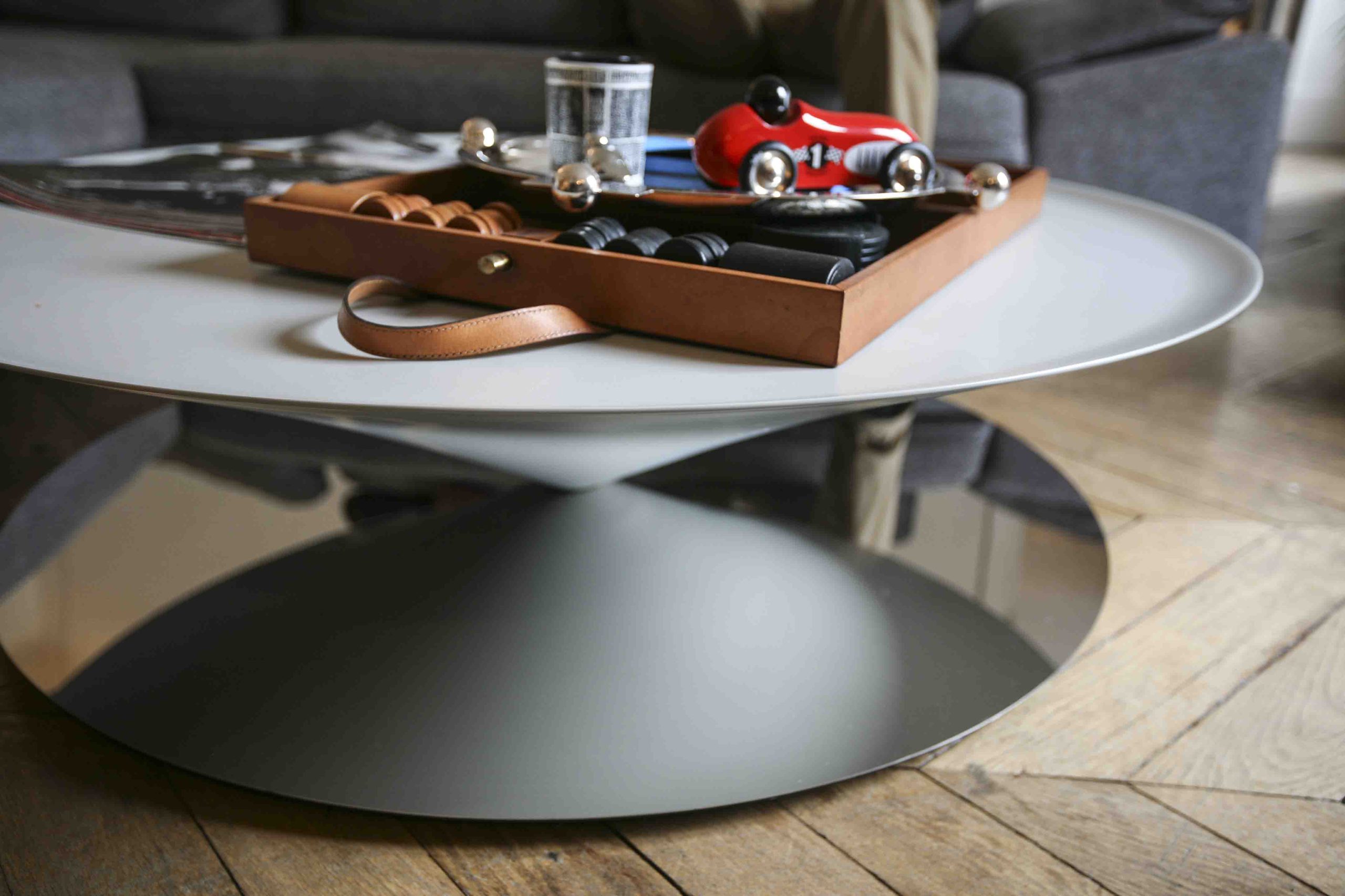 Float Coffee Table by Luca Nichetto is a sculptural table that challenges the senses and perception. A massive metal cone apparently floats above a mirror-polished steel base. The bezel lip edge of the perfect circle cone softens the geometrical design.