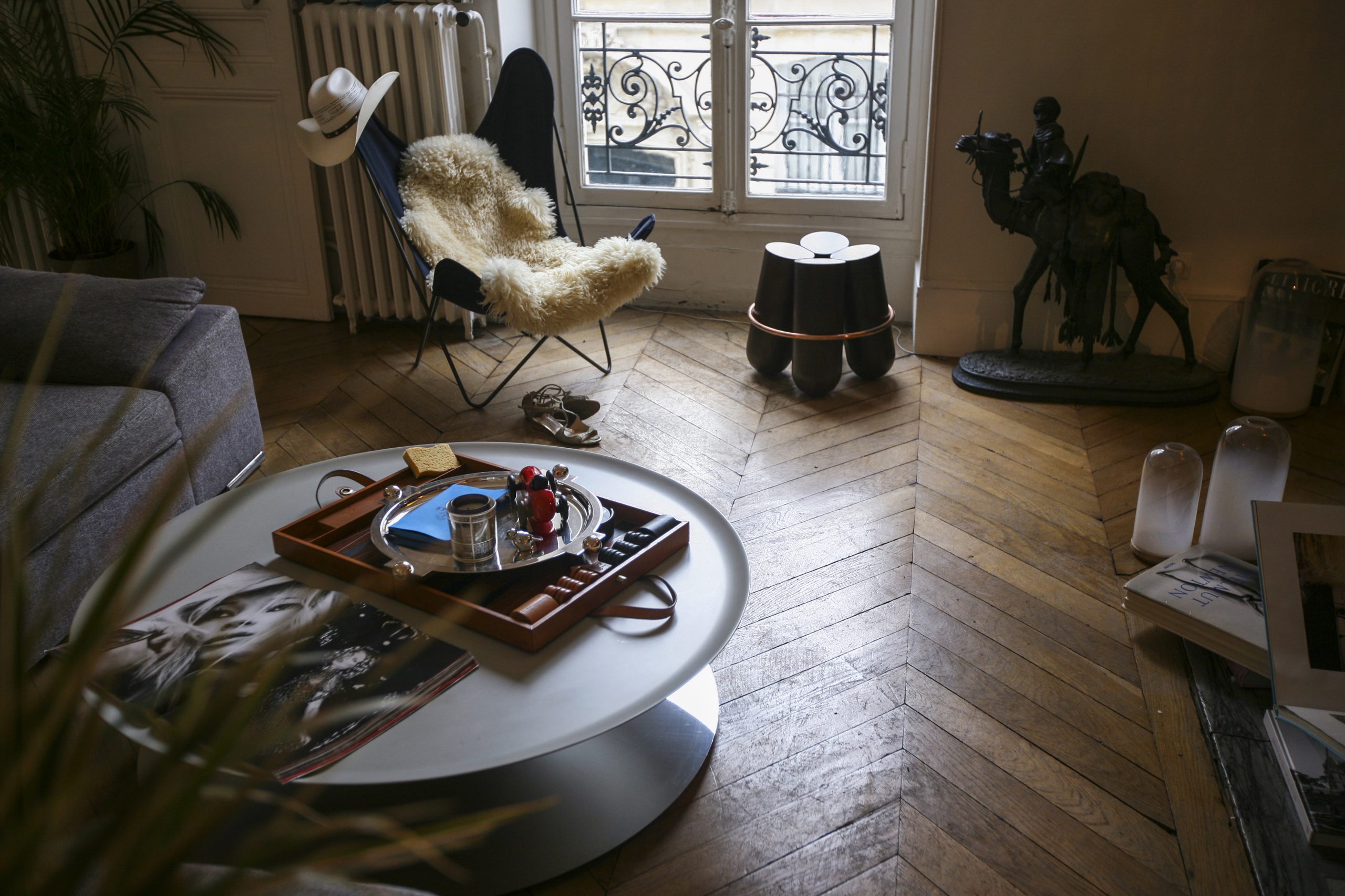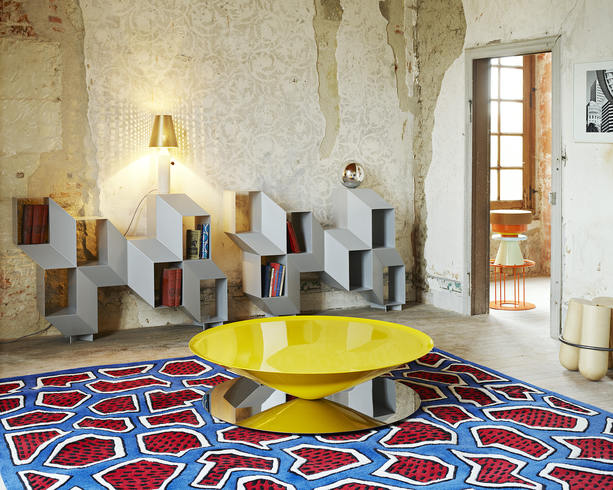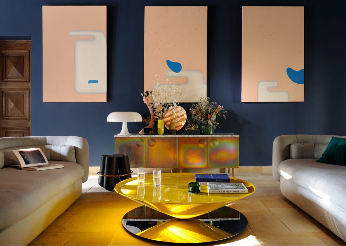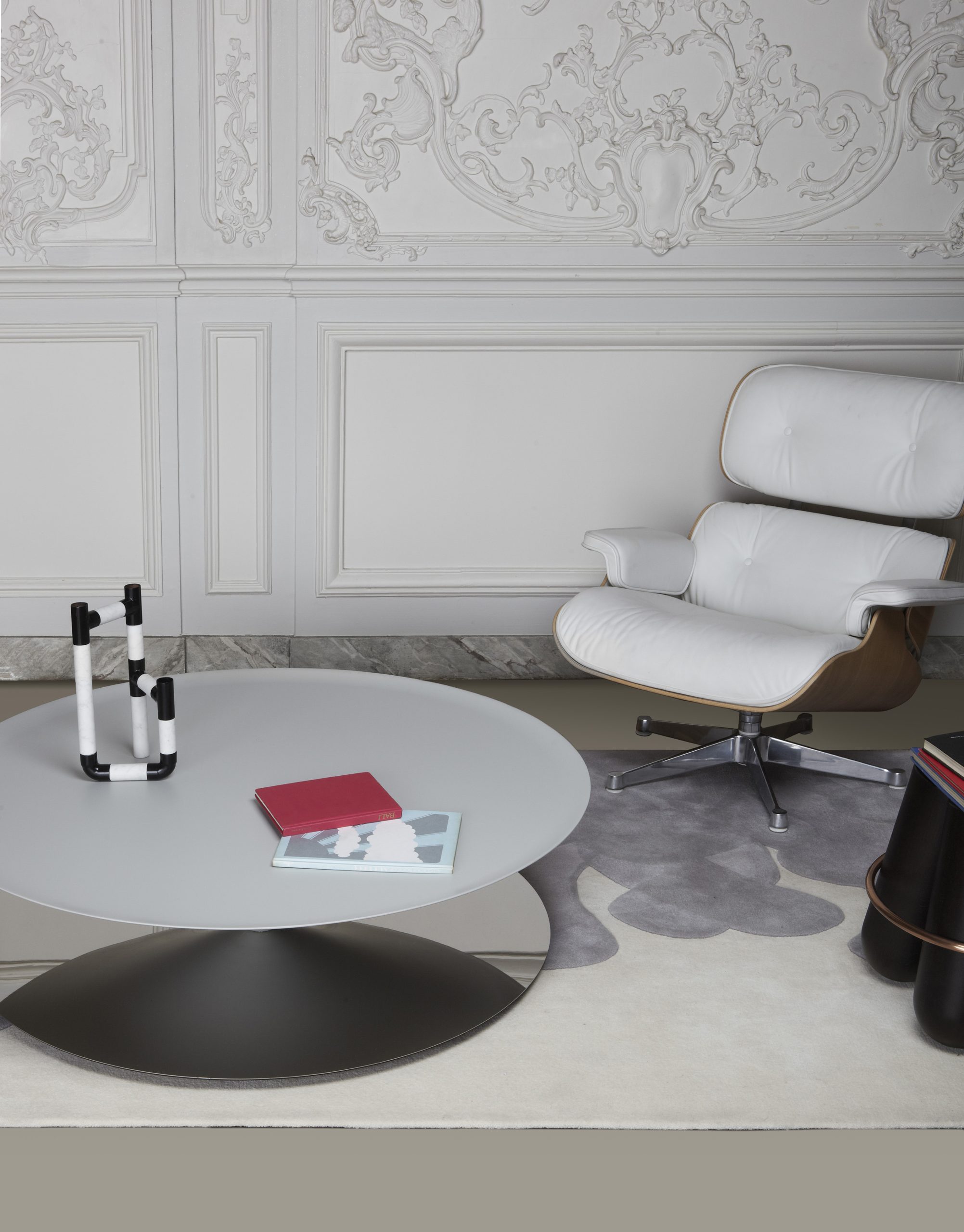 Float Coffee Table by Luca Nichetto is a sculptural table that challenges the senses and perception. A massive metal cone apparently floats above a mirror-polished steel base. The bezel lip edge of the perfect circle cone softens the geometrical design.