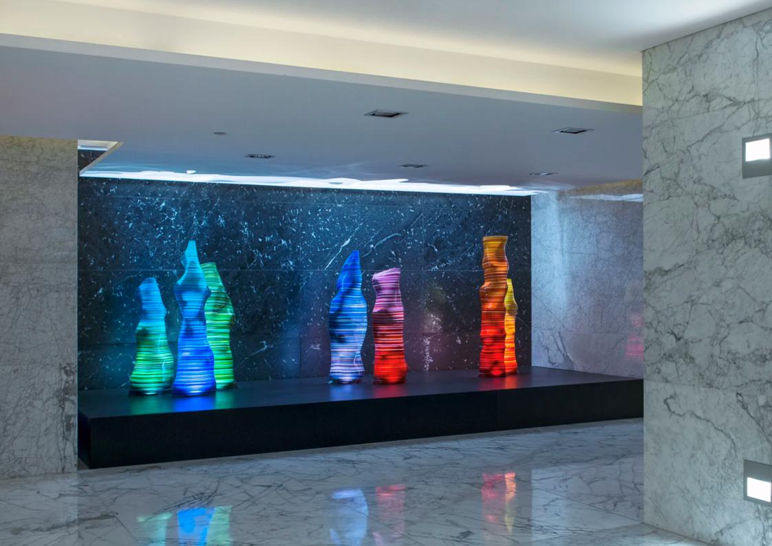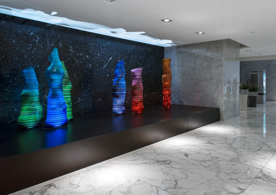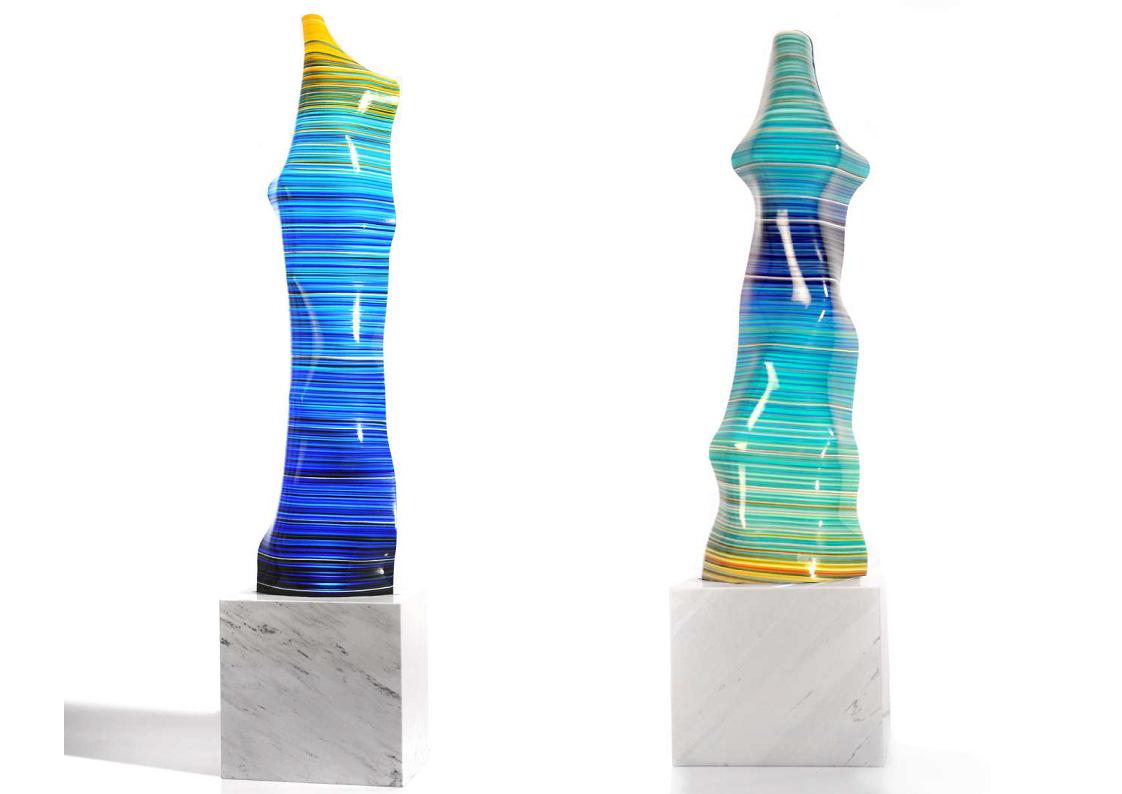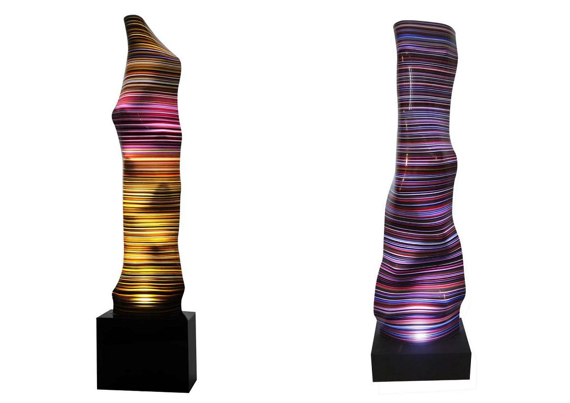 Part of our Modern Masters Series, the Fused Glass Lighting is hand-constructed by world-renowned artist Orfeo Quagliata. Linear strips of colored glass are meticulously placed and then fused together to form radiant and harmonious patterns. The technique of fusing glass is an exacting science and yields a refined, polished masterpiece. Each piece will be unique due to the process and is hand-made and signed by the artist. Available in several base materials – by private commissions only – please inquire