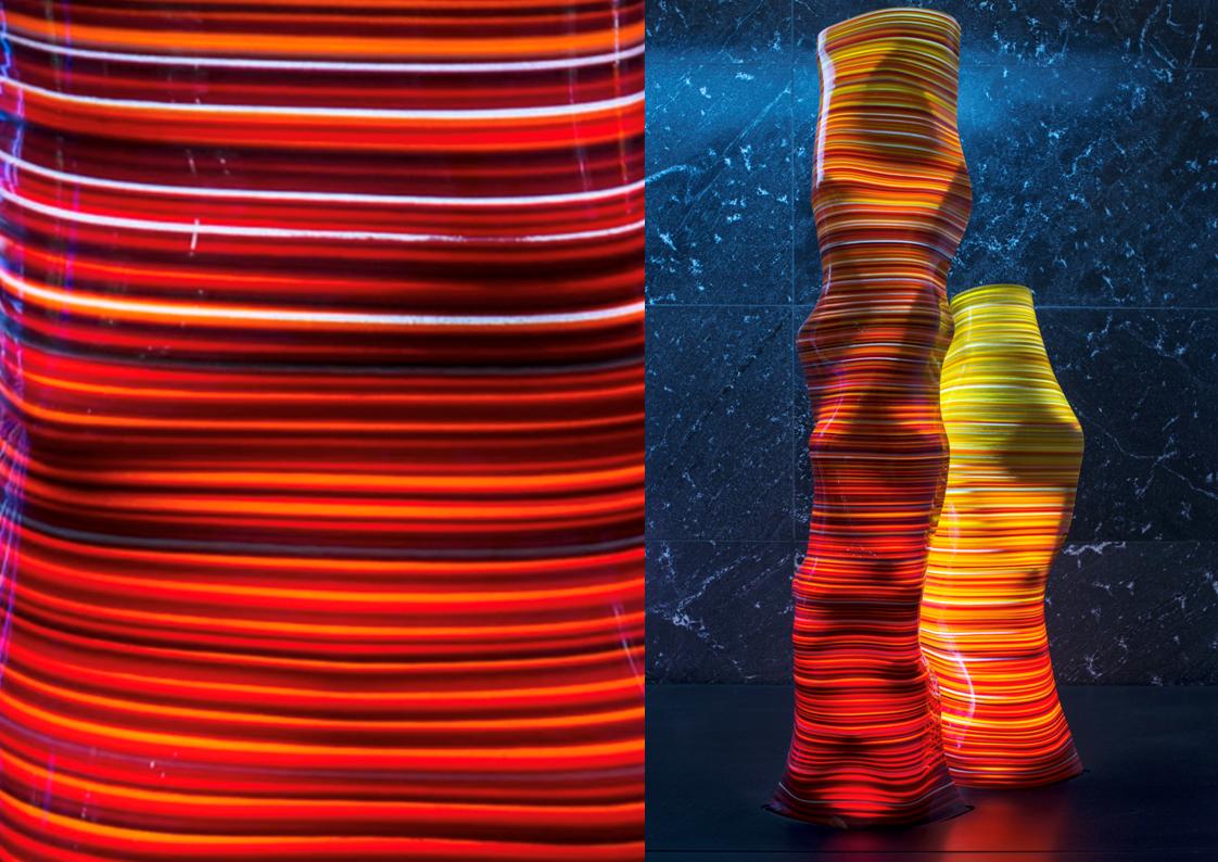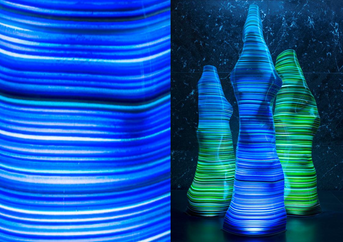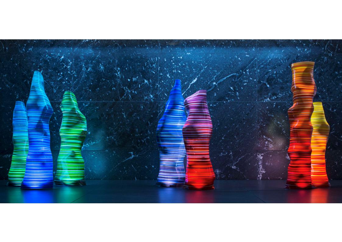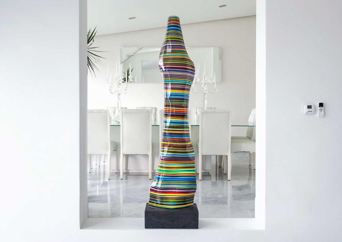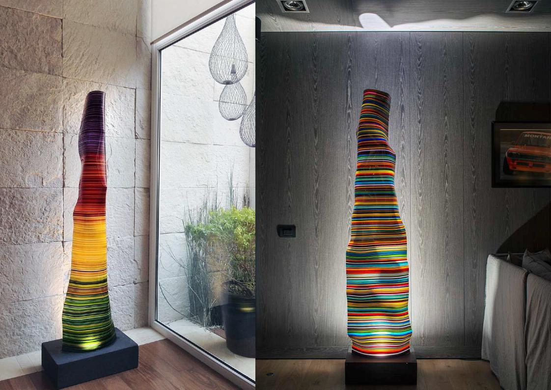 Part of our Modern Masters Series, the Fused Glass Lighting is hand-constructed by world-renowned artist Orfeo Quagliata. Linear strips of colored glass are meticulously placed and then fused together to form radiant and harmonious patterns. The technique of fusing glass is an exacting science and yields a refined, polished masterpiece. Each piece will be unique due to the process and is hand-made and signed by the artist. Available in several base materials – by private commissions only – please inquire