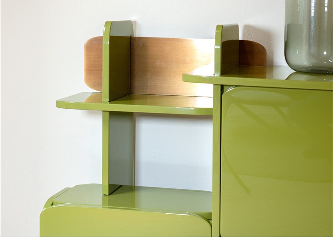 The Greffage collection also includes a bar counter with flap door. Elegant and fancy, it can adapt to any ambiance thanks to its small size. As for the other products of the same collection, the Greffage bar counter is characterized by horizontal and vertical elements that dissect full volumes, creating different support surfaces.