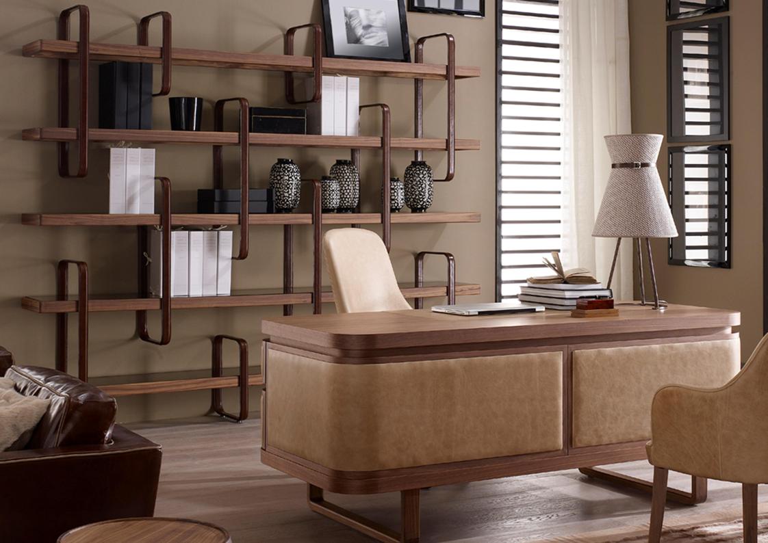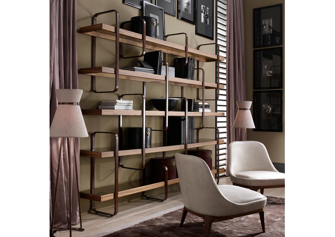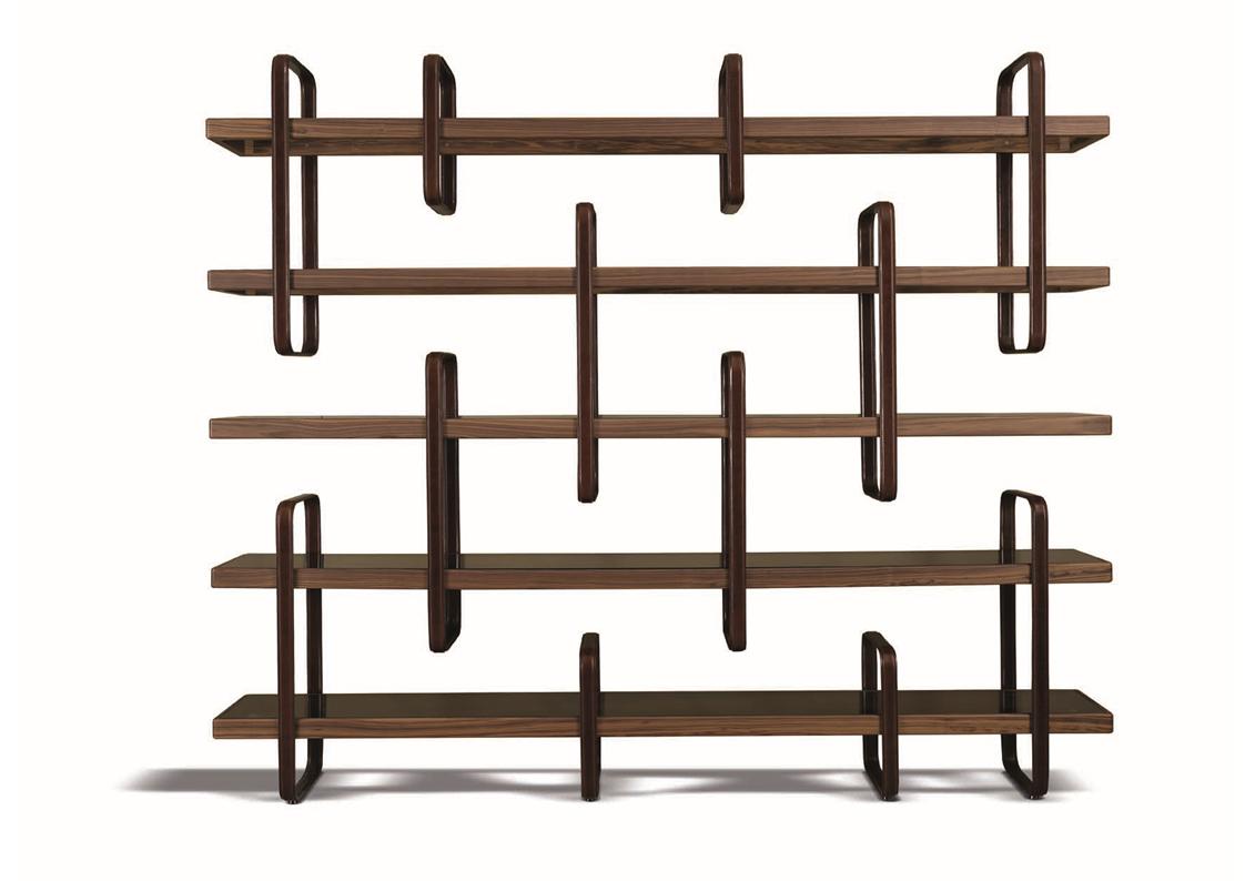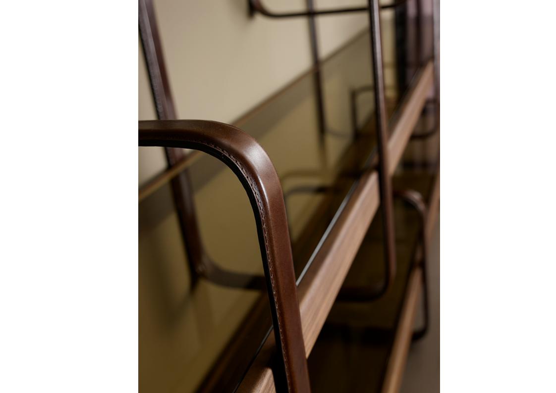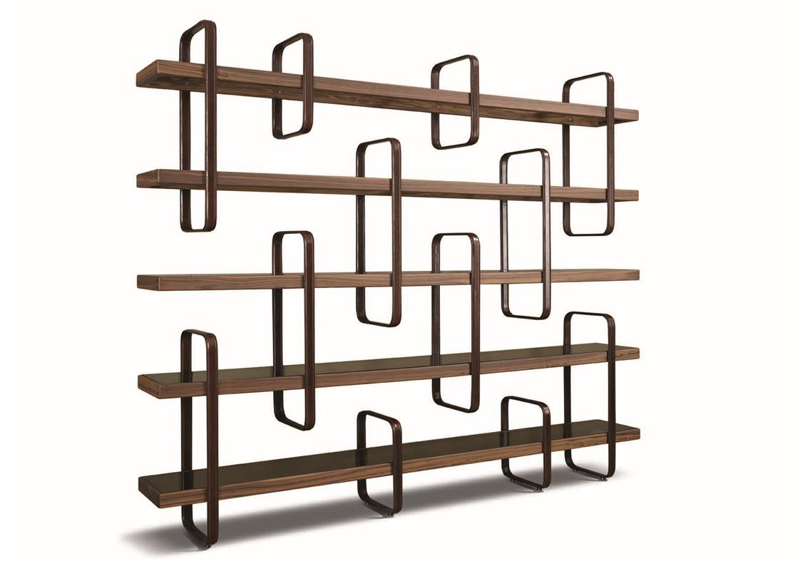 When you need a classy statement bookshelf that is more for display and visual effect than actual books this may be a perfect fit. Harmony is a modular bookcase with perimeter shelves in solid American walnut with bronze smoked glass inset glass and leather wrapped mounting brackets.