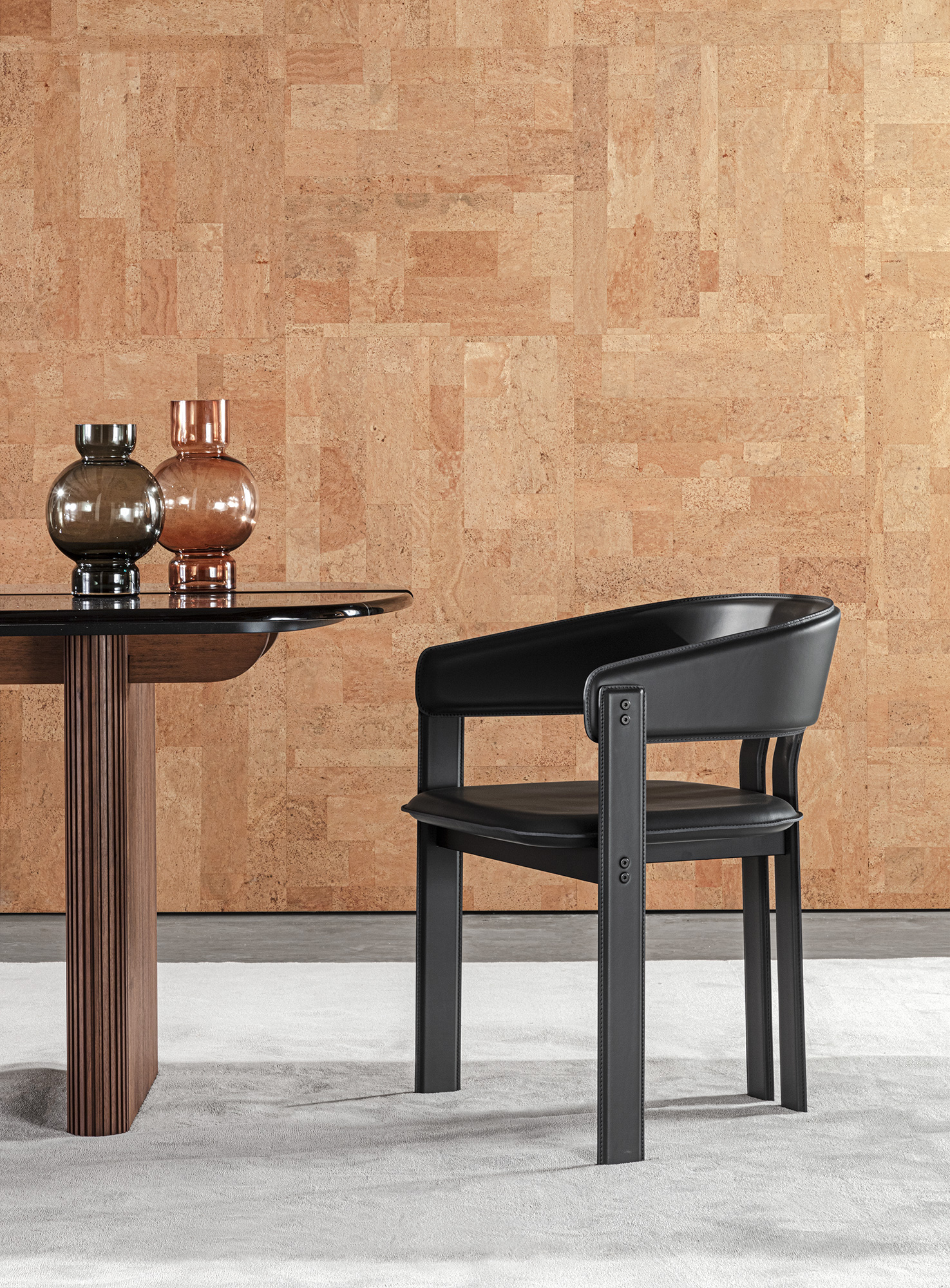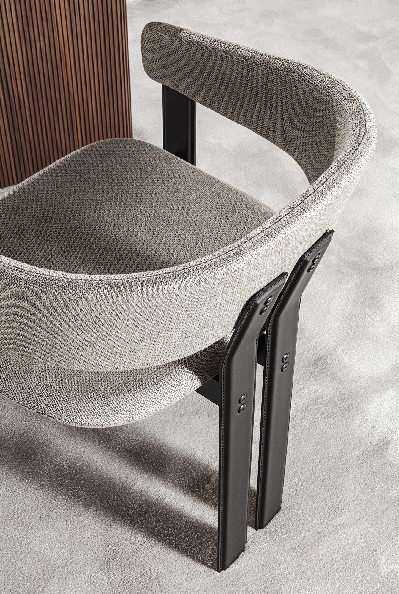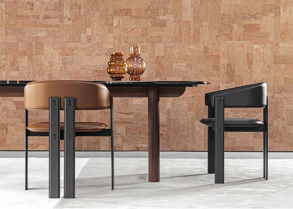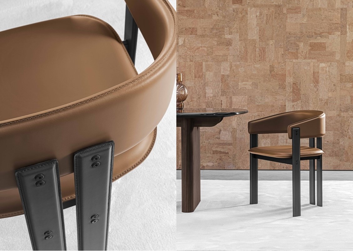 The Igea chair stands out for its bold shapes and finishes. The angular yet rounded structure is coated entirely in leather, an austere but mouldable material. A play of contrasts for high-profile ambiances.