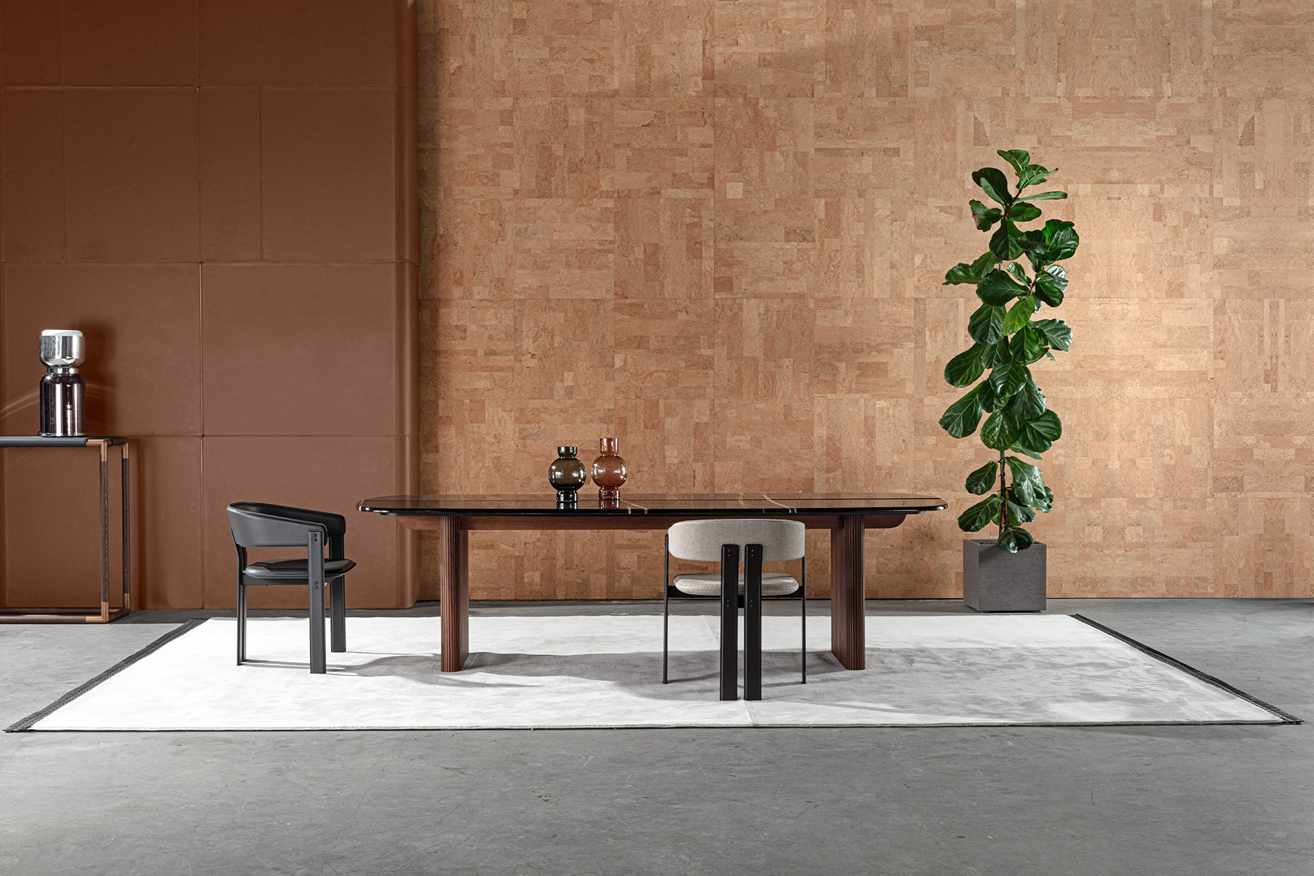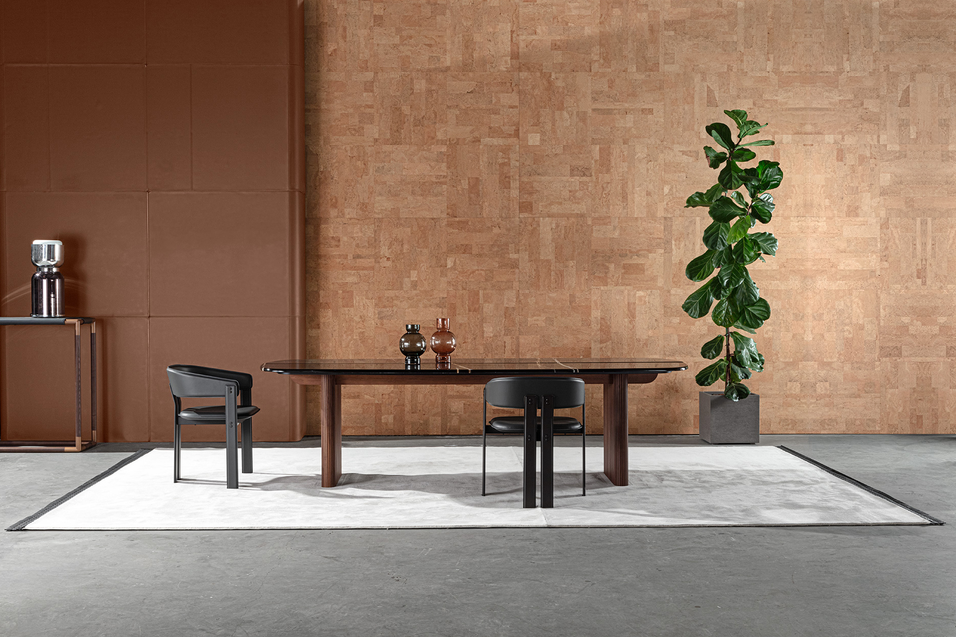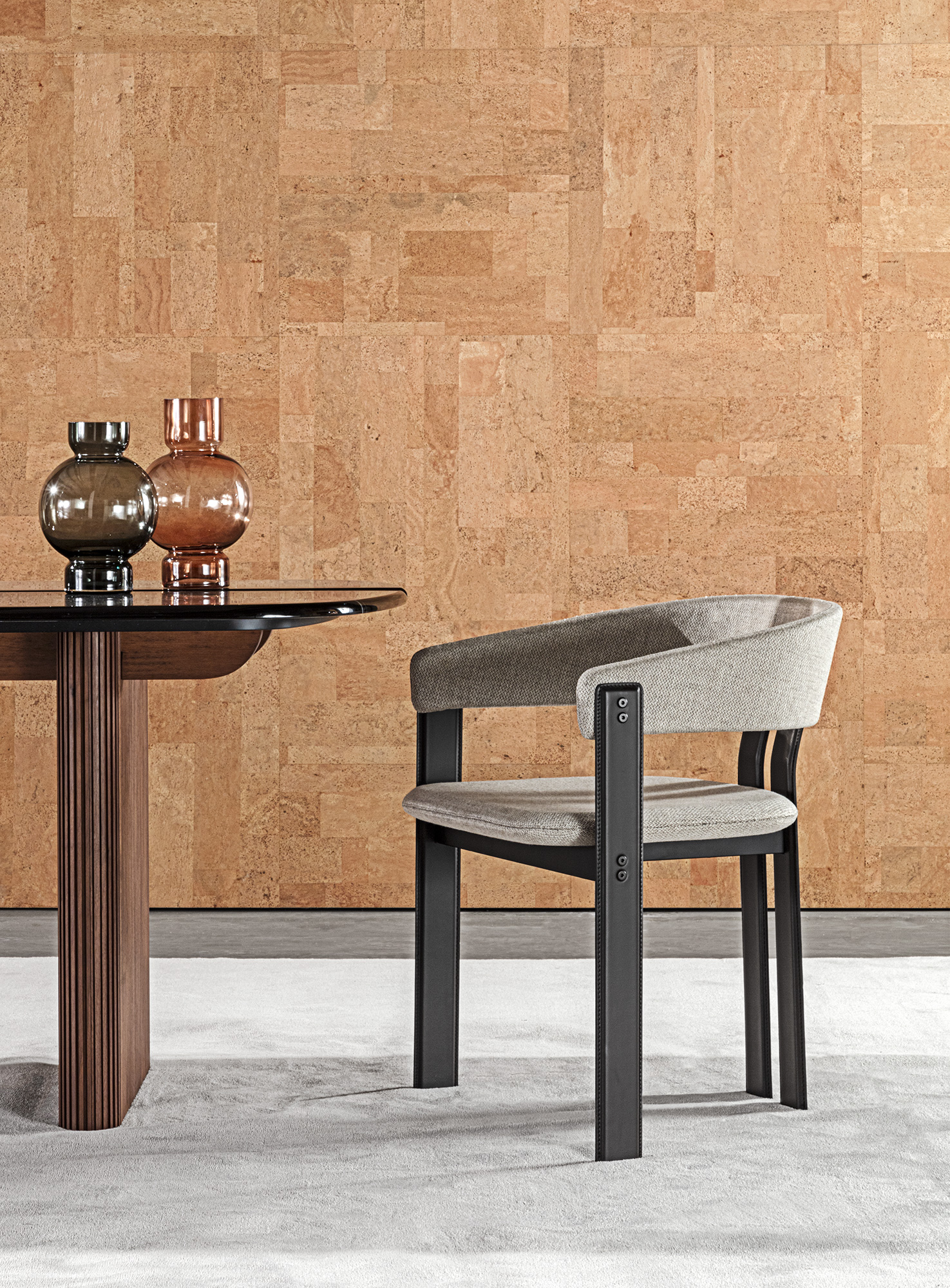 The Igea chair stands out for its bold shapes and finishes. The angular yet rounded structure is coated entirely in leather, an austere but mouldable material. A play of contrasts for high-profile ambiances.