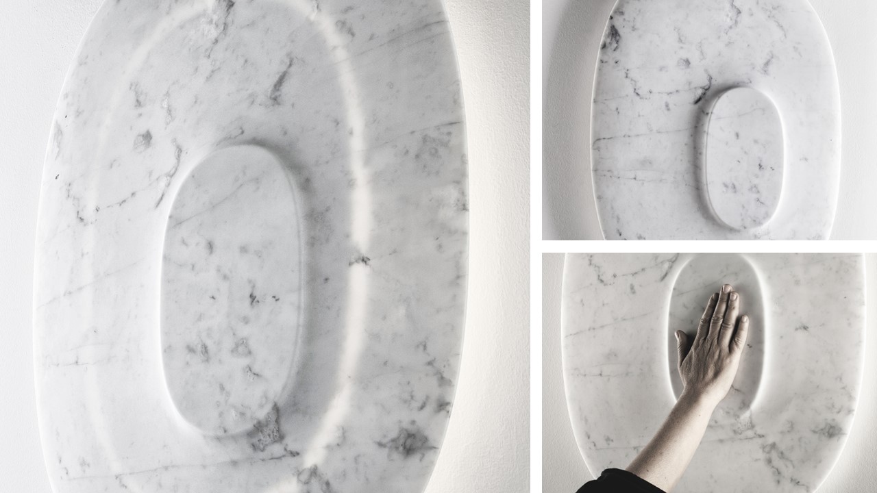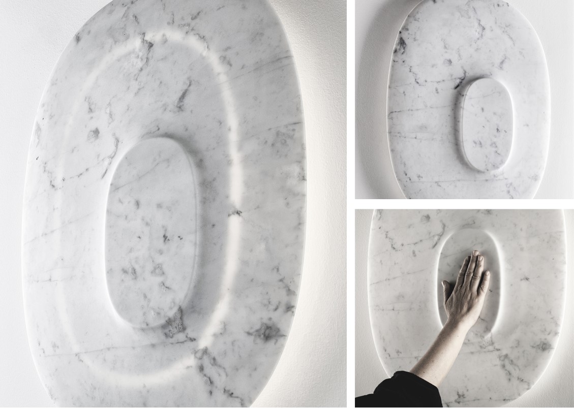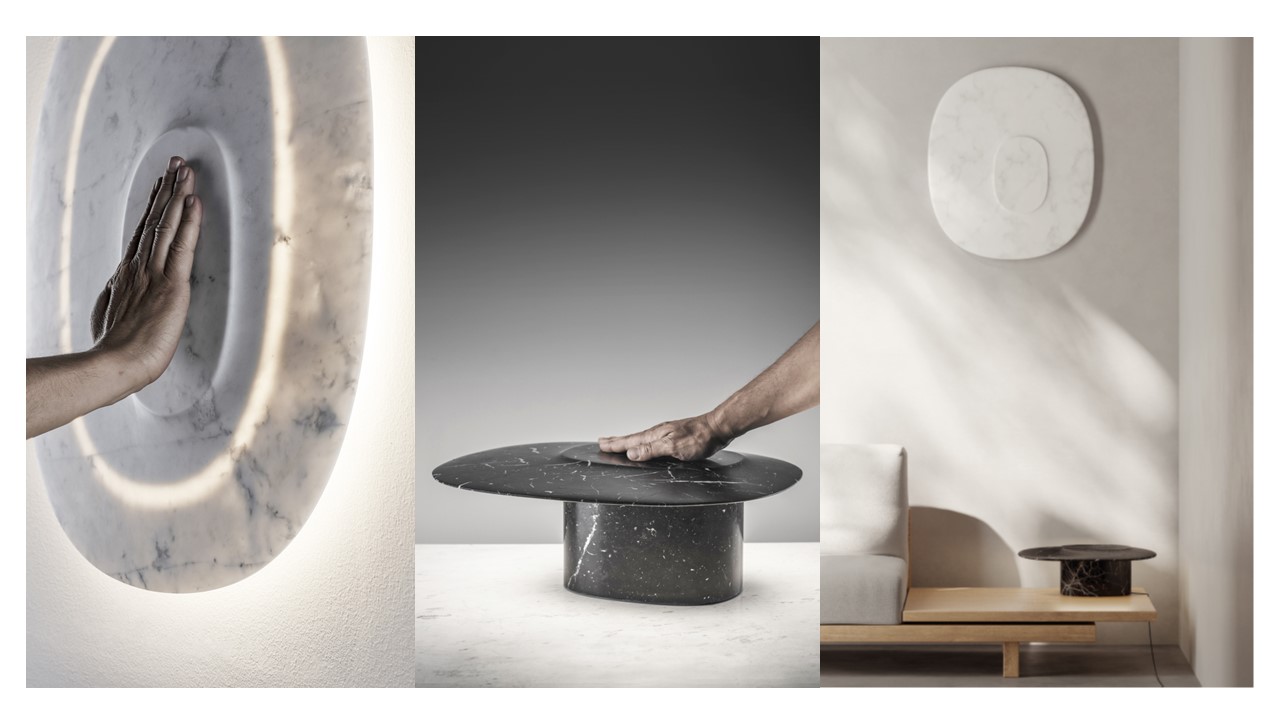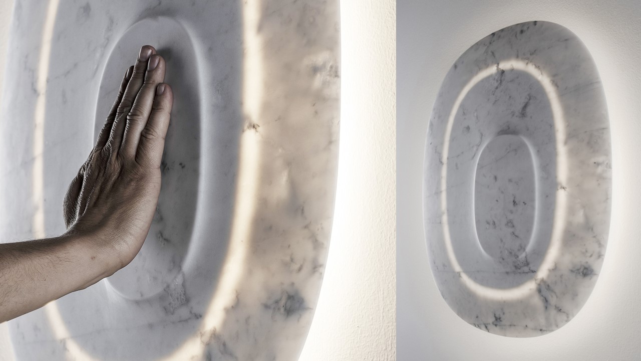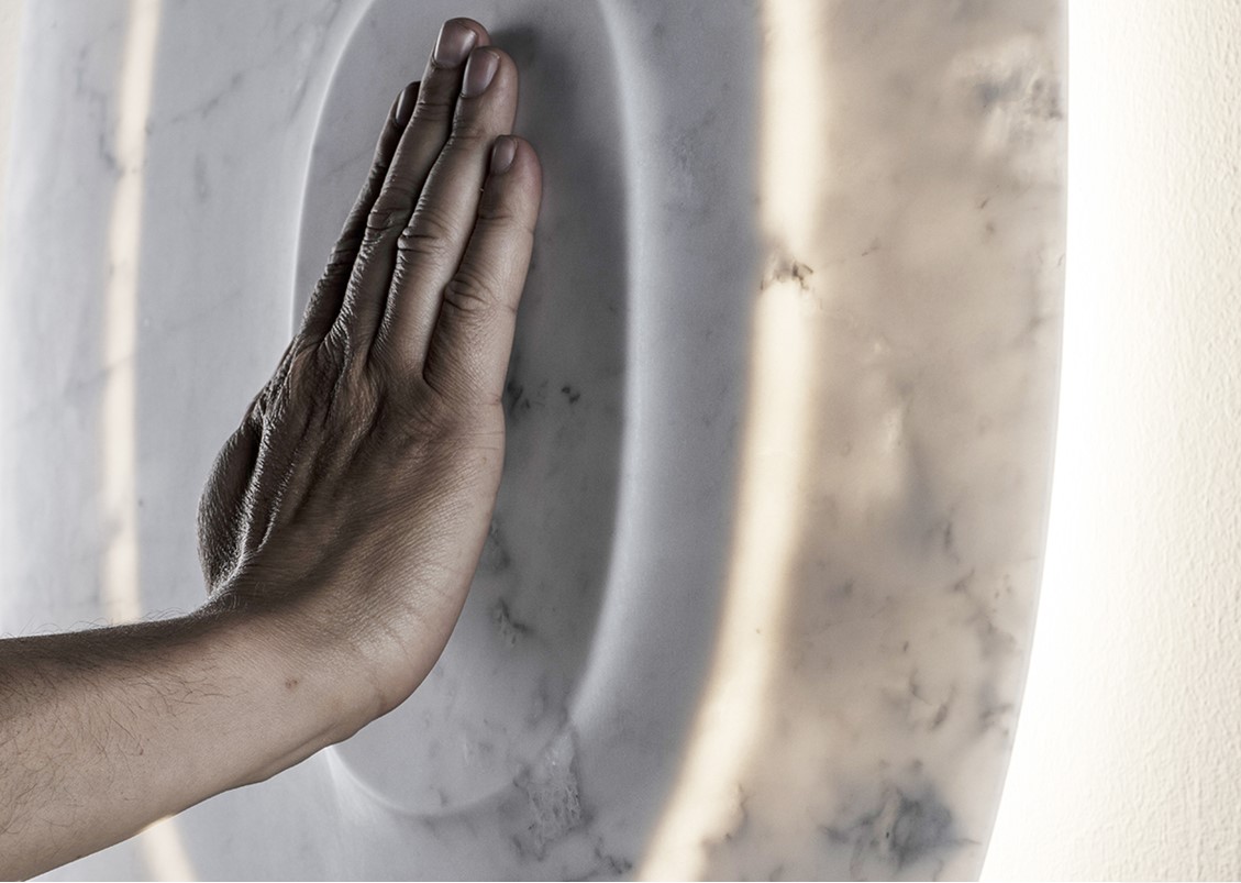 Light through stone. Consisting of a wall lamp + table lamp with a sculptural shape in which, simply by touching the marble surface with the hand, it is possible to switch on, off and modulate the intensity of the light source. This series, is so named in homage to the small rounded