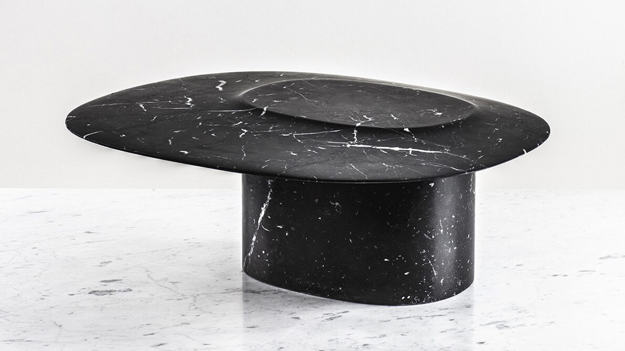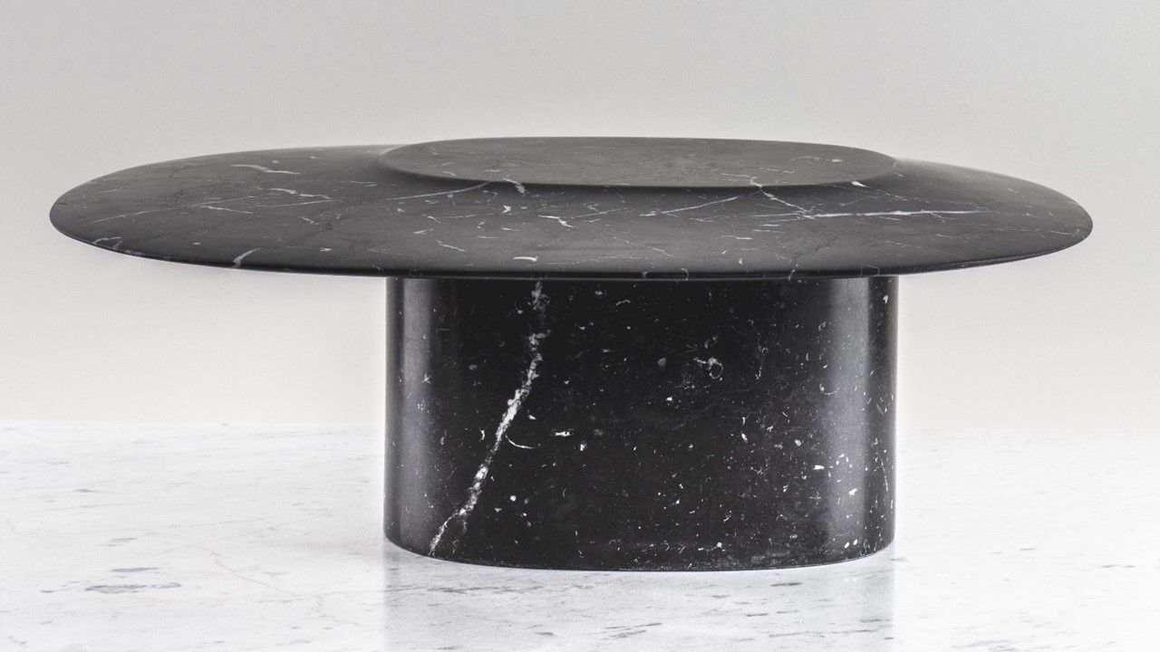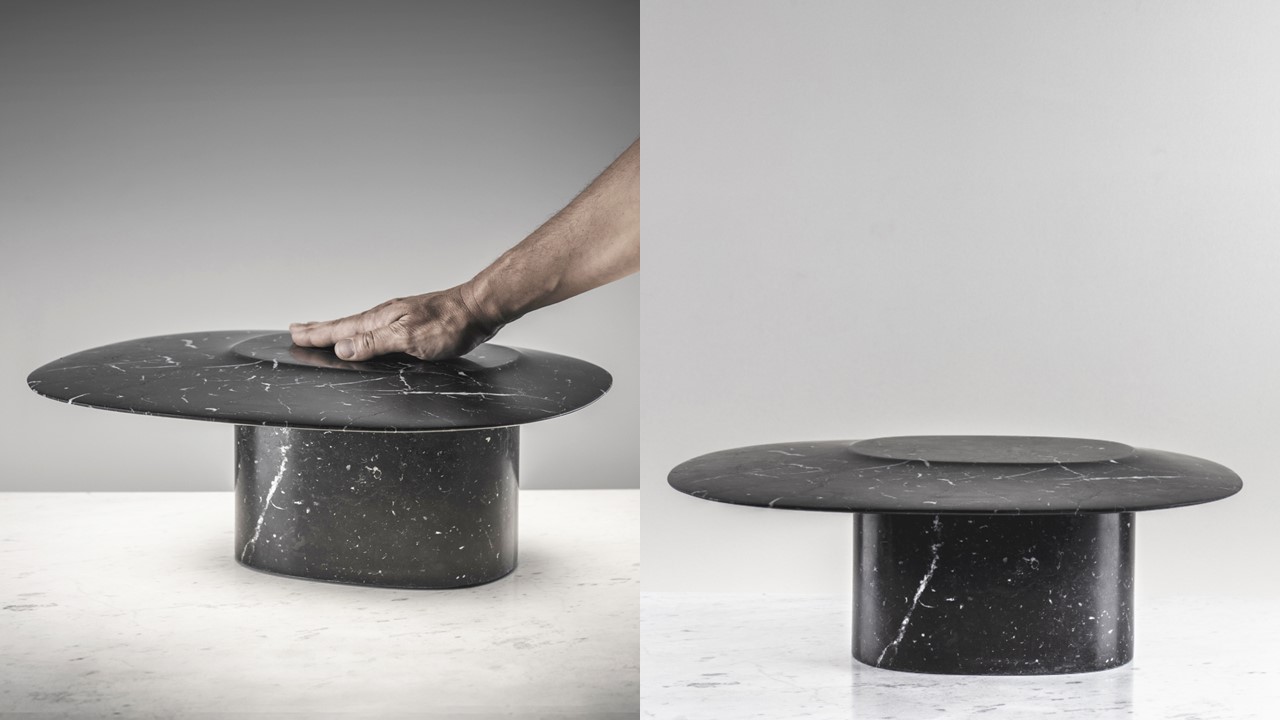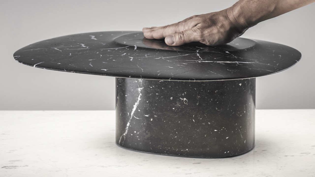 island on the Ionian coast of Sicily. The table version consists of two parts, both CNC-cut and hand-finished in all their details: a solid base with a curved section that supports a thin cnc-sculpted cap on which there is a slightly flat area that invites you to touch. This is a useful gesture for the functioning of the object but also to appreciate every time the stone, a precious natural material of excellence.