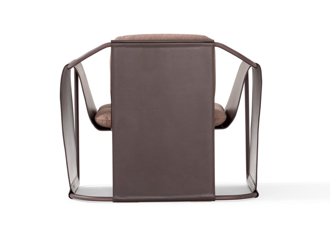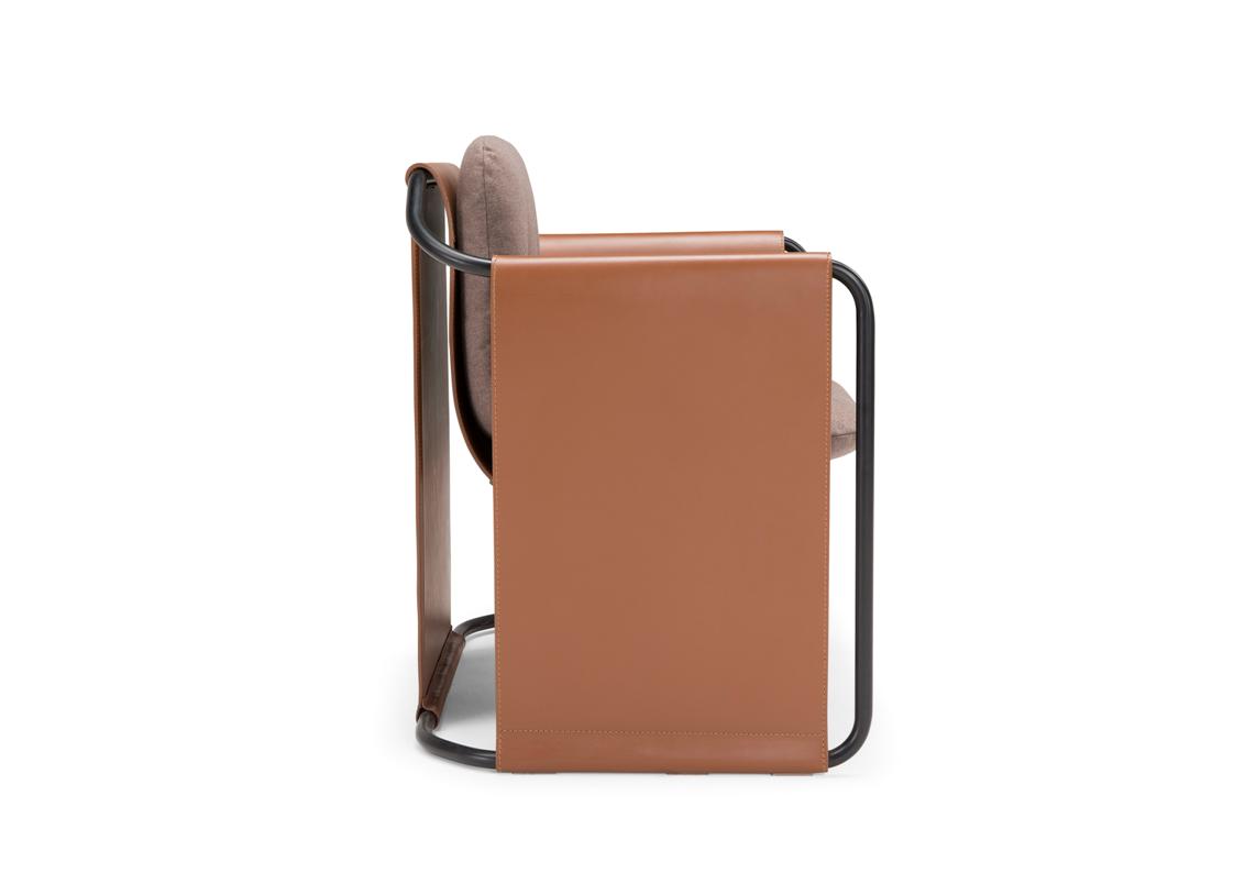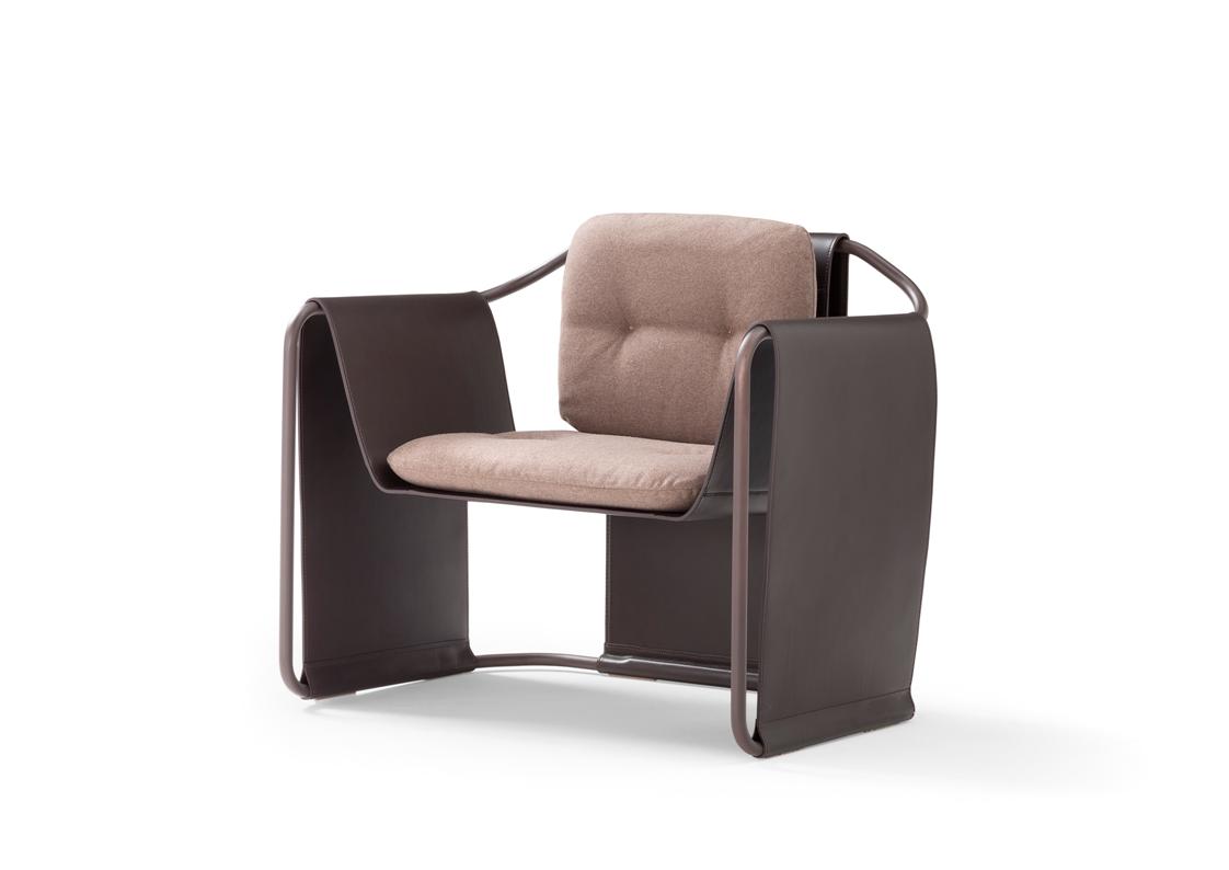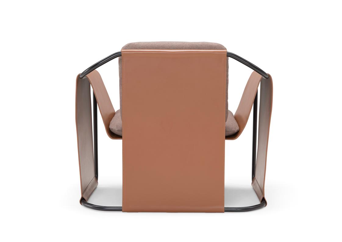 Kimono is an elegant armchair with armrests made up of two elements: a tubular metal structure and leather upholstery. The metal tube draws the structure, the leather dresses it, hiding some parts, showing others: it defines the seat and the backrest, rests on the armrests and falls, stretched down to the ground, like the long sleeves of a kimono. Soft fabric cushions guarantee the necessary comfort. Suitable for both residential and commercial environments.