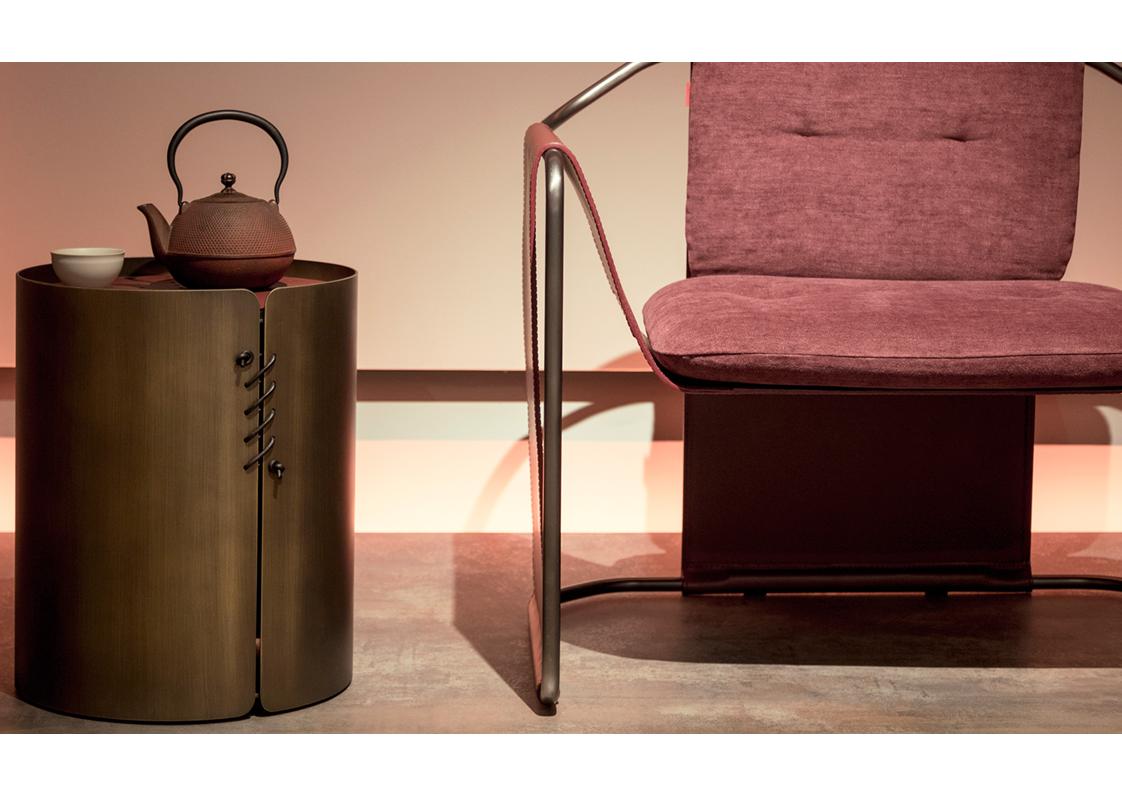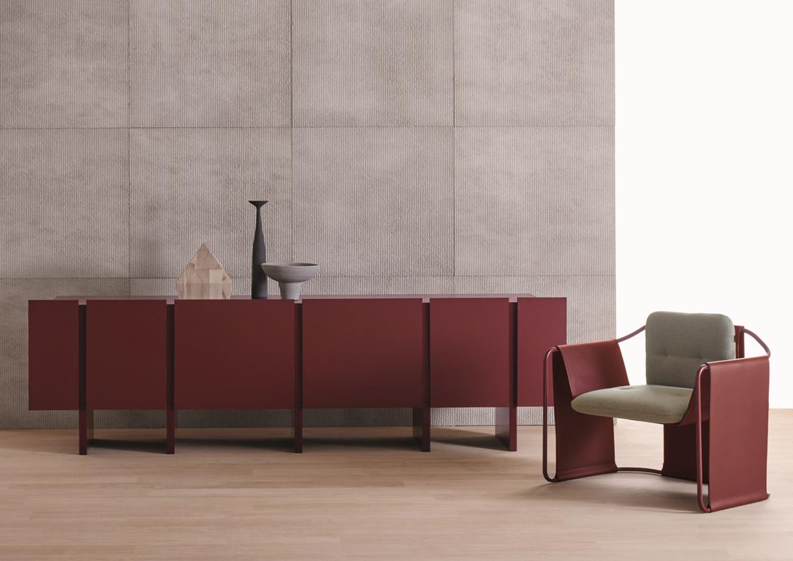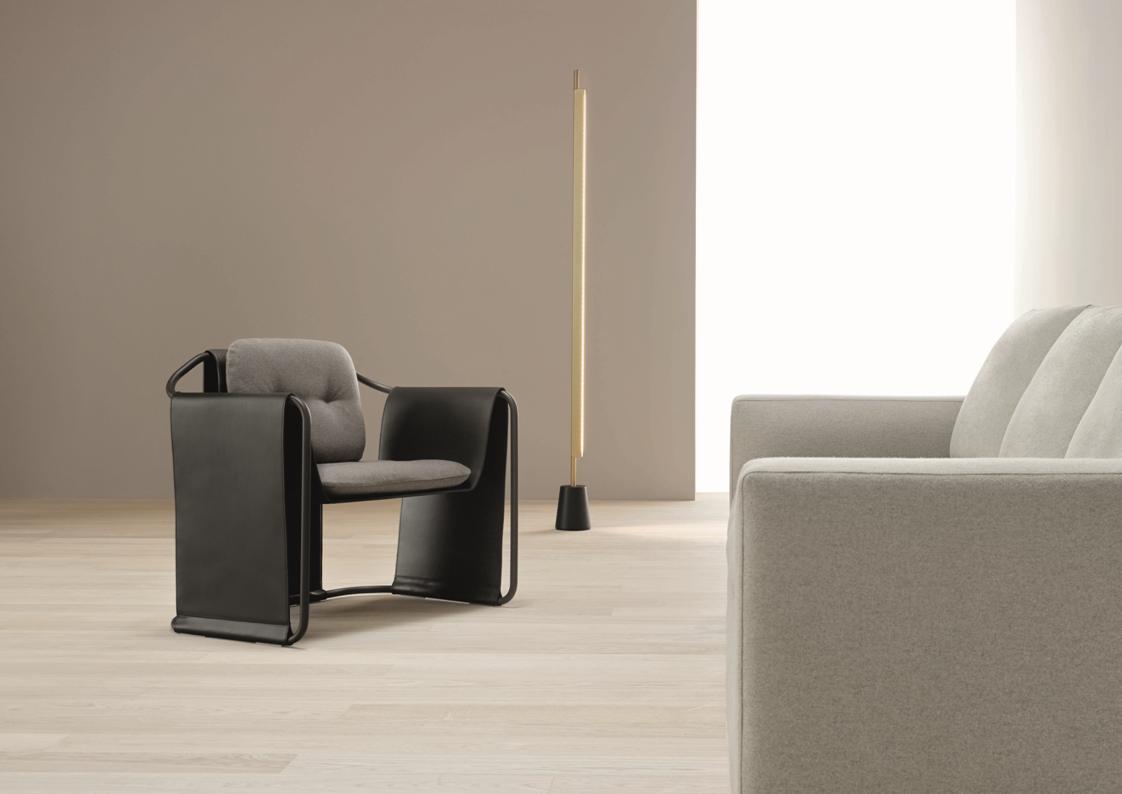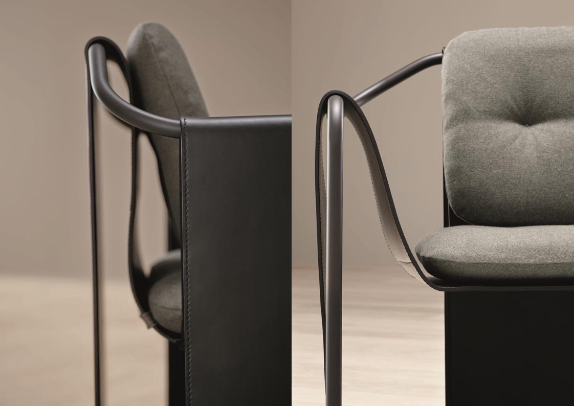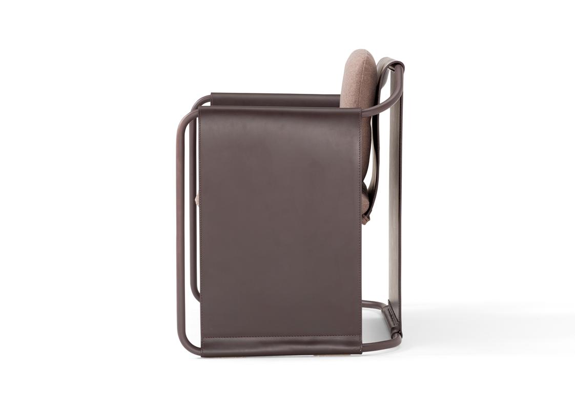 Kimono is an elegant armchair with armrests made up of two elements: a tubular metal structure and leather upholstery. The metal tube draws the structure, the leather dresses it, hiding some parts, showing others: it defines the seat and the backrest, rests on the armrests and falls, stretched down to the ground, like the long sleeves of a kimono. Soft fabric cushions guarantee the necessary comfort. Suitable for both residential and commercial environments.