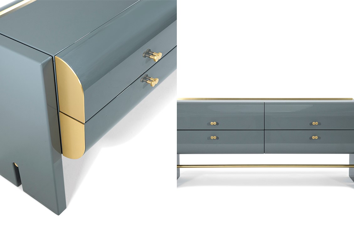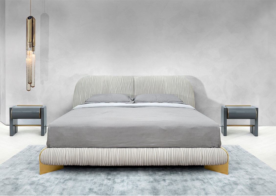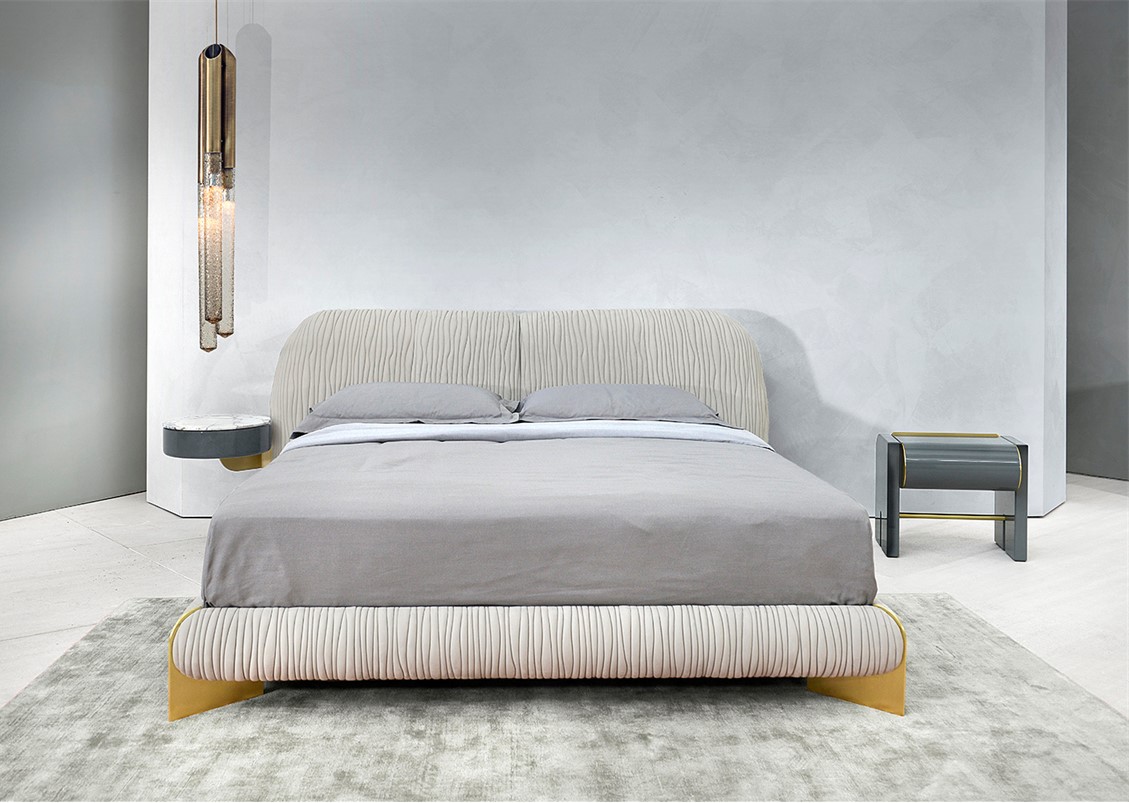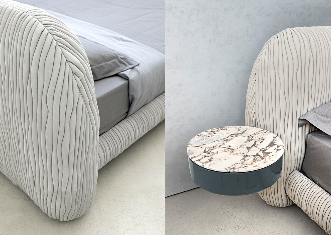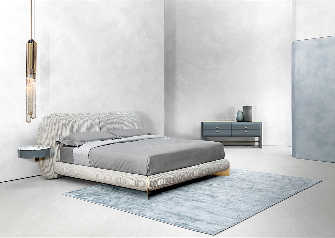 The Leaf Bed is characterized by a wavy patterned embroidery that covers the entire surface, enhancing the sinuosity of its shape. The metal details that support the bed frame give a touch of elegance + uniqueness. This bed is available completely upholstered in leather or quilted fabric – available with or without optional cantilevered nightstands. Also shown with the Oscar Series Nightstand + Dresser