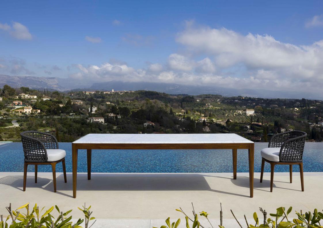 The Lungo Outdoor Series is a sophisticated offering – constructed of Iroko wood, metal structure, rope interlacing and special waterproof upholstery making it suitable for any weather situation. The delicate and harmonious lines, paired with the handsome and sturdy materials make for an elegant and minimal offering. Available in a stationary chaise with woven rope back or a multi-position sunbed. Other pieces in the series include a sofa, lounge chair, and dining chair. Shown with Dodge Dining Table in Iroko + Marble