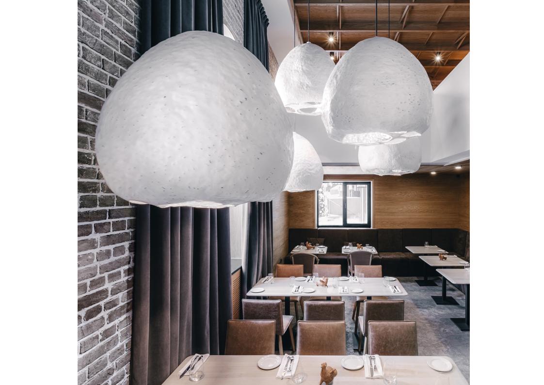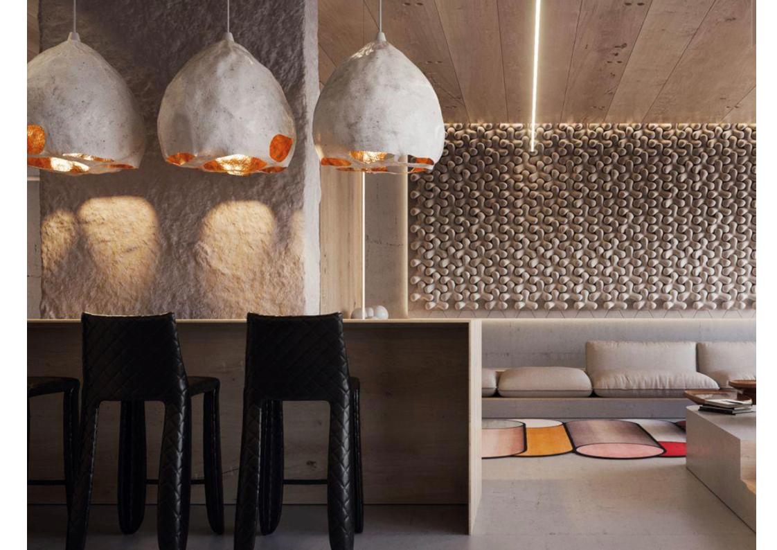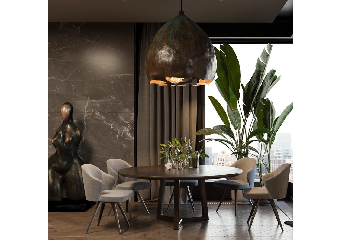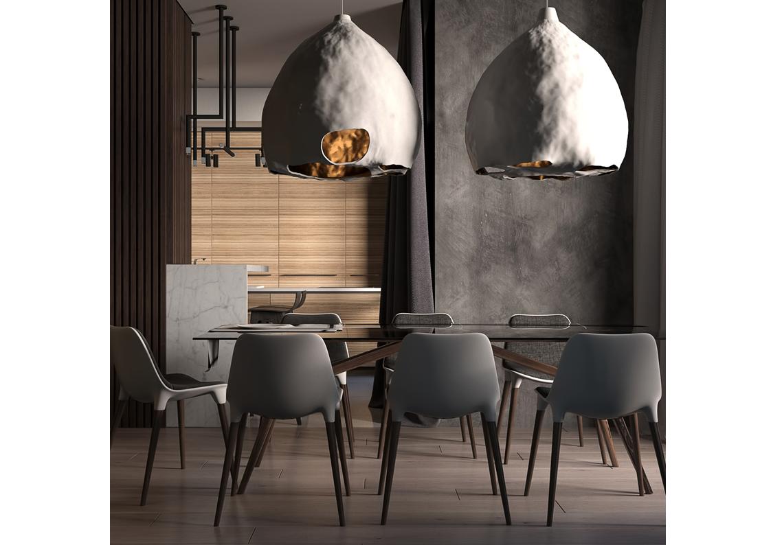 MAKIVKA looks as though it grows out of the ceiling – a unique and organic lighting fixture that is as much art as functional lighting. Constructed of ceramic, copper with the sometimes magical and luxurious touch of gold leaf. Each piece is random and unique creating a silky light emanating from the rough random holes.