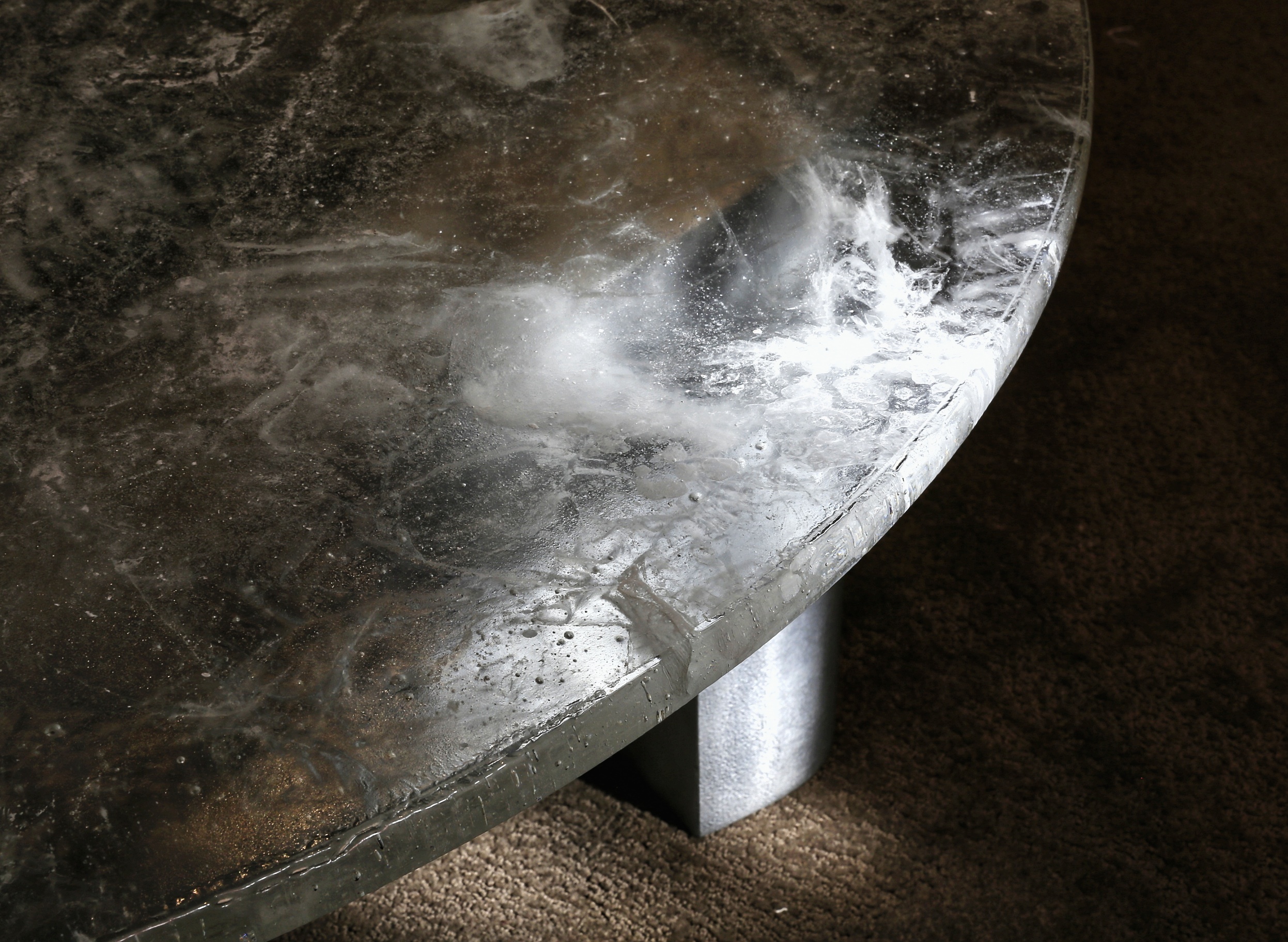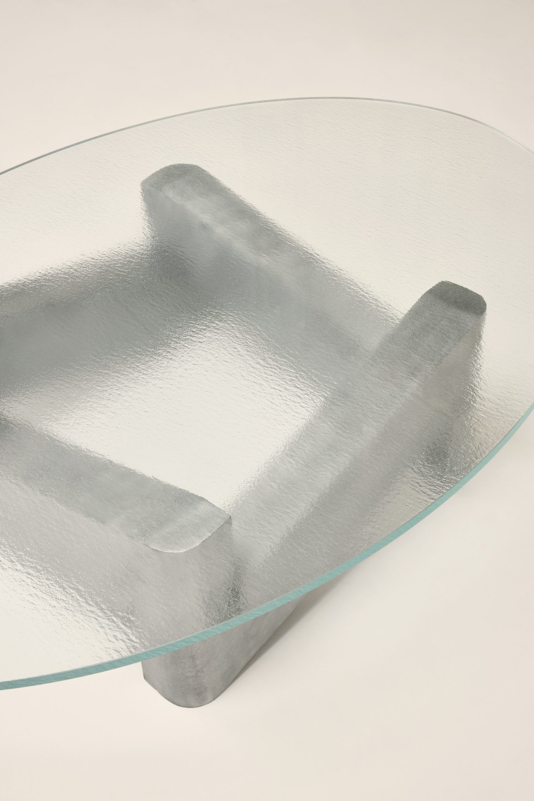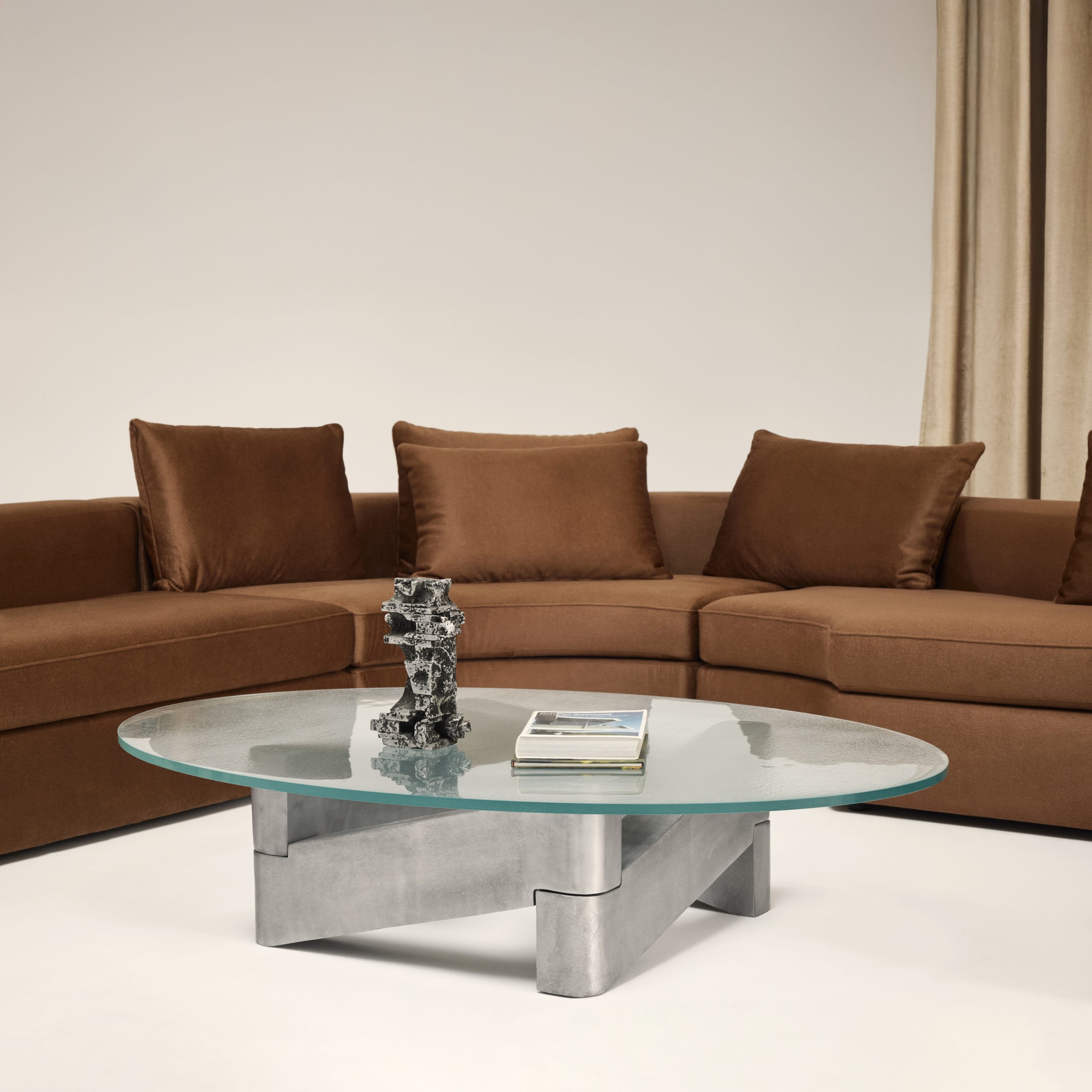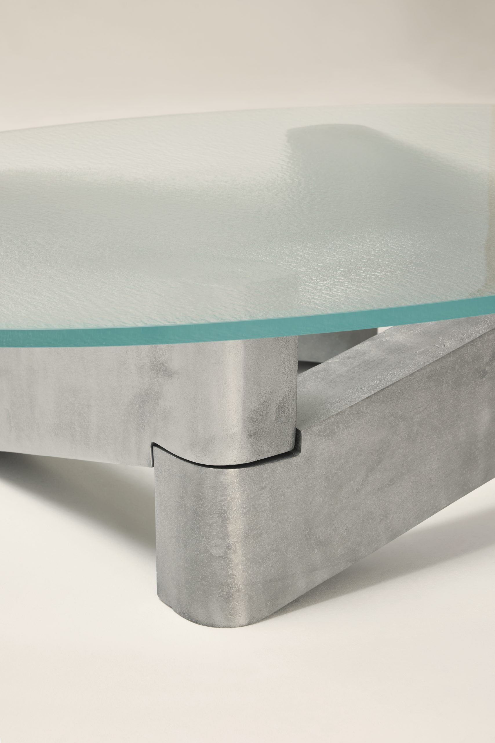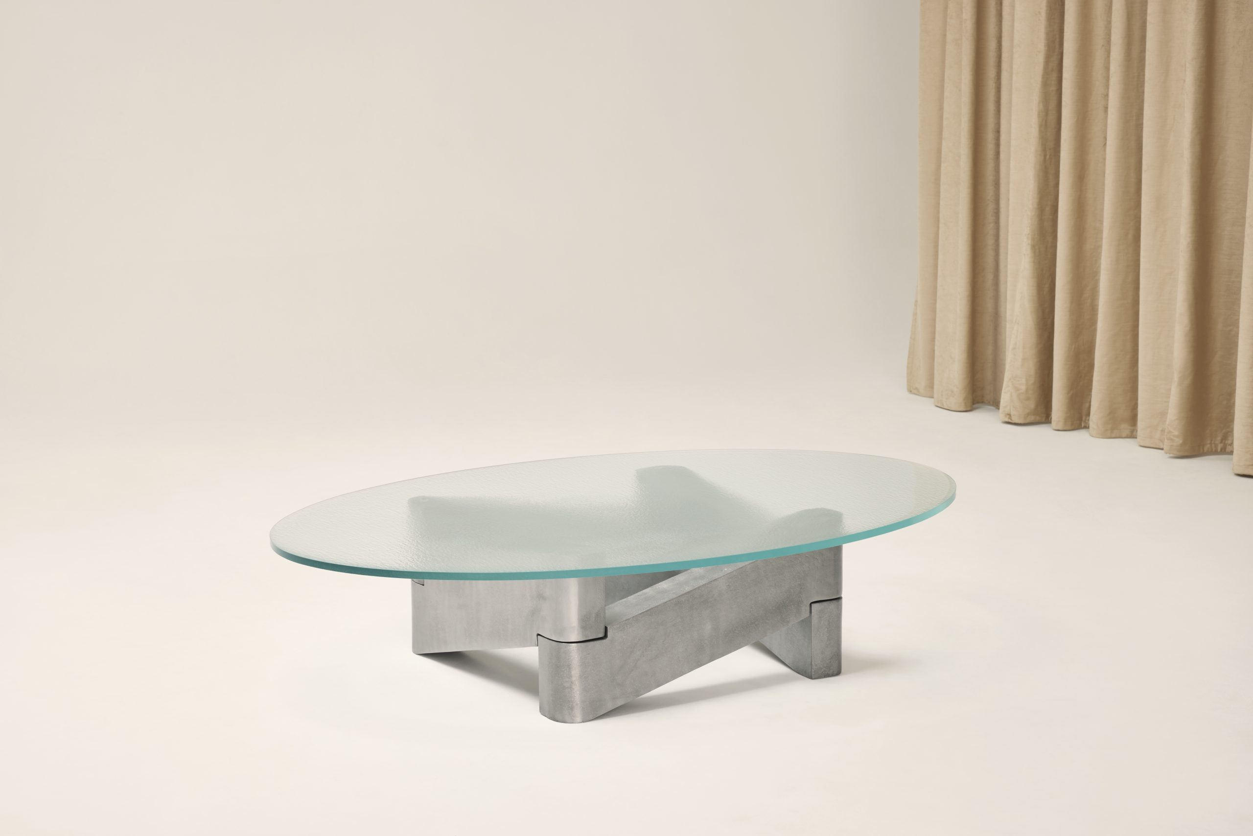 The Marfa coffee table serves as a sculptural centerpiece that combines robust materials with a sense of visual lightness through its carefully balanced forms. Designed by Anthony Guerrée, the Marfa table pays tribute to the work of Donald Judd, particularly his iconic use of minimal, repeated shapes to explore volume and negative space. Its name references Marfa, Texas, a remote desert town where Judd relocated in 1971 and established a lasting center for minimalist art. The Marfa coffee table features a base made of large, intersecting aluminum beams arranged diagonally. This complex yet stable base contrasts beautifully with the softness and fluidity of the blurred glass top.