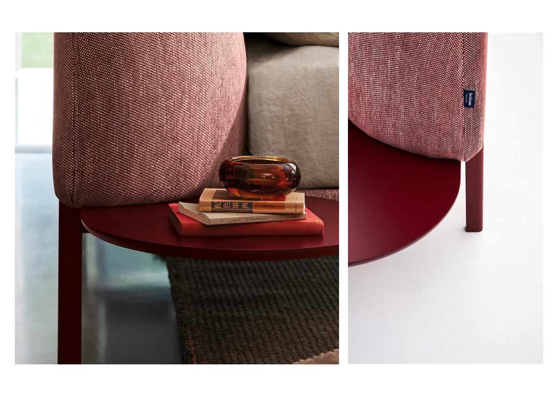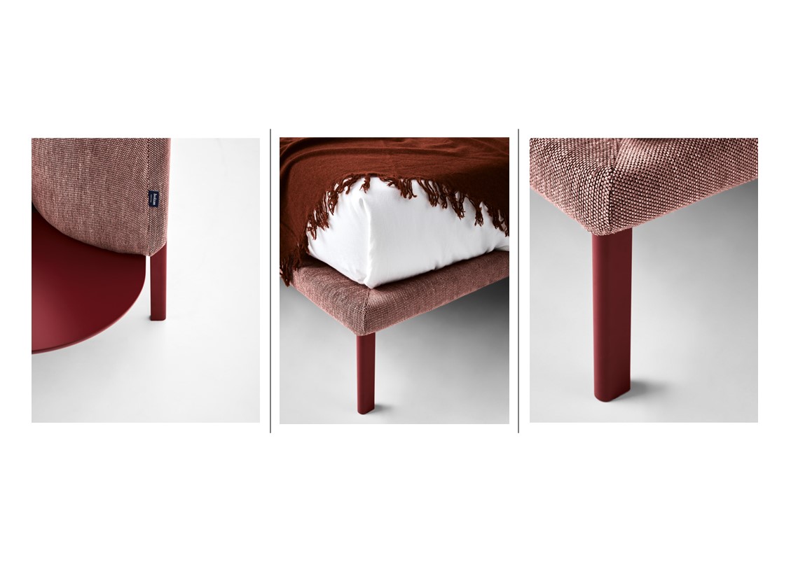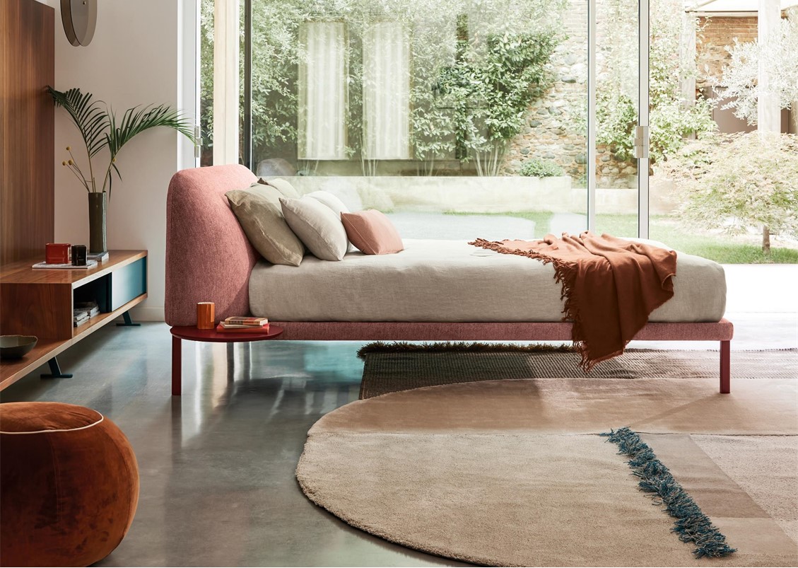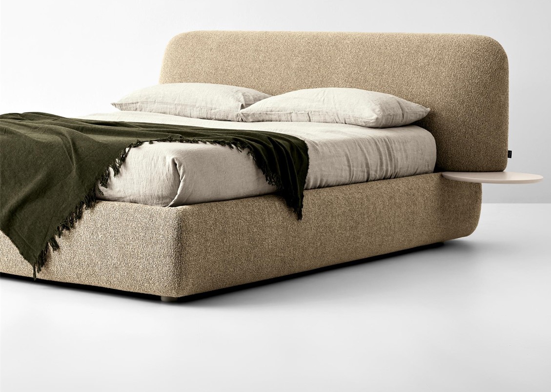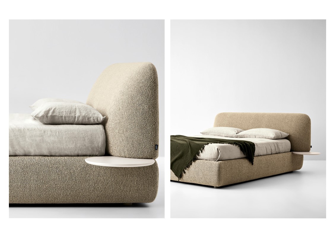 A bed that tells the story of how we and our homes have changed. The padded headboard, generous and soft like the back of a sofa, reminds us that the bedroom is no longer just a room for sleeping, but a space to be lived all day long between a book, a computer, or a cup of coffee: working tools and relaxing companions to be stored in the special side tray that becomes a comfortable support surface. Available in elevated leg or floor version – please specify when ordering