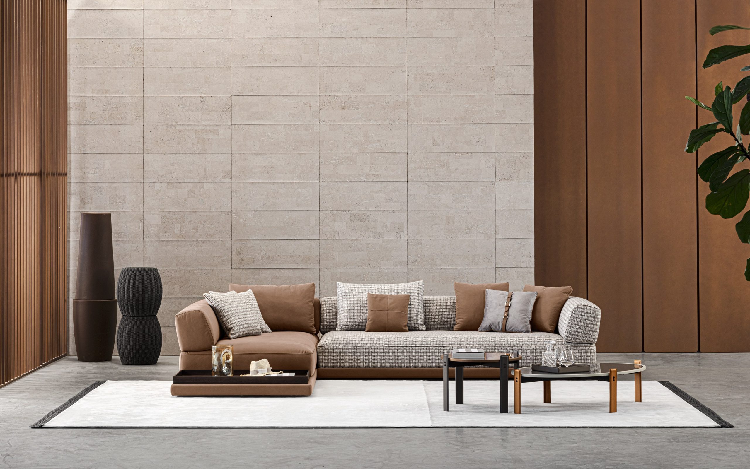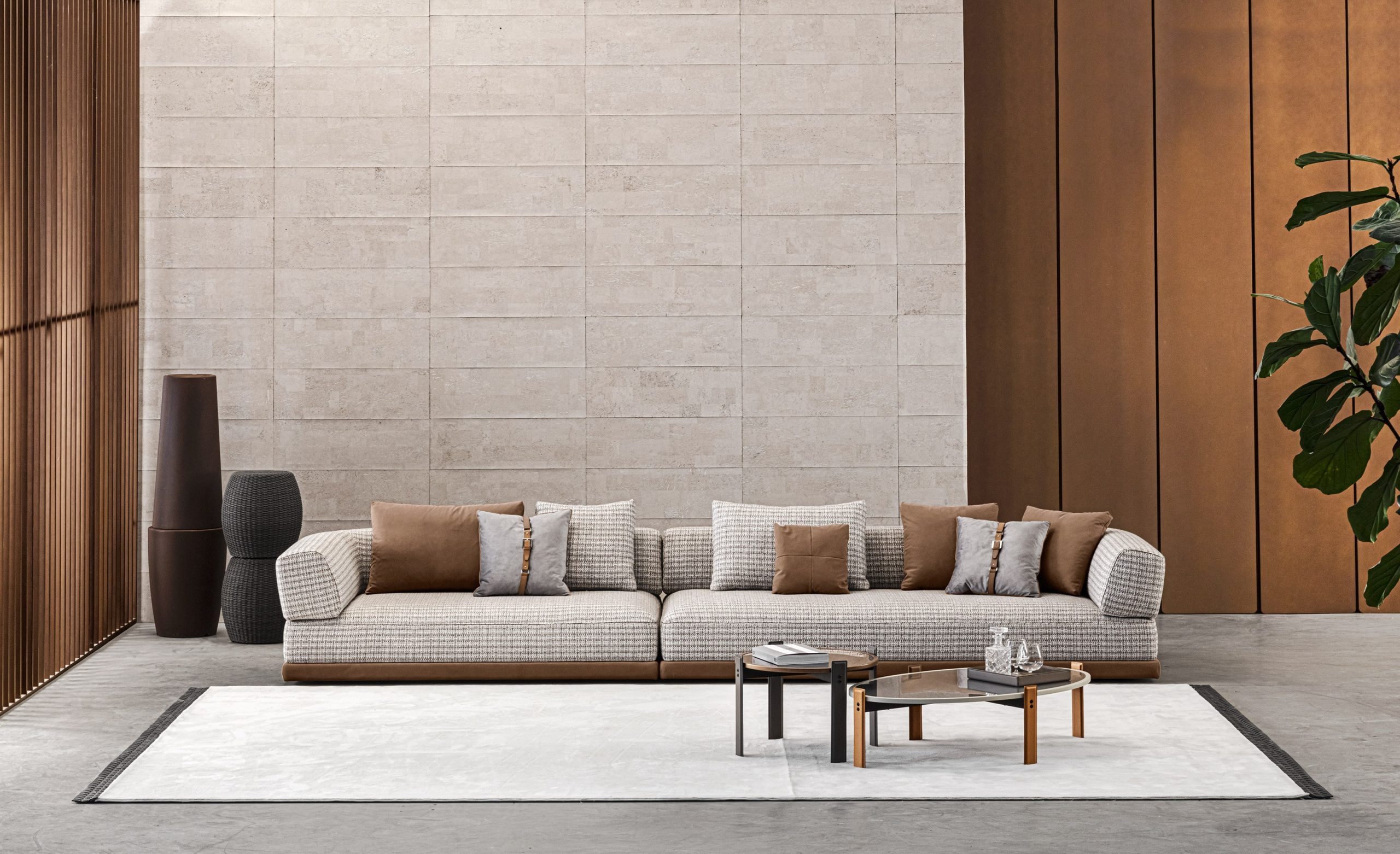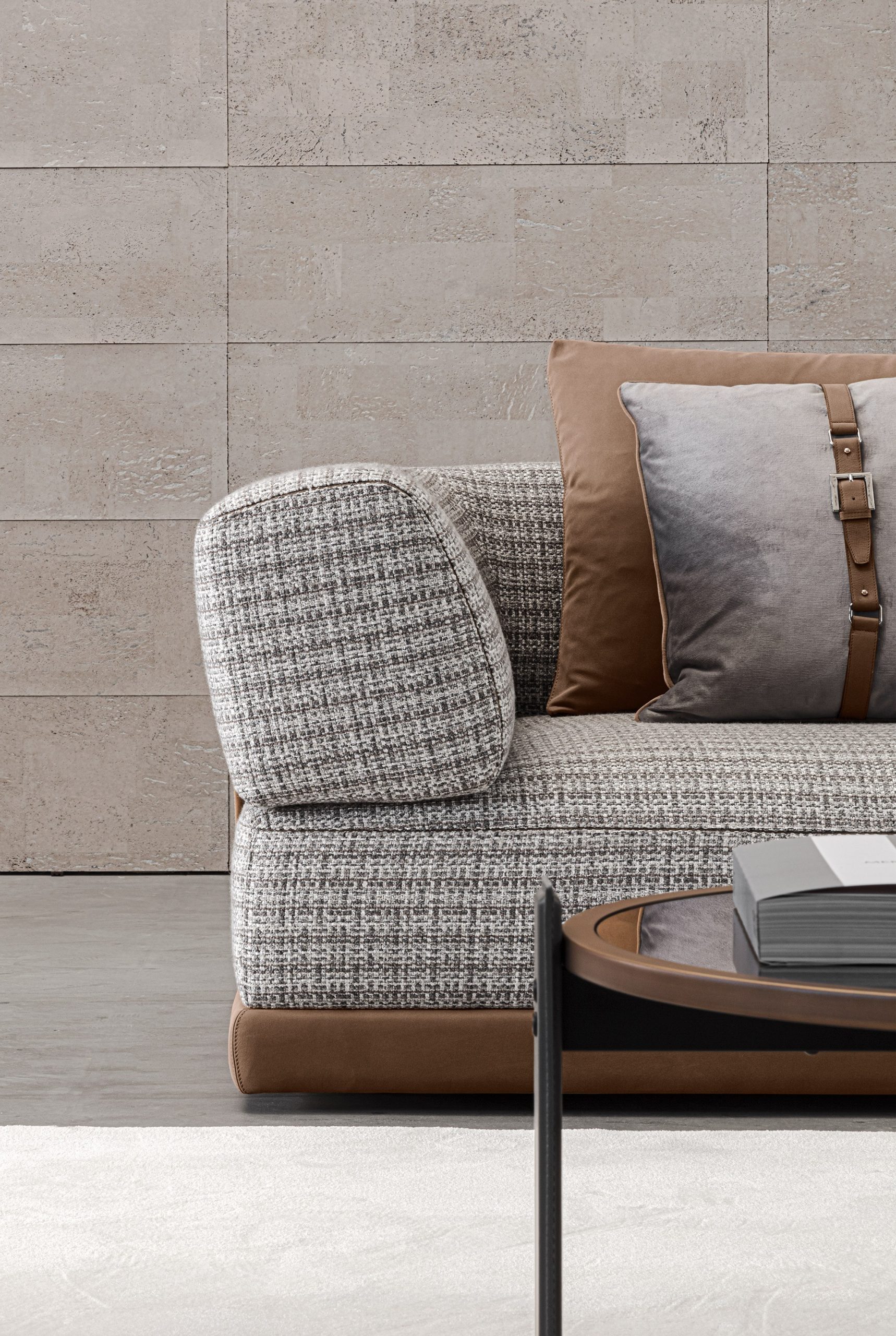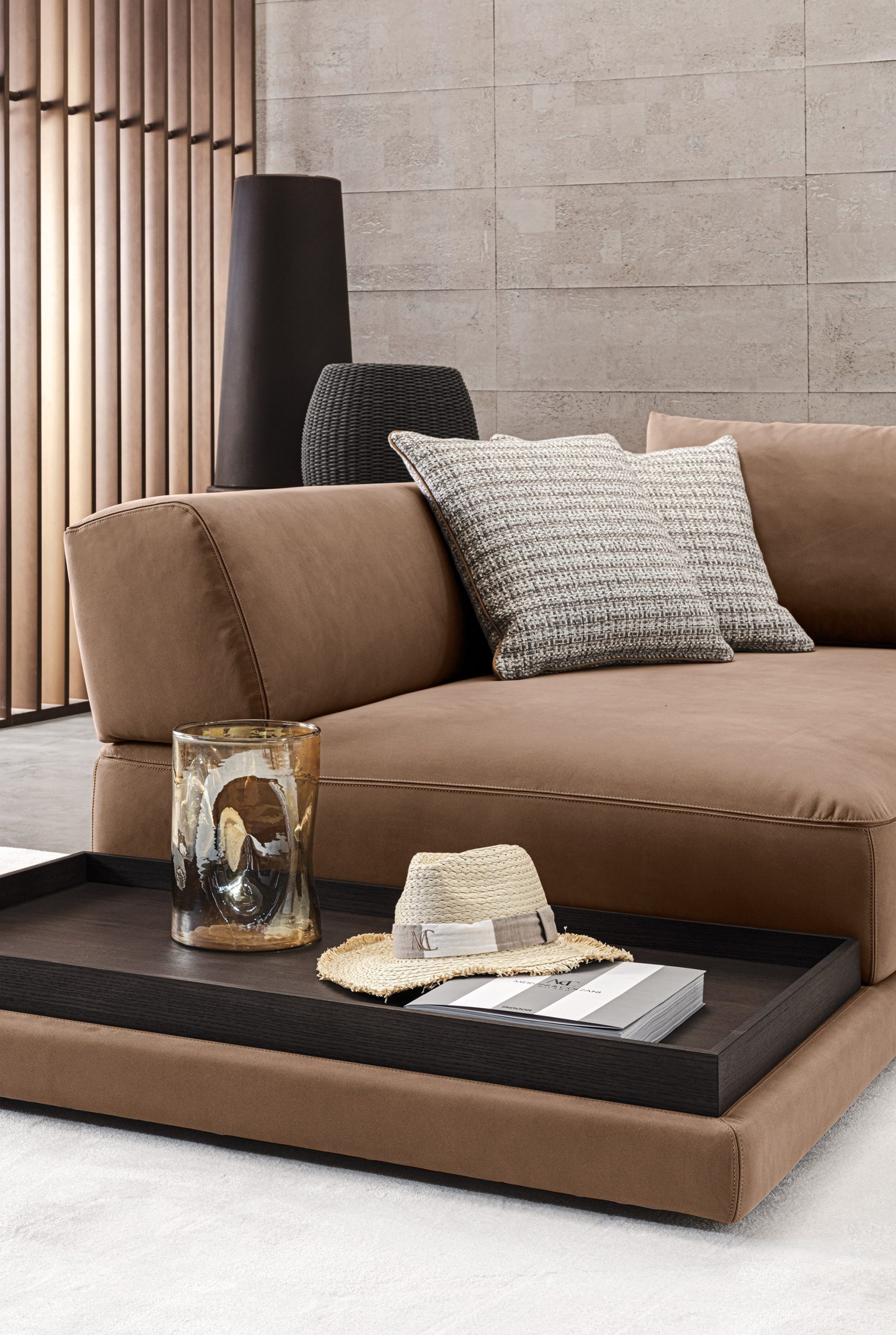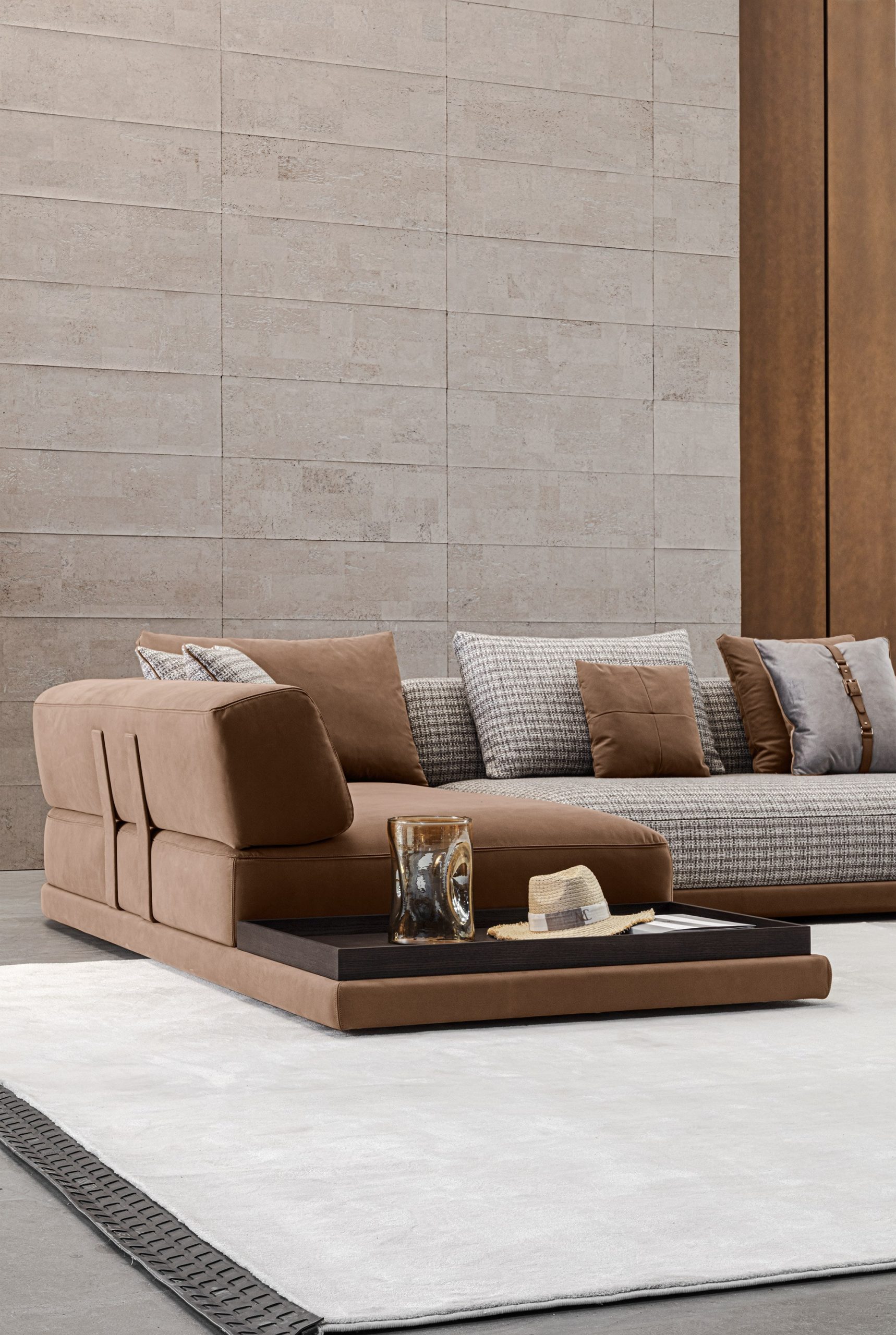 The Mediterraneo sofa comprises a leather base, a soft seat, and a rounded structure that acts as a backrest and armrest. The sofa features leather-covered metal designer elements that support the entire structure while lending it a distinctive character. The Mediterraneo sofa is available in a variety of finishes and sizes, and also features modules with a built-in side table.