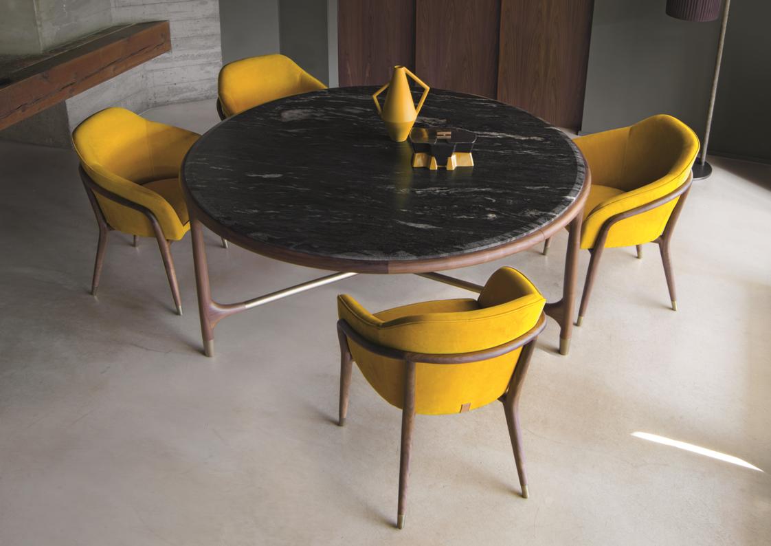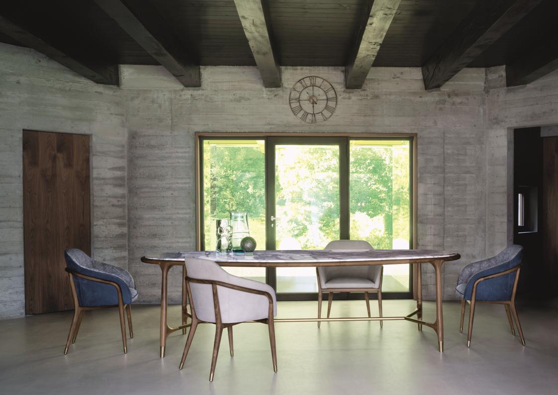 The Melodie Dining Chair is an elegant chair in Italian fabric or leather with a solid wood outer frame available in walnut, ashwood or oak – finished with end caps in bronze finished steel.
