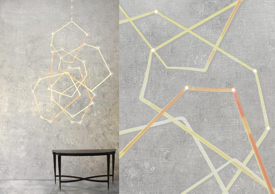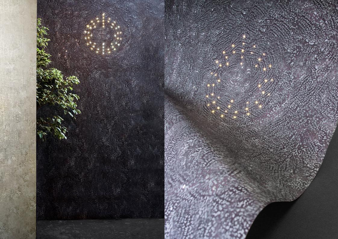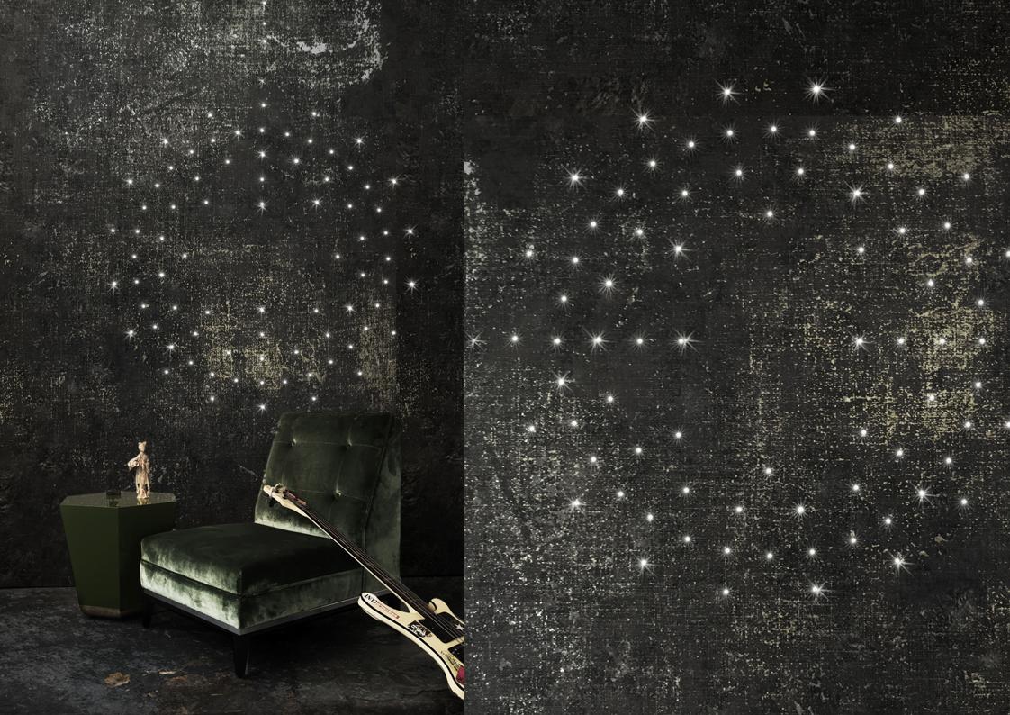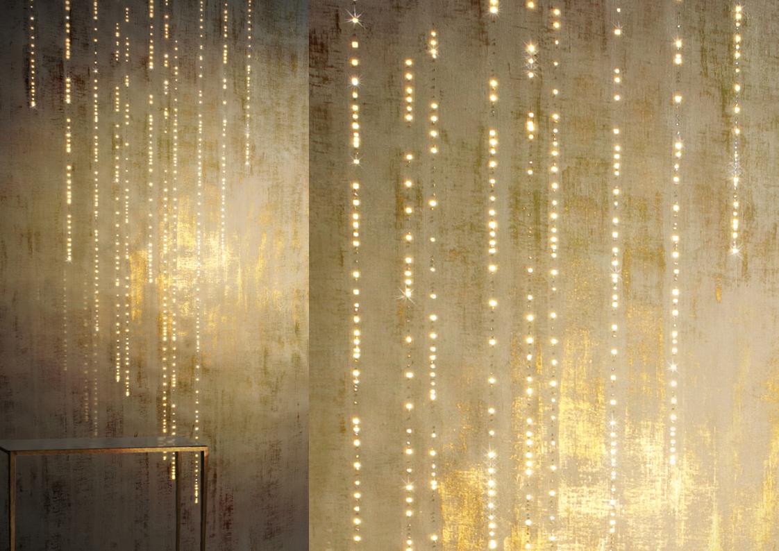 The Meystyle Swarovski Crystal + LED Wallpaper Collection is an elegant and opulent wallcovering option that incorporates the use of Swarovski crystal and embedded LED lights to create a spectacular stand-out wall installation. The Conductivity collection is a celebration of the ubiquitous yet mysterious power of electricity. The designs dig into the infinitesimal world of the atom and its scientific representation as a source of visual inspiration –  the collection echoes its fascination with nature also in its choice of materials, ranging from refined linens and cotton canvases to elegant silks. A variety of metal accents, notably electricity’s best companions enrich the natural properties of each texture with hand-painted details and gilded applications.