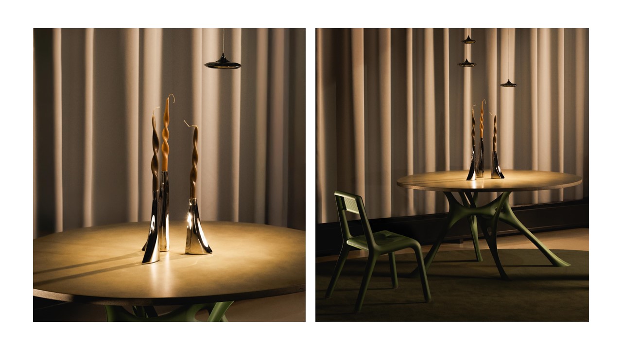 The MORPH Dining Table draws inspiration from the evolving geometry of tree branches — fluid, organic, and intelligently optimized. Its sculptural legs rise from a single support point, branching gracefully into the tabletop in a seamless flow of form and function. The interlocking geometry enhances structural integrity while maintaining a sleek, minimal aesthetic. Subtle openings create visual intrigue, echoing the efficiencies of nature and lending the piece both lightness and strength.