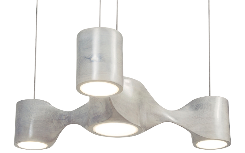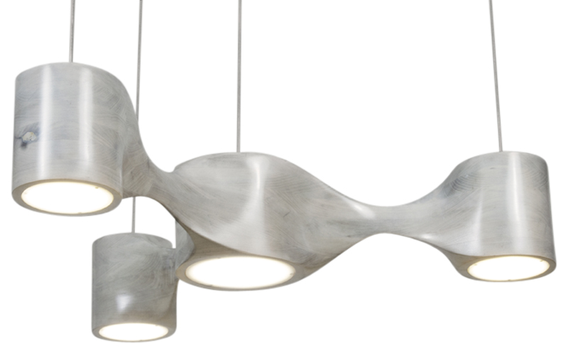 The N-3 Chandelier is a rotationally-symmetrical, hand-sculpted pendant lamp with a solid wood body – gold or silver leafing on interior of lamp housing is available. The fixture is suspended via lamp wires from a 3-armed canopy (36” dia.), mounted directly to junction box